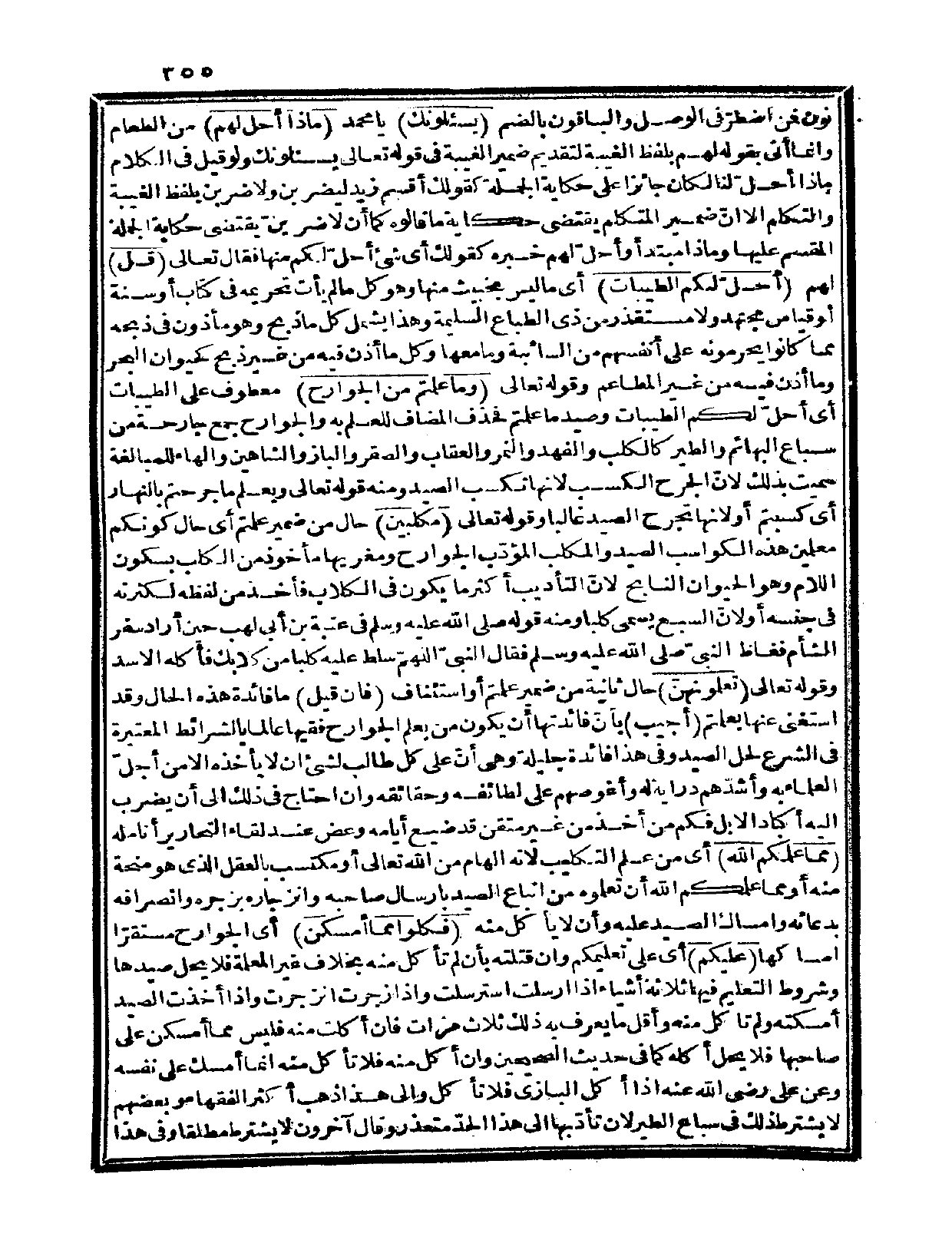 فإن قيل: ما فائدة هذه الحال وقد استغنى عنها بعلمتم؟ أجيب: بأنّ فائدتها أن يكون من يعلم الجوارح فقيهاً عالماً بالشرائط المعتبرة في الشرع لحل الصيد، وفي هذا فائدة جليلة وهي أنّ على كل طالب لشيء أن لا يأخذه إلا من أجلّ العلماء به وأشدّهم دراية له وأغوصهم على لطائفه وحقائقه، وإن احتاج في ذلك إلى أن يضرب إليه أكباد الإبل فكم من أخذ من غير متقن قد ضيّع أيامه وعض عند لقاء التحارير أنامله {مما علمكم الله} أي: من علم التكليب لأنه إلهام من الله تعالى أو مكتسب بالعقل الذي هو منحة منه أو مما علمكم الله أن تعلموه من اتباع الصيد بإرسال صاحبه وانزجاره بزجره وانصرافه بدعائه وإمساك الصيد عليه وأن لا يأكل منه. {فكلوا مما أمسكن} أي: الجوارح مستقرّاً إمساكها {عليكم} أي: على تعليمكم وإن قتلته بأن لم تأكل منه بخلاف غير المعلّمة فلا يحل صيدها وشروط التعليم فيها ثلاثة أشياء: إذا أرسلت استرسلت، وإذا زجرت انزجرت، وإذا أخذت الصيد أمسكته ولم تأكل منه، وأقل ما يعرف به ذلك ثلاث مرات فإن أكلت منه فليس مما أمسكن على صاحبها فلا يحل أكله كما في حديث الصحيحين، وإن أكل منه فلا تأكل، منه إنما أمسك على نفسه. وعن علي رضي الله تعالى عنه: إذا أكل البازي فلا تأكل وإلى هذا ذهب أكثر الفقهاء وبعضهم لا يشترط ذلك في سباع الطير؛ لأن تأدبها إلى هذا الحدّ متعذر وقال آخرون: لا يشترط مطلقاً وفي هذا