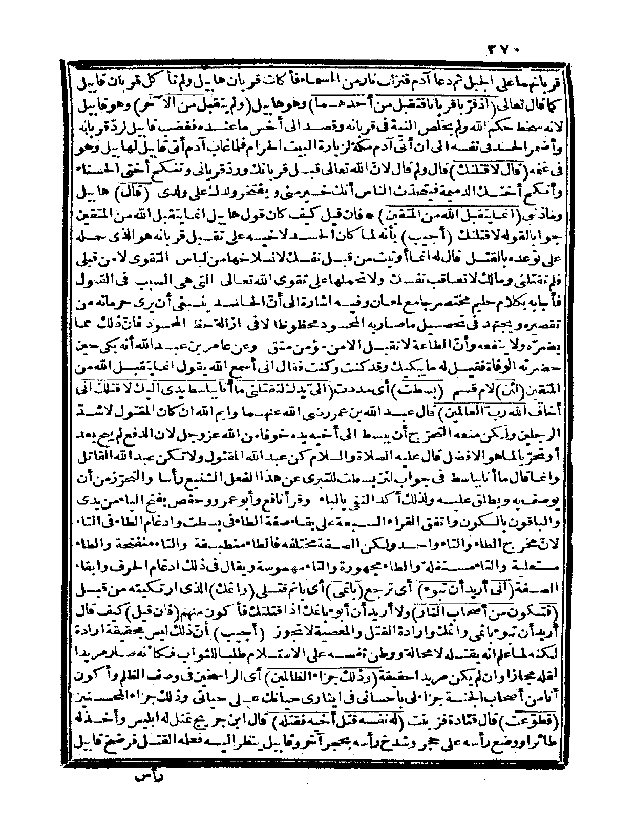 غاب آدم أتى قابيل لهابيل وهو في غنمه {قال لأقتلنك} قال: ولم؟ قال: لأنّ الله تعالى قبل قربانك وردّ قرباني وتنكح أختي الحسناء وأنكح أختك الدميمة فيتحدّث الناس أنك خير مني ويفتخر ولدك على ولدي {قال} هابيل وما ذنبي؟ {إنما يتقبل الله من المتقين} .