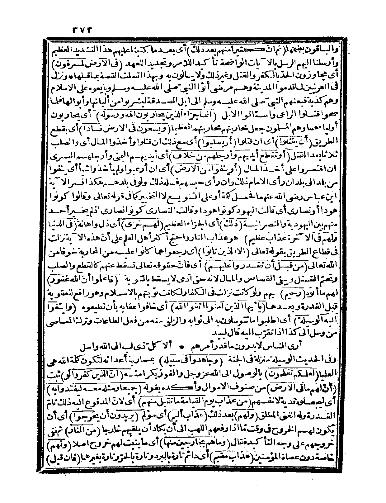 {إنما جزاء الذين يحاربون الله ورسوله} أي: يحاربون أولياءهما وهم المسلمون جعل محاربتهم محاربتهما تعظيماً {ويسعون في الأرض فساداً} أي: بقطع الطريق {أن يقتلوا} أي: إن قتلوا {أو يصلبوا} أي: مع ذلك إن قتلوا وأخذوا المال أي: والصلب ثلاثاً بعد القتل {أو تقطع أيديهم وأرجلهم من خلاف} أي: أيديهم اليمنى وأرجلهم اليسرى إن اقتصروا على أخذ المال {أو ينفوا من الأرض} أي: إن أرعبوا ولم يأخذوا شيئاً أي: ينفوا من بلد إلى بلد إن رأى الإمام ذلك وإن رأى حبسهم فله ذلك ولو في بلدهم، هكذا فسر الآية ابن عباس رضي الله تعالى عنهما فحمل كلمة أو على التنويع لا التخيير كما في قوله تعالى: {وقالوا كونوا هوداً أو نصارى} (البقرة، 135) أي: قالت اليهود: كونوا هوداً وقالت النصارى: كونوا نصارى إذ لم يخيّر أحد منهم بين اليهودية والنصرانية {ذلك} أي: الجزاء العظيم {لهم خزي} أي: ذل وإهانة {في الدنيا ولهم في الآخرة عذاب عظيم} هو عذاب النار واحتج أكثر أهل العلم على أنّ هذه الآية نزلت في قطاع الطريق بقوله تعالى: