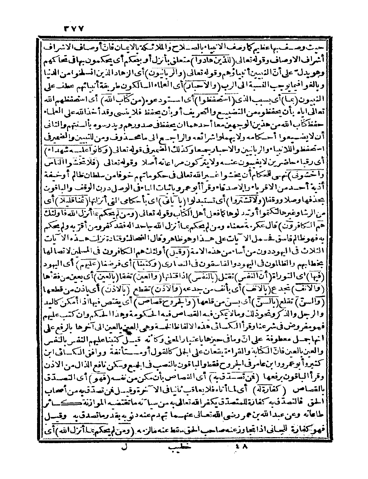 حيث وصف بها عظيم كما وصف الأنبياء بالصلاح والملائكة بالإيمان فإنّ أوصاف الأشراف أشراف الأوصاف وقوله تعالى: {للذين هادوا} متعلق بأنزل أو بيحكم أي: يحكمون بها في تحاكمهم وهو يدلّ على أنّ النبيين أنبياؤهم وقوله تعالى: {والربَّانيون} أي: الزهّاد الذين انسلخوا من الدنيا وبالغولوا فيما يوجب النسبة إلى الرّب {والأحبار} أي: العلماء السالكون طريقة أنبيائهم عطف على النبيون {بما} أي: بسبب الذي {استحفظوا} أي: استودعوه {من كتاب الله} أي: استحفظهم الله تعالى إياه بأن يحفظوه من التضييع والتحريف أو بأن يحفظ فلا ينسى وقد أخذ الله على العلماء حفظ كتاب الله من هذين الوجهين معاً: أحدهما: أن يحفظ في صدورهم ويدرسوه بألسنتهم والثاني: أن لا يضيعوا أحكامه ولا يهملوا شرائعه والراجع إلى ما محذوف، ومن للتبيين والضمير في استحفظوا للأنبياء والربانيين والأحبار جميعاً وكذلك الضمير في قوله تعالى: {وكانوا عليه شهداء} أي: رقباء حاضرين لا يغيبون عنه ولا يتركون مراعاته أصلاً وقوله تعالى: {فلا تخشوا الناس واخشونِ} نهي للحكام أن يخشوا غير الله تعالى في حكوماتهم خوفاً من سلطان ظالم أو خيفة أذية أحد من الأقرباء والأصدقاء، وقرأ أبو عمرو بإثبات الياء في الوصل دون الوقف والباقون بحذفها وصلاً ووقفاً {ولا تشتروا} أي: تستبدلوا {بآياتي} أي: بأحكامي التي أنزلتها {ثمناً قليلاً} أي: من الرشا وغيرها لتكتموا أو تبدلوها كما فعل أهل الكتاب وقوله تعالى: {ومن لم يحكم بما أنزل الله فأولئك هم الكافرون} قال عكرمة: معناه ومن لم يحكم بما أنزل الله