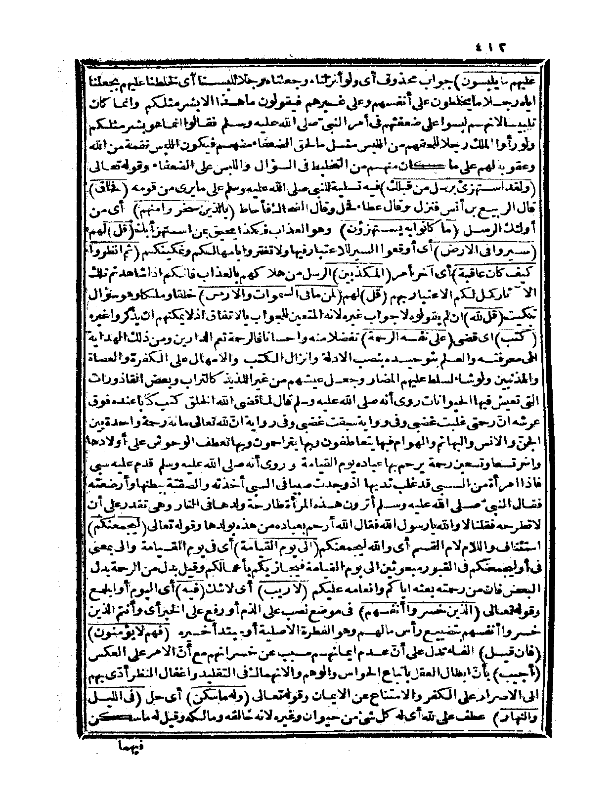 عَلَيْهِم مَّا يَلْبِسُونَ * وَلَقَدِ اسْتُهْزِى?َ بِرُسُلٍ مِّن قَبْلِكَ فَحَاقَ بِالَّذِينَ سَخِرُوا? مِنْهُم مَّا كَانُوا? بِهِ? يَسْتَهْزِءُونَ * قُلْ سِيرُوا? فِى ا?رْضِ ثُمَّ انظُرُوا? كَيْفَ كَانَ عَاقِبَةُ الْمُكَذِّبِينَ * قُل لِّمَن مَّا فِى السَّمَاوَاتِ وَا?رْضِ? قُل لِّلَّهِ? كَتَبَ عَلَى نَفْسِهِ الرَّحْمَةَ? لَيَجْمَعَنَّكُمْ إِلَى يَوْمِ الْقِيَامَةِ رَيْبَ فِيهِ? الَّذِينَ خَسِرُو?ا? أَنفُسَهُمْ فَهُمْ يُؤْمِنُونَ * وَلَهُ? مَا سَكَنَ فِى الَّيْلِ وَالنَّهَارِ? وَهُوَ السَّمِيعُ الْعَلِيمُ * قُلْ أَغَيْرَ اللَّهِ أَتَّخِذُ وَلِيًّا فَاطِرِ السَّمَاوَاتِ وَا?رْضِ وَهُوَ يُطْعِمُ وَيُطْعَمُ? قُلْ إِنِّى? أُمِرْتُ أَنْ أَكُونَ أَوَّلَ مَنْ أَسْلَمَ? وَتَكُونَنَّ مِنَ الْمُشْرِكِينَ * قُلْ إِنِّى? أَخَافُ إِنْ عَصَيْتُ رَبِّى عَذَابَ يَوْمٍ عَظِيمٍ * مَّن يُصْرَفْ عَنْهُ يَوْمَـ?ـ?ِذٍ فَقَدْ رَحِمَهُ?? وَذَالِكَ الْفَوْزُ الْمُبِينُ * وَإِن يَمْسَسْكَ اللَّهُ بِضُرٍّ فَ كَاشِفَ لَهُ?? إِs هُوَ? وَإِن يَمْسَسْكَ بِخَيْرٍ فَهُوَ عَلَى كُلِّ شَىْءٍ قَدِيرٌ * وَهُوَ الْقَاهِرُ فَوْقَ عِبَادِهِ?? وَهُوَ الْحَكِيمُ الْخَبِيرُ}