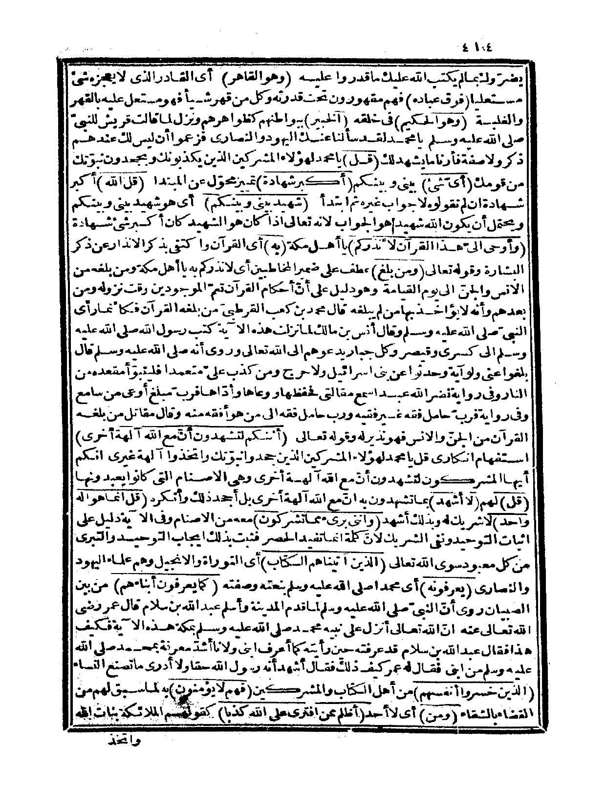 {قل} يا محمد لهؤلاء المشركين الذين يكذبونك ويجحدون نبوّتك من قومك {أيّ شيء} بيني وبينكم {أكبر شهادة} تمييز محوّل عن المبتدأ {قل الله} أكبر شهادة إن لم تقولوه لا جواب غيره ثم ابتدأ {شهيد بيني وبينكم} أي: هو شهيد بيني وبينكم ويحتمل أن يكون الله شهيداً هو الجواب لأنه تعالى إذا كان هو الشهيد كان أكبر شيء شهادة {وأوحي إليّ هذا القرآن لأنذركم} يا أهل مكة {به} أي: القرآن واكتفى بذكر الإنذار عن ذكر البشارة وقوله تعالى: {ومن بلغ} عطف على ضمير المخاطبين أي: لأنذركم به يا أهل مكة ومن بلغه من الإنس والجنّ إلى يوم القيامة وهو دليل على أنّ أحكام القرآن تعمّ الموجودين وقت نزوله ومن بعدهم وأنه لا يؤاخذ بها من لم يبلغه قال محمد بن كعب القرطبيّ: من بلغه القرآن فكأنما رأى النبيّ صلى الله عليه وسلم وقال أنس بن مالك: لما نزلت هذه الآية كتب رسول الله صلى الله عليه وسلم إلى كسرى وقيصر وكل جبار يدعوهم إلى الله تعالى.