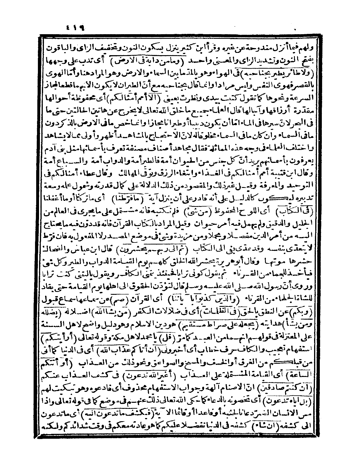 واختلف العلماء في وجه هذه المماثلة فقال مجاهد: أصناف مصنفة تعرف بأسمائها مثل بني آدم يعرفون بأسمائهم يريد أنّ كل جنس من الحيوان أمة فالطير أمة والدواب أمة والسباع أمة وقال ابن قتيبة: أمم أمثالكم في الغذاء وابتغاء الرزق وتوقي المهالك. وقال عطاء: أمثالكم في التوحيد والمعرفة، وقيل غير ذلك، والمقصود من ذلك الدلالة على كمال قدرته وشمول علمه وسعة تدبيره ليكون كالدليل على أنه قادر على أن ينزل آية {ما فرّطنا} أي: ما تركنا أو ما أغفلنا {في الكتاب} أي: اللوح المحفوظ {من شيء} فلم نكتبه فإنه مشتمل على ما يجري في العالم من الجليل والدقيق ولم يهمل فيه أمر حيوان، وقيل: المراد بالكتاب القرآن فإنه قد دوّن فيه ما يحتاج إليه من أمر الدين مفصلاً ومجملاً، ومن مزيدة وشيء في موضع المصدر لا المفعول به فإن فرّط لا يتعدّى بنفسه، وقد عدّي بفي إلى الكتاب {ثم إلى ربهم يحشرون} قال ابن عباس والضحاك: حشرها موتها، وقال أبو هريرة: يحشر الله الخلق كلهم يوم القيامة الدواب والطير وكل شيء فيأخذ للجماء من القرناء، ثم يقول: كوني تراباً فحينئذٍ يتمنى الكافر ويقول: {يا ليتني كنت تراباً} (النبأ، 4) .