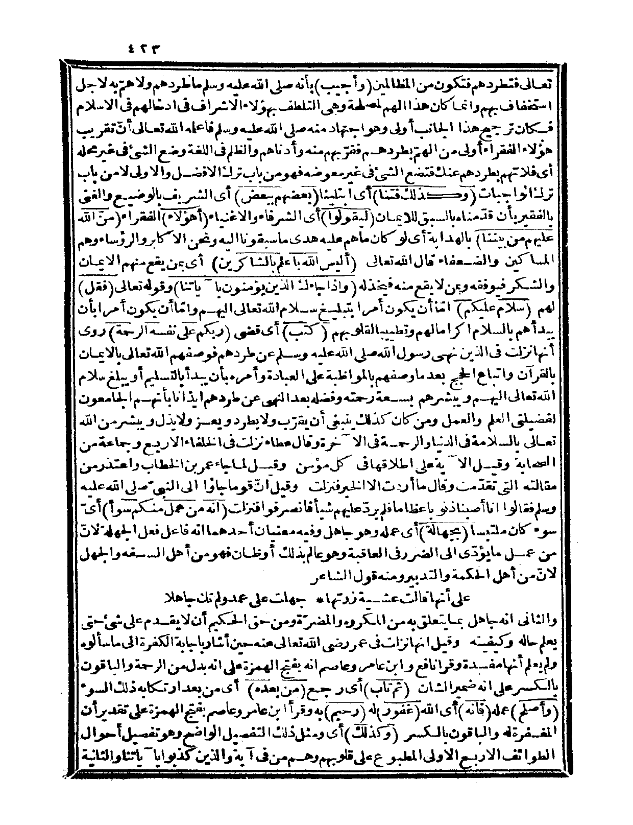 تعالى: {فتطردهم فتكون من الظالمين} وأجيب: بأنه صلى الله عليه وسلم ما طردهم ولا همّ به لأجل استخفاف بهم وإنما كان هذا الهم لمصلحة وهي التلطف بهؤلاء الأشراف في إدخالهم في الإسلام فكان ترجيح هذا الجانب أولى وهو اجتهاد منه صلى الله عليه وسلم فأعلمه الله تعالى أنّ تقريب هؤلاء الفقراء أولى من الهمّ بطردهم فقرّبهم منه وأدناهم والظلم في اللغة وضع الشيء في غير محله أي: فلا تهم بطردهم عنك فتضع الشيء في غير معوضه فهو من باب ترك الأفضل والأولى لا من باب ترك الواجبات.