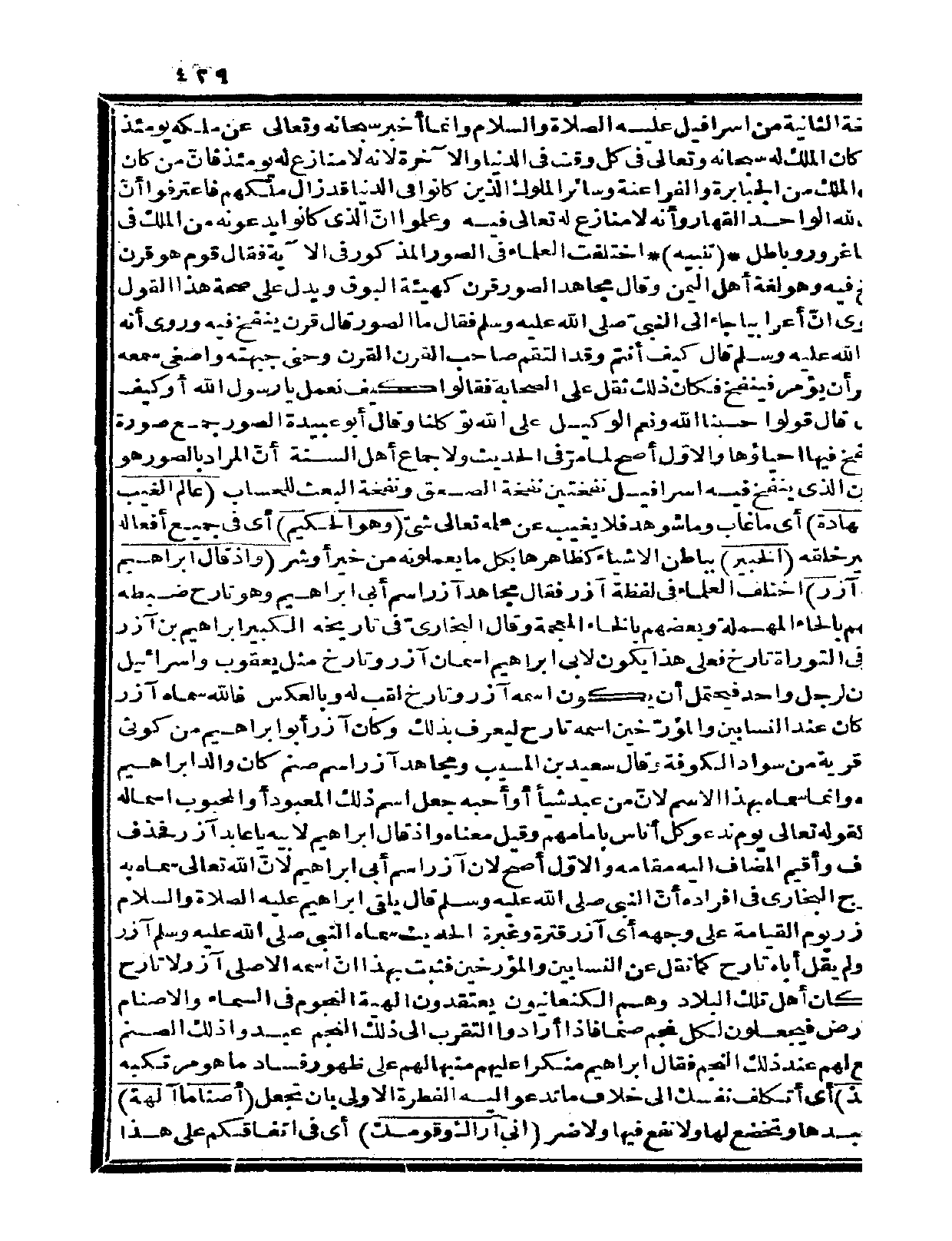 {وإذ قال إبراهيم لأبيه آزر} اختلف العلماء في لفظة آزر فقال مجاهد: آزر اسم أبي إبراهيم وهو تارح ضبطه بعضهم بالحاء المهملة وبعضهم بالخاء المعجمة، وقال البخاريّ في تاريخه الكبير: إبراهيم بن آزر وهو في التوراة تارخ فعلى هذا يكون لأبي إبراهيم اسمان: آزر وتارخ مثل يعقوب وإسرائيل إسمان لرجل واحد فيحتمل أن يكون اسمه آزر وتارخ لقب له وبالعكس، فالله سماه آزر وإن كان عند النسابين والمؤرّخين اسمه تارح ليعرف بذلك وكان آزر أبو إبراهيم من كوثى وهي قرية من سواد الكوفة وقال سعيد بن المسيب ومجاهد: آزر اسم صنم كان والد إبراهيم يعبده وإنما سماه بهذا الاسم لأنّ من عبد شيئاً أو أحبه جعل اسم ذلك المعبود أو المحبوب اسماً له فهو كقوله تعالى: {يوم ندعو كل أناس بإمامهم} (الإسراء، 71) وقيل: معناه وإذا قال إبراهيم لأبيه: يا عابد آزر فحذف المضاف وأقيم المضاف إليه مقامه والأوّل أصح لأن آزر اسم أبي إبراهيم لأنّ الله تعالى سماه به وأخرج البخاري في أفراده أنّ النبيّ صلى الله عليه وسلم قال: «يلقى إبراهيم عليه الصلاة والسلام أباه آزر يوم القيامة على وجهه» أي: آزر فترة وغبرة الحديث سماه النبيّ صلى الله عليه وسلم آزر أيضاً ولم يقل أباه تارح كما نقل عن النسابين والمؤرخين فثبت بهذا أنّ اسمه الأصلي آزر لا تارح وكان أهل تلك البلاد وهم الكنعانيون يعتقدون إلهية النجوم في السماء والأصنام في الأرض فيجعلون لكل نجم صنماً فإذا أرادوا التقرب إلى ذلك النجم عبدوا ذلك الصنم ليشفع لهم عند ذلك النجم فقال إبراهيم منكراً عليهم منبهاً لهم على ظهور فساد ما هو مرتكبه {أتتخذ} أي: أتكلف نفسك إلى خلاف ما تدعو إليه الفطرة الأولى بأن تجعل {أصناماً آلهة} أي: تعبدها وتخضع لها ولا نفع فيها ولا ضر {إني أراك وقومك} أي: في إتفاقكم على هذا