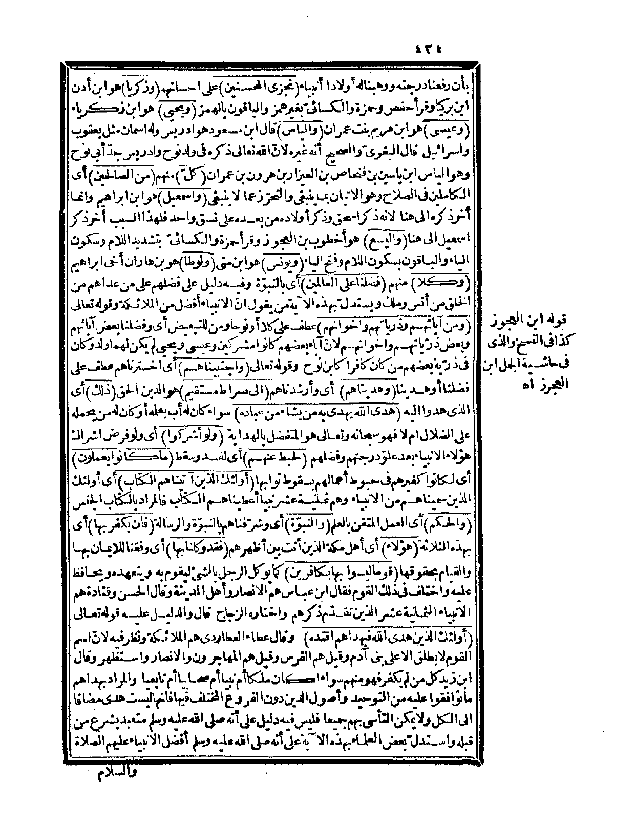 {وزكريا} هو ابن أدن بن بركيا، وقرأ حفص وحمزة والكسائي بغير همز، والباقون بالهمز {ويحيى} هو ابن زكريا {وعيسى} هو ابن مريم بنت عمران {وإلياس} قال ابن مسعود: هو إدريس وله اسمان مثل يعقوب وإسرائيل قال البغويّ: والصحيح أنه غيره لأنّ الله تعالى ذكره في ولد نوح وإدريس جدّ أبي نوح وهو إلياس بن ياسين بن فنحاس بن العيزار بن هارون بن عمران {كلّ} منهم {من الصالحين} أي: الكاملين في الصلاح وهو الإتيان بما ينبغي والتحرّز عما لا ينبغي {وإسمعيل} هو ابن إبراهيم وإنما أخر ذكره إلى هنا لأنه ذكر إسحاق وذكر أولاده من بعده على نسق واحد فلهذا السبب أخر ذكر إسماعيل إلى هنا {واليسع} هو أخطوب بن العجوز، وقرأ حمزة والكسائي بتشديد اللام وسكون الياء والباقون بسكون اللام وفتح الياء {ويونس} هو ابن متى {ولوطاً} هو ابن هاران أخي إبراهيم {وكلاً} منهم {فضلنا على العالمين} أي: بالنبوّة وفيه دليل على فضلهم على من عداهم من الخلق من أنس وملك ويستدلّ بهذه الآية من يقول إنّ الأنبياء أفضل من الملائكة وقوله تعالى: