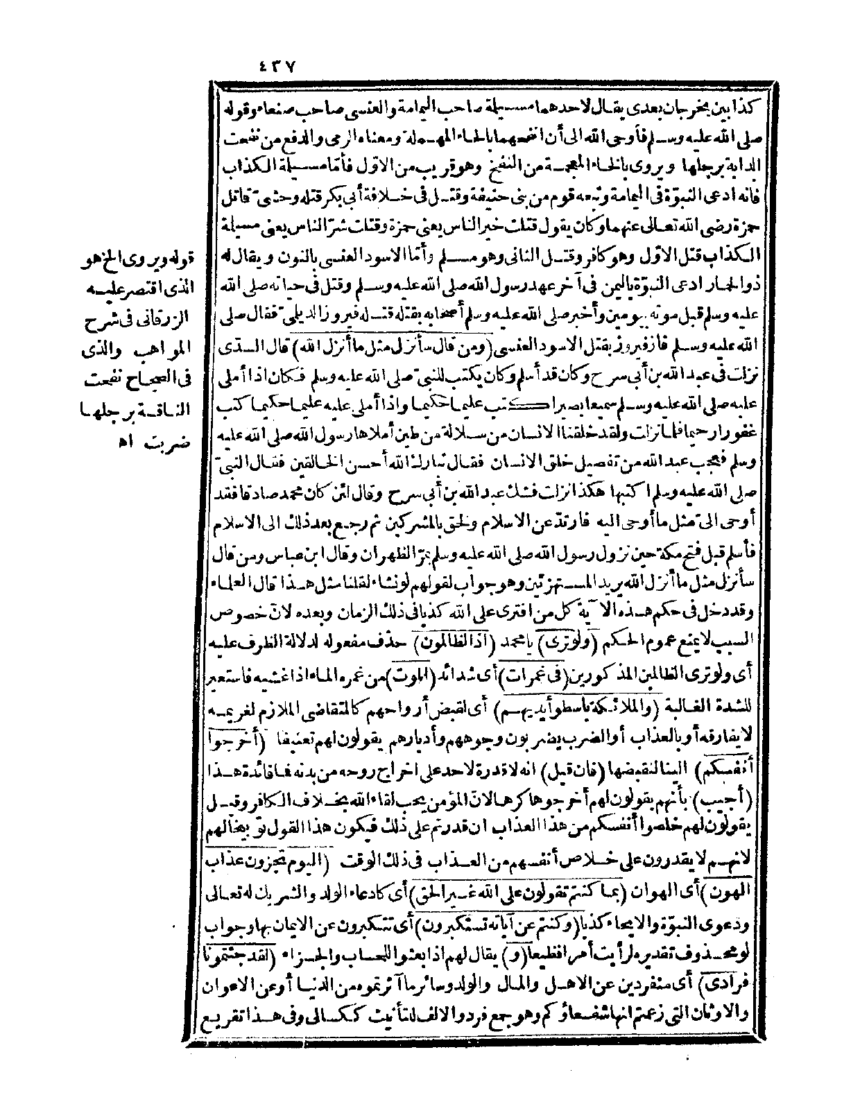 كذابين يخرجان بعدي يقال لأحدهما مسيلمة صاحب اليمامة والعنسي صاحب صنعاء» وقوله صلى الله عليه وسلم «فأوحى الله إلي أن أنفحهما» بالحاء المهملة ومعناه الرمي والدفع من نفحت الدابة برجلها ويروى بالخاء المعجمة من النفخ وهو قريب من الأوّل فأمّا مسيلمة الكذاب فإنه ادعى النبوّة في اليمامة وتبعه قوم من بني حنيفة وقتل في خلافة أبي بكر قتله وحشيّ قاتل حمزة رضي الله تعالى عنهما وكان يقول: قتلت خير الناس يعني: حمزة، وقتلت شرّ الناس يعني: مسيلمة الكذاب، قتل الأوّل وهو كافر وقتل الثاني وهو مسلم، وأمّا الأسود العنسي بالنون ويقال له: ذو الحمار، ادعى النبوّة باليمن في آخر عهد رسول الله صلى الله عليه وسلم وقتل في حياته صلى الله عليه وسلم قبل موته بيومين وأخبر صلى الله عليه وسلم أصحابه بقتله، قتله فيروز الديلميّ فقال صلى الله عليه وسلم