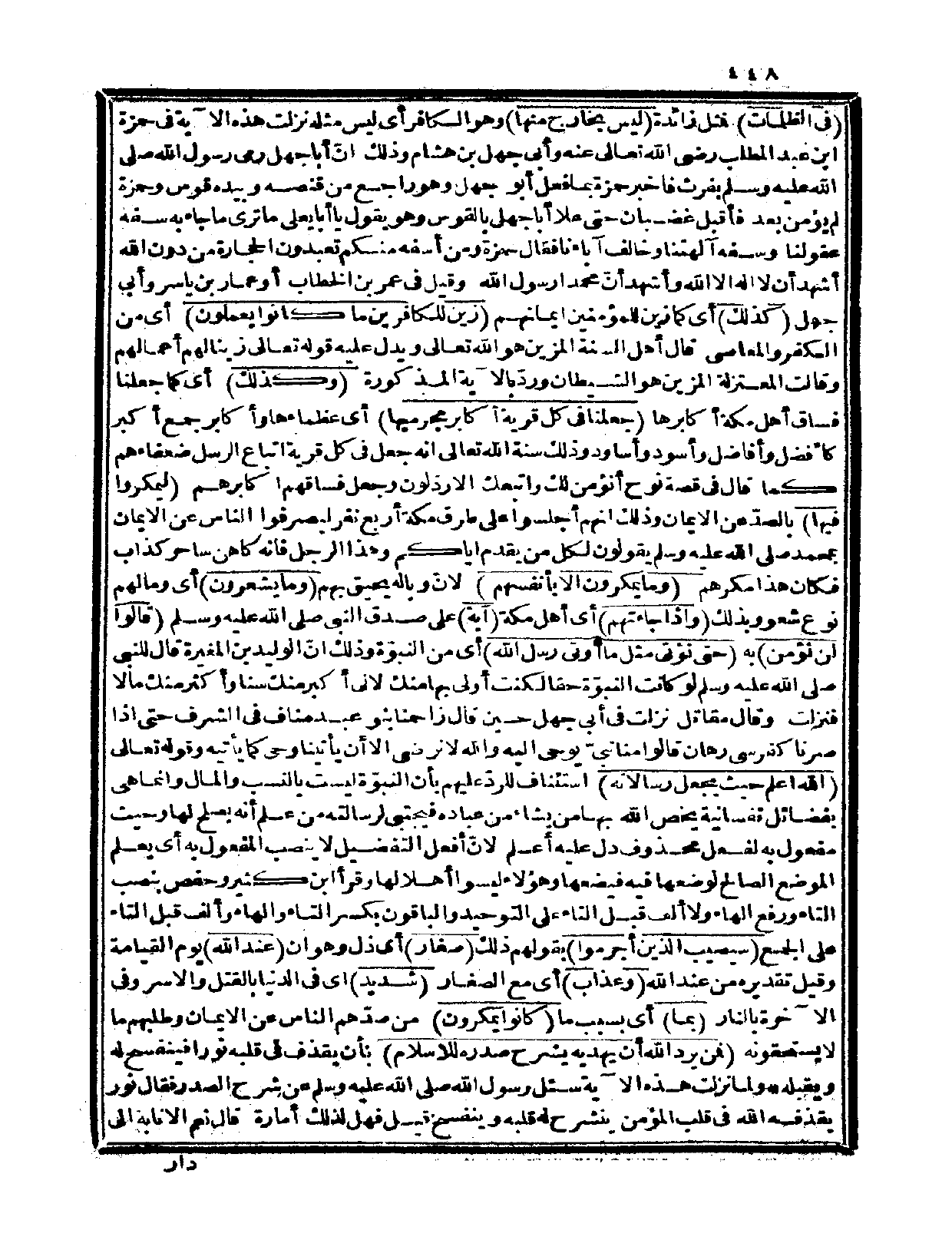 {في الظلمات} فمثل زائدة {ليس بخارج منها} وهو الكافر أي: ليس مثله. نزلت هذه الآية في حمزة بن عبد المطلب رضي الله تعالى عنه وأبي جهل بن هشام وذلك إنّ أبا جهل رمى رسول الله صلى الله عليه وسلم بفرث فأخبر حمزة بما فعل أبو جهل وهو راجع من قنصه وبيده قوس وحمزة لم يؤمن بعد فأقبل غضبان حتى علا أبا جهل بالقوس وهو يقول: يا أبا يعلى ما ترى ما جاء به سفه عقولنا وسفه آلهتنا وخالف آباءنا، فقال حمزة: ومن أسفه منكم تعبدون الحجارة من دون الله أشهد أن لا إله إلا الله وأشهد أنّ محمداً رسول الله، وقيل: في عمر بن الخطاب أو عمار بن ياسر وأبي جهل. {كذلك} أي: كما زين للمؤمنين إيمانهم {زين للكافرين ما كانوا يعملون} أي: من الكفر والمعاصي، قال أهل السنة: المزين هو الله تعالى ويدل عليه قوله تعالى: زينا لهم أعمالهم وقالت المعتزلة: المزين هو الشيطان وردّ بالآية المذكورة.