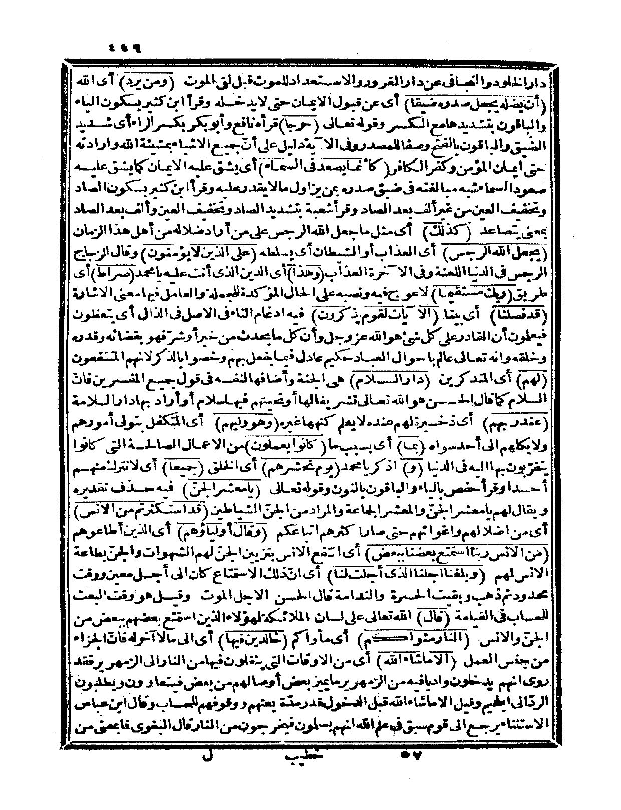 دار الخلود والتجافي عن دار الغرور والاستعداد للموت قبل لقي الموت» {ومن يرد} أي: الله {أن يضله يجعل صدره ضيقاً} أي: عن قبول الإيمان حتى لا يدخله، وقرأ ابن كثير بسكون الياء، والباقون بتشديدها مع الكسر، وقوله تعالى: {حرجاً} قرأه نافع وأبو بكر بكسر الراء أي: شديد الضيق، والباقون بالفتح وصفاً للمصدر، وفي الآية دليل على أنّ جميع الأشياء بمشيئة الله وإرادته حتى إيمان المؤمن وكفر الكافر {كأنما يصعد في السماء} أي: يشق عليه الإيمان كما يشق عليه صعود السماء شبه مبالغته في ضيق صدره بمن يزاول ما لا يقدر عليه، وقرأ ابن كثير بسكون الصاد وتخفيف العين من غير ألف بعد الصاد، وقرأ شعبة بتشديد الصاد وتخفيف العين وألف بعد الصاد بمعنى يتصاعد {كذلك} أي: مثل ما جعل الله الرجس على من أراد ضلاله من أهل هذا الزمان {يجعل الله الرجس} أي: العذاب أو الشيطان أي: يسلطه {على الذين لا يؤمنون} وقال الزجاج: الرجس في الدنيا اللعنة وفي الآخرة العذاب.