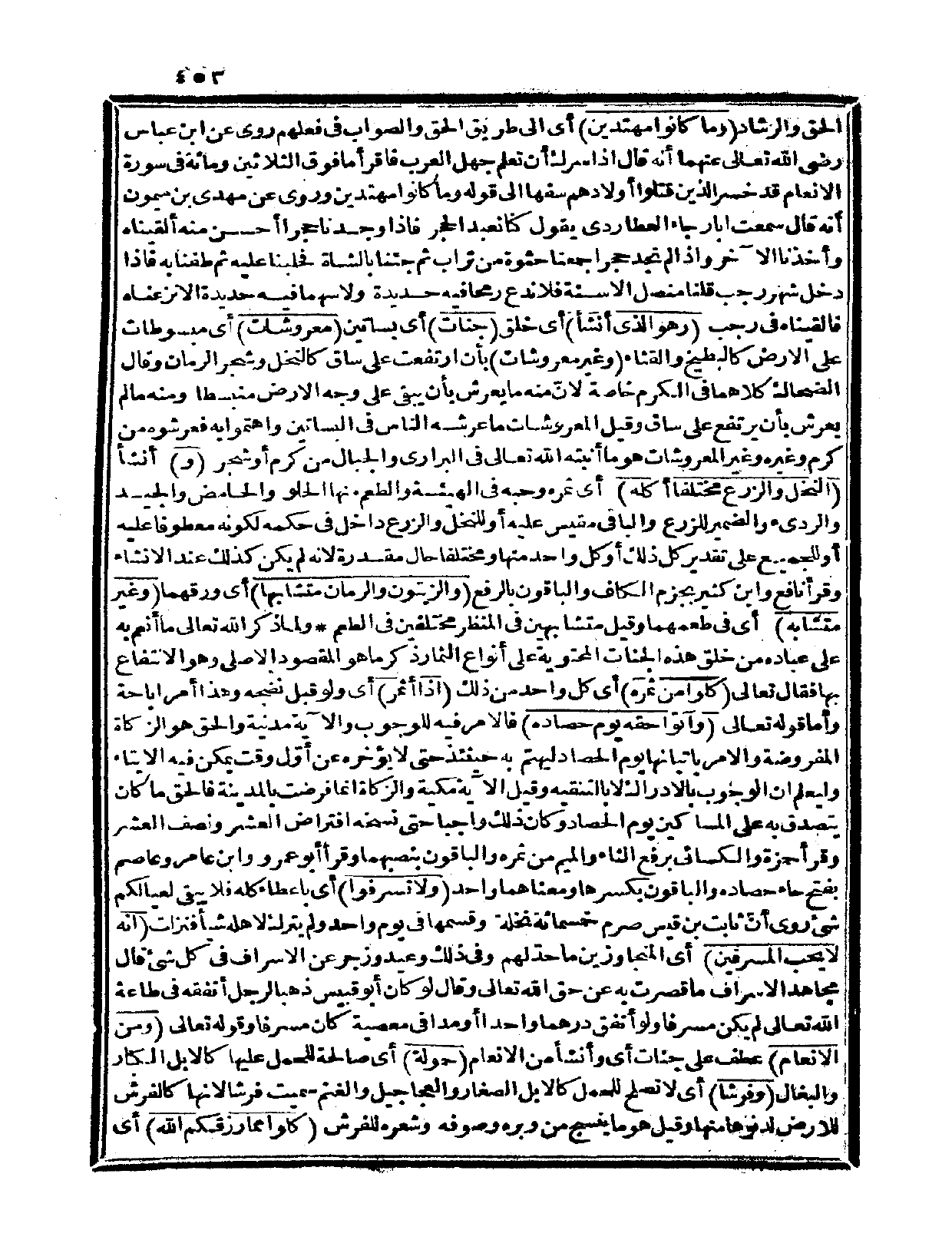 {وهو الذي أنشأ} أي: خلق {جنات} أي: بساتين {معروشات} أي: مبسوطات على الأرض كالبطيخ والقثاء {وغير معروشات} بأن ارتفعت على ساق كالنخل وشجر الرمان، وقال الضحاك: كلاهما في الكرم خاصة لأنّ منه ما يعرش بأن يبقى على وجه الأرض منبسطاً ومنه ما لم يعرش بأن يرتفع على ساق، وقيل: المعروشات ما عرشه الناس في البساتين، واهتموا به فعرشوه من كرم وغيره، وغير المعروشات هو ما أنبته الله تعالى في البراري والجبال من كرم أو شجر {و} أنشأ {النخل والزرع مختلفاً أكله} أي: ثمره وحبه في الهيئة والطعم منها الحلو والحامض والجيد والرديء، والضمير للزرع والباقي مقيس عليه، أو للنخل والزرع داخل في حكمه لكونه معطوفاً عليه، أو للجميع على تقدير كل ذلك أو كل واحد منها، ومختلفاً حال مقدرة لأنه لم يكن كذلك عند الإنشاء، وقرأ نافع وابن كثير بجزم الكاف، والباقون بالرفع {والزيتون والرمان متشابهاً} أي: ورقهما {وغير متشابه} أي: في طعمهما، وقيل: متشابهين في المنظر مختلفين في الطعم.