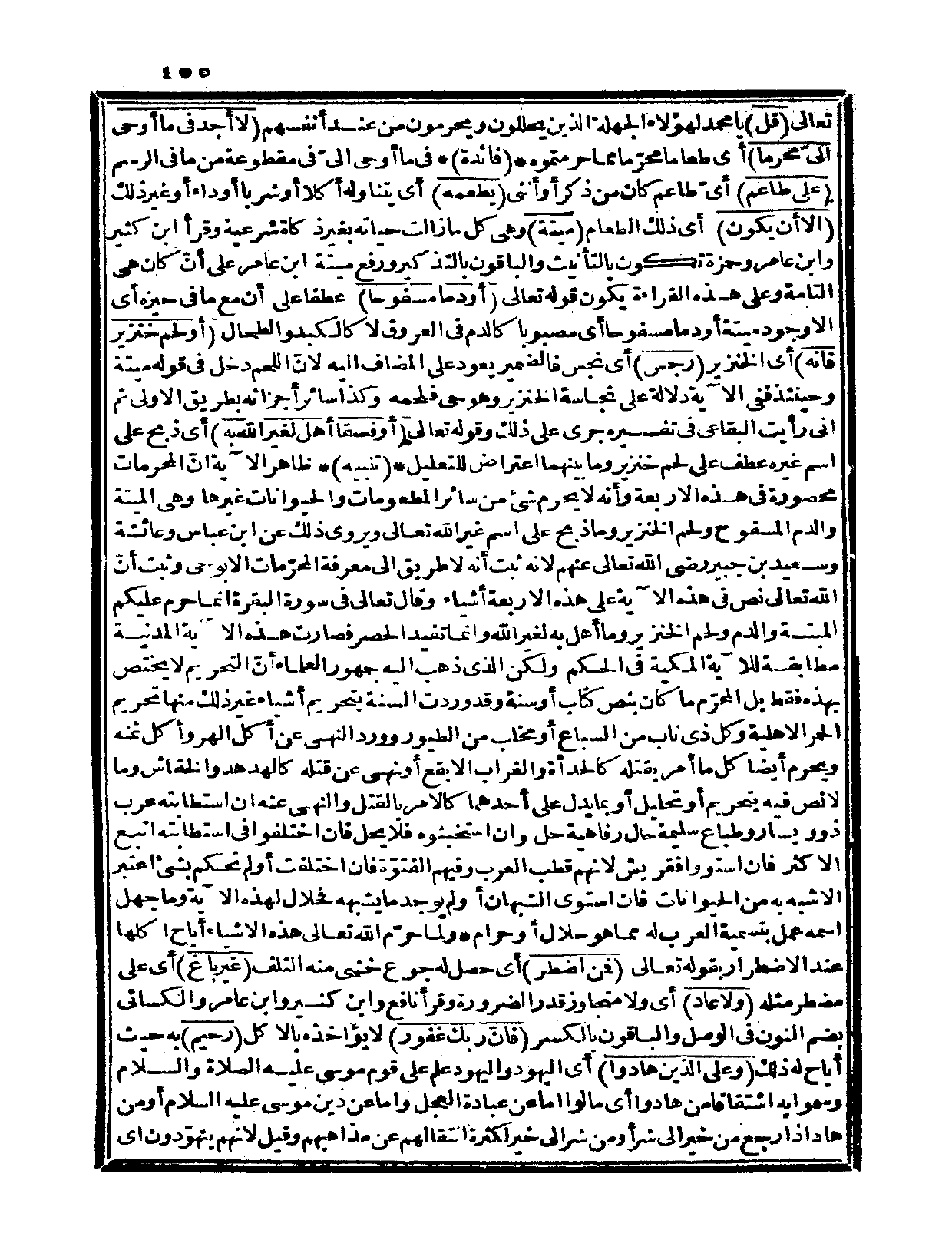 تنبيه: ظاهر الآية أنّ المحرمات محصورة في هذه الأربعة وأنه لا يحرم شيء من سائر المطعومات والحيوانات غيرها وهي الميتة والدم المسفوح ولحم الخنزير وما ذبح على اسم غير الله تعالى، ويروى ذلك عن ابن عباس وعائشة وسعيد بن جبير رضي الله تعالى عنهم لأنه ثبت أنه لا طريق إلى معرفة المحرّمات إلا بوحي وثبت أنّ الله تعالى نص في هذه الآية على هذه الأربعة أشياء وقال تعالى في (البقرة، 173)