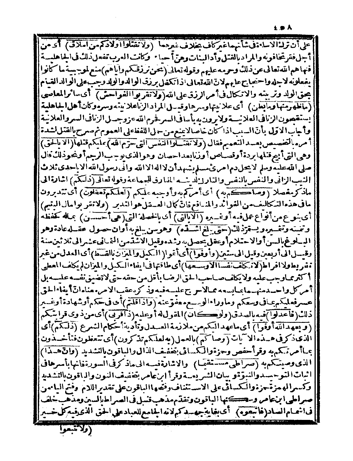 على أن ترك الإساءة في شأنهما غير كاف بخلاف غيرهما {ولا تقتلوا أولادكم من إملاق} أي: من أجل فقر تخافونه، والمراد بالقتل وأد البنات وهنّ أحياء وكانت العرب تفعل ذلك في الجاهلية فنهاهم الله تعالى عن ذلك وحرمه عليهم وقوله تعالى: {نحن نرزقكم وإياهم} منع لموجبية ما كانوا يفعلونه لأجله واحتجاج عليهم لأنّ الله تعالى إذا تكفل برزق الوالد والولد وجب على الوالد القيام بحق الولد وتربيته والاتكال في أمر الرزق على الله {ولا تقربوا الفواحش} أي: سائر المعاصي {ما ظهر منها وما بطن} أي: علانيتها وسرها، وقيل: المراد الزنا علانيته وسره وكان أهل الجاهلية يستقبحون الزنا في العلانية ولا يرون به بأساً في السر فحرم الله عز وجل الزنا في السر والعلانية، وأجاب الأوّل بأنّ السبب إذا كان خاصاً لا يمنع من حمل اللفظ على العموم ثم صرح بالقتل لشدة أمره بالتخصيص بعد التعميم فقال: {ولا تقتلوا النفس التي حرّم الله} عليكم قتلها {إلا بالحق} وهي التي أبيح قتلها بردة أو قصاص أو زنا بعد إحصان وهو الذي يوجب الرجم أو نحو ذلك قال صلى الله عليه وسلم «لا يحل دم امرىء مسلم يشهد أن لا إله إلا الله وأني رسول الله إلا بإحدى ثلاث: الثيب الزاني والنفس بالنفس والتارك لدينه المفارق للجماعة» وقوله تعالى: {ذلكم} إشارة إلى ما ذكر مفصلاً {وصاكم به} أي: أمركم به وأوجبه عليكم {لعلكم تعقلون} أي: تتدبرون ما في هذه التكاليف من الفوائد والمنافع فإنّ كمال العقل هو التدبر.k