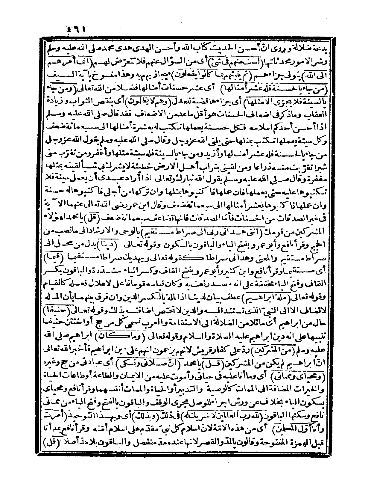 {قيماً} أي: مستقيماً، وقرأ نافع وابن كثير وأبو عمرو بفتح القاف وكسر الياء مشدّدة والباقون بكسر القاف وفتح الباء مخففة على أنه مصدر نعت به وكان قياسه قوماً فاعل لإعلال فعله كالقيام، وقوله تعالى: {ملة إبراهيم} عطف بيان لديناً إذ الملة بالكسر لدين وإن فرق بينهما بأن الملة لا تضاف إلا إلى النبيّ الذي تستند إليه، والدين لا تختص إضافته بذلك، وقوله تعالى: {حنيفاً} حال من إبراهيم أي: مائلاً من الضلالة إلى الاستقامة والعرب تسمي كل مرجح أو اختتن حنيفاً تنبيهاً على أنه دين إبراهيم عليه الصلاة والسلام وقوله تعالى: {وما كان} إبراهيم صلى الله عليه وسلم {من المشركين} ردّ على كفار قريش لأنهم يزعمون أنهم على دين إبراهيم فأخبر الله تعالى أنّ إبراهيم لم يكن من المشركين.