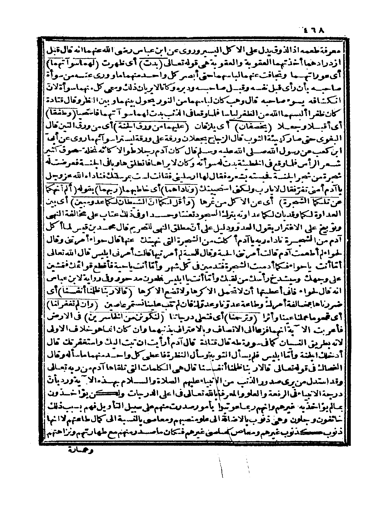 روي عن أبيّ بن كعب عن رسول الله صلى الله عليه وسلم قال: «كان آدم رجلاً طوالاً كأنه نخلة سحوق كثير شعر الرأس فلما وقع في الخطيئة بدت له سوأته وكان لا يراها فانطلق هارباً في الجنة فعرضت له شجرة من شجر الجنة فحبسته بشعره فقال لها: أرسليني، فقالت: لست بمرسلتك، فناداه الله عز وجل: يا آدم أمني تفرّ، فقال: لا يا رب ولكني استحييتك» {وناداهما} أي: خاطبهما {ربهما} بقوله: {ألم أنهكما عن تلكما الشجرة} أي: عن الأكل من ثمرها {وأقل لكما إنّ الشيطان لكما عدو مبين} أي: بين العداوة لكما وقد بان لكما عداوته بترك السجود تعنتاً وحسداً، وفي ذلك عتاب على مخالفة النهي وتوبيخ على الاغترار بقول العدوّ ودليل على أنّ مطلق النهي للتحريم، قال محمد بن قيس: لما أكل آدم من الشجرة ناداه ربه يا آدم أكلت من الشجرة التي نهيتك عنها؟ قال: حواء أمرتني، وقال لحواء: لم أطعمت آدم؟ قالت: أمرتني الحية، وقال للحية: لم أمرتيها؟ قالت: أمرني إبليس، قال الله تعالى: أمّا أنت يا حواء فكما أدميت الشجرة فتدمين في كل شهر، وأمّا أنت يا حية فأقطع قوائمك فتمشين على وجهك وسيشدخ رأسك من لقيك، وأمّا أنت يا إبليس فملعون مدحور. وفي رواية لابن عباس: إنه قال لحواء: فإني أعطيتها أن لا تحمل إلا كرهاً ولا تضع إلا كرهاً.