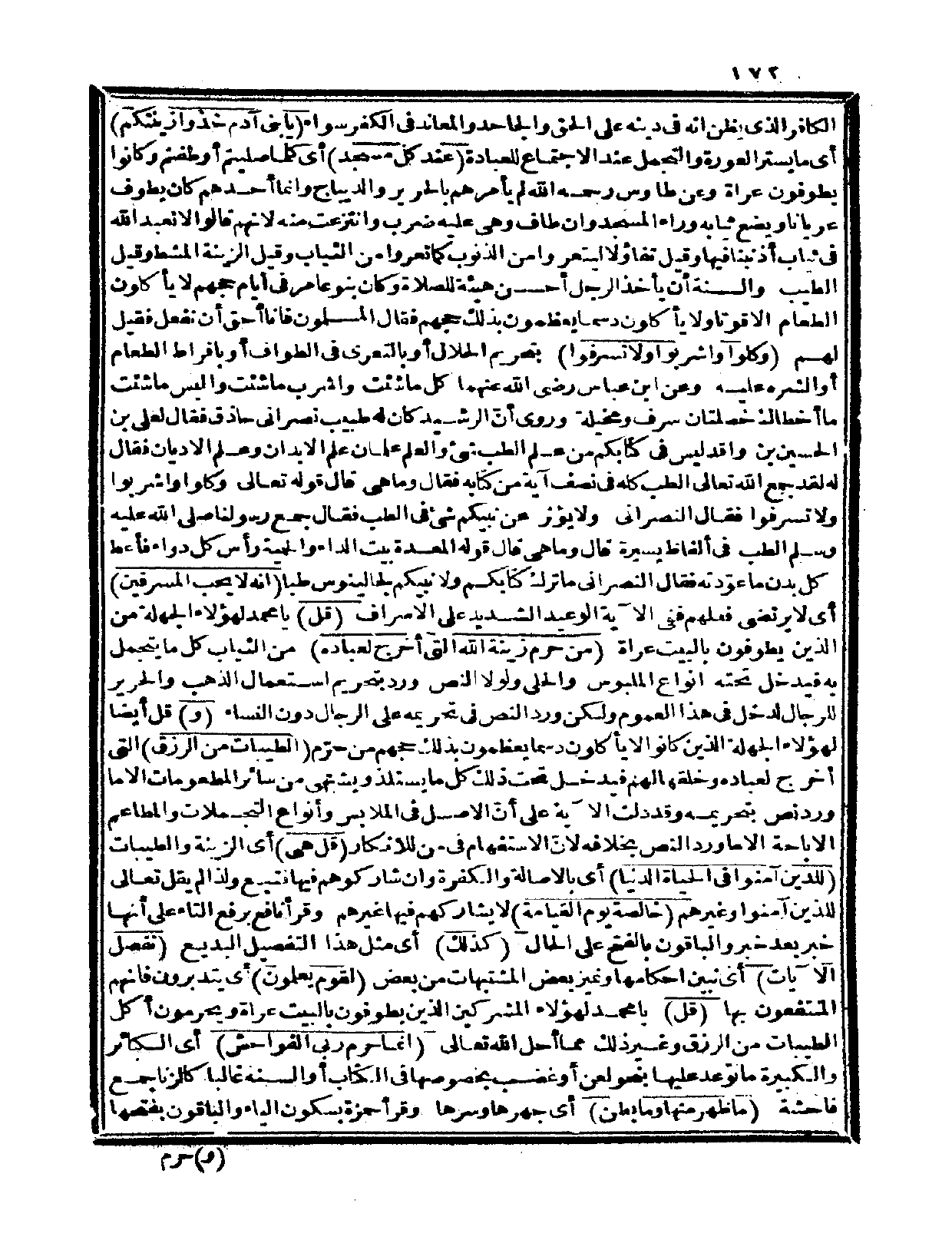 {يا بني آدم خذوا زينتكم} أي: ما يستر العورة والتجمل عند الاجتماع للعبادة {عند كل مسجد} أي: كلما صليتم أو طفتم وكانوا يطوفون عراة، وعن طاووس رحمه الله: لم يأمرهم بالحرير والديباج وإنما أحدهم كان يطوف عرياناً ويضع ثيابه وراء المسجد وإن طاف وهي عليه ضرب وانتزعت منه لأنهم قالوا: لا نعبد الله في ثياب أذنبنا فيها، وقيل: تفاؤلاً ليتعروا من الذنوب كما تعروا من الثياب، وقيل: الزينة المشط، وقيل: الطيب. والسنة أن يأخذ الرجل أحسن هيئة للصلاة وكان بنو عامر في أيام حجهم لا يأكلون الطعام إلا قوتاً ولا يأكلون دسماً يعظمون بذلك حجهم فقال المسلمون: فإنا أحق أن نفعل فقيل لهم: {وكلوا واشربوا ولا تسرفوا} بتحريم الحلال أو بالتعري في الطواف أو بإفراط الطعام أو الشره عليه، وعن ابن عباس رضي الله عنهما: كل ما شئت واشرب ما شئت والبس ما شئت ما أخطاك خصلتان سرف ومخيلة.