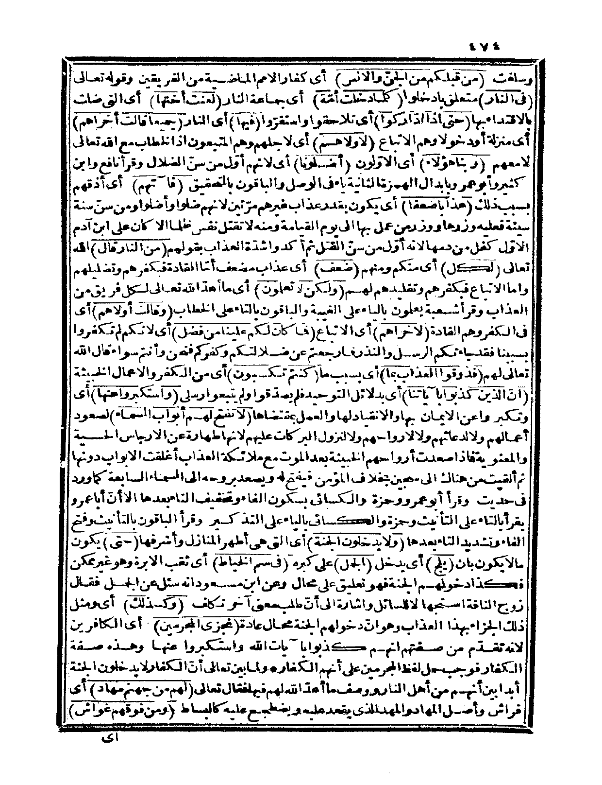 وسلفت {من قبلكم من الجنّ والإنس} أي: كفار الأمم الماضية من الفريقين، وقوله تعالى: {في النار} متعلق بادخلوا {كلما دخلت أمّة} أي: جماعة النار {لعنت أختها} أي: التي ضلت بالاقتداء بها {حتى إذا ادّاركوا} أي: تلاحقوا واستقرّوا {فيها} أي: النار {جميعاً قالت أخراهم} أي: منزلة أو دخولاً وهم الأتباع {لأولاهم} أي: لأجلهم وهم المتبعون إذ الخطاب مع الله تعالى لا معهم {ربنا هؤلاء} أي: الأوّلون {أضلونا} أي: لأنهم أوّل من سنّ الضلال. وقرأ نافع وابن كثير وأبو عمرو بإبدال الهمزة الثانية ياء في الوصل، والباقون بالتحقيق {فآتهم} أي: أذقهم بسبب ذلك {عذاباً ضعفاً} أي: يكون بقدر عذاب غيرهم مرّتين لأنهم ضلوا وأضلوا ومن سنّ سنة سيئة فعليه وزرها ووزر من عمل بها إلى يوم القيامة ومنه لا تقتل نفس ظلماً إلا كان على ابن آدم الأول كفل من دمها لأنه أوّل من سنّ القتل، ثم أكدوا شدّة العذاب بقولهم: {من النار قال} الله تعالى: {لكل} أي: منكم ومنهم {ضعف} أي: عذاب مضعف أمّا القادة فبكفرهم وتضليلهم وأما الأتباع فبكفرهم وتقليدهم لهم {ولكن لا تعلمون} أي: ما أعدّ الله تعالى لكل فريق من العذاب. وقرأ شعبة: يعلمون بالياء على الغيبة، والباقون بالتاء على الخطاب.