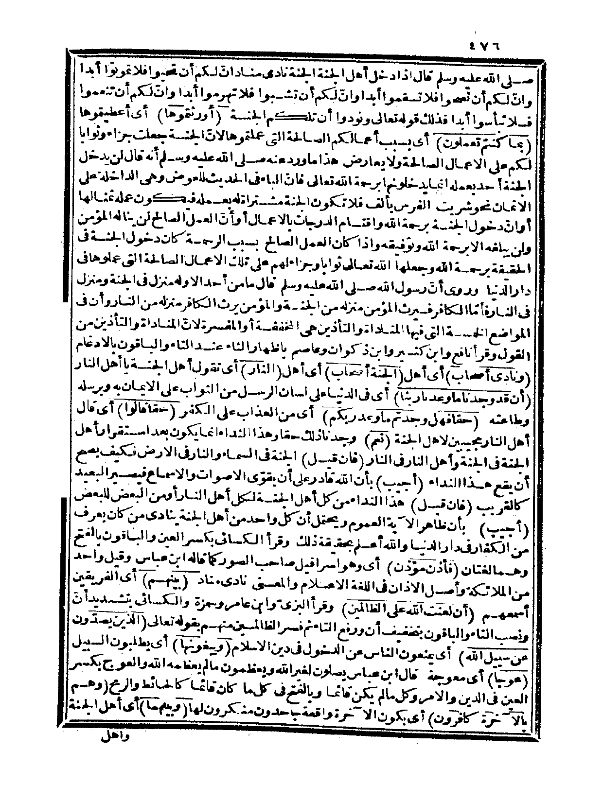 وروي أنّ رسول الله صلى الله عليه وسلم قال: «ما من أحد إلا وله منزل في الجنة ومنزل في النار أمّا الكافر فيرث المؤمن منزله من الجنة والمؤمن يرث الكافر منزله من النار» وأن في المواضع الخمسة التي فيها المناداة والتأذين هي المخففة أو المفسرة لأنّ المناداة والتأذين من القول، وقرأ نافع وابن كثير وابن ذكوان وعاصم بإظهار الثاء عند التاء والباقون بالإدغام.