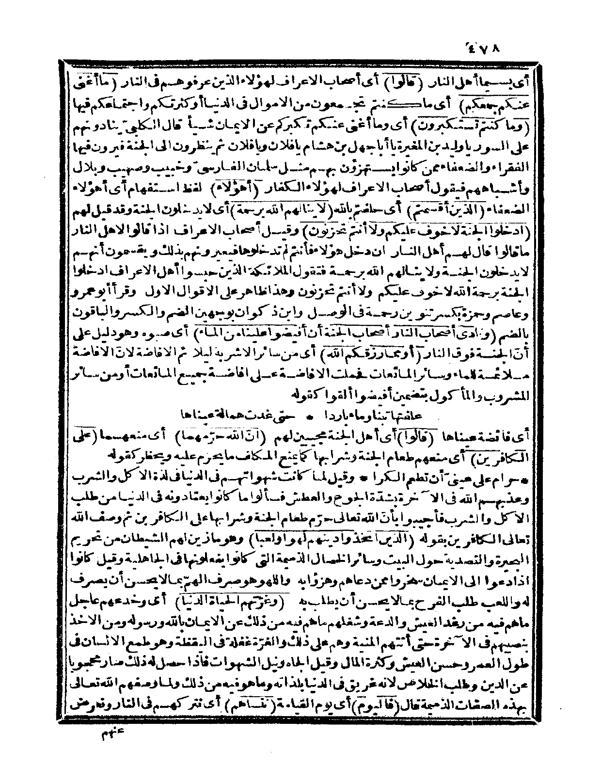 أي: بسيما أهل النار {قالوا} أي: أصحاب الأعراف لهؤلاء الذين عرفوهم في النار {ما أغنى عنكم جمعكم} أي: ما كنتم تجمعون من الأموال في الدنيا أو كثرتكم واجتماعكم فيها {وما كنتم تستكبرون} أي: وما أغنى عنكم تكبركم عن الإيمان شيئاً، قال الكلبيّ: ينادونهم على السور يا وليد بن المغيرة يا أبا جهل بن هشام يا فلان ويا فلان ثم ينظرون إلى الجنة فيرون فيها الفقراء والضعفاء ممن كانوا يستهزؤون بهم مثل سلمان الفارسيّ وخبيب وصهيب وبلال وأشباههم فيقول أصحاب الأعراف لهؤلاء الكفار: