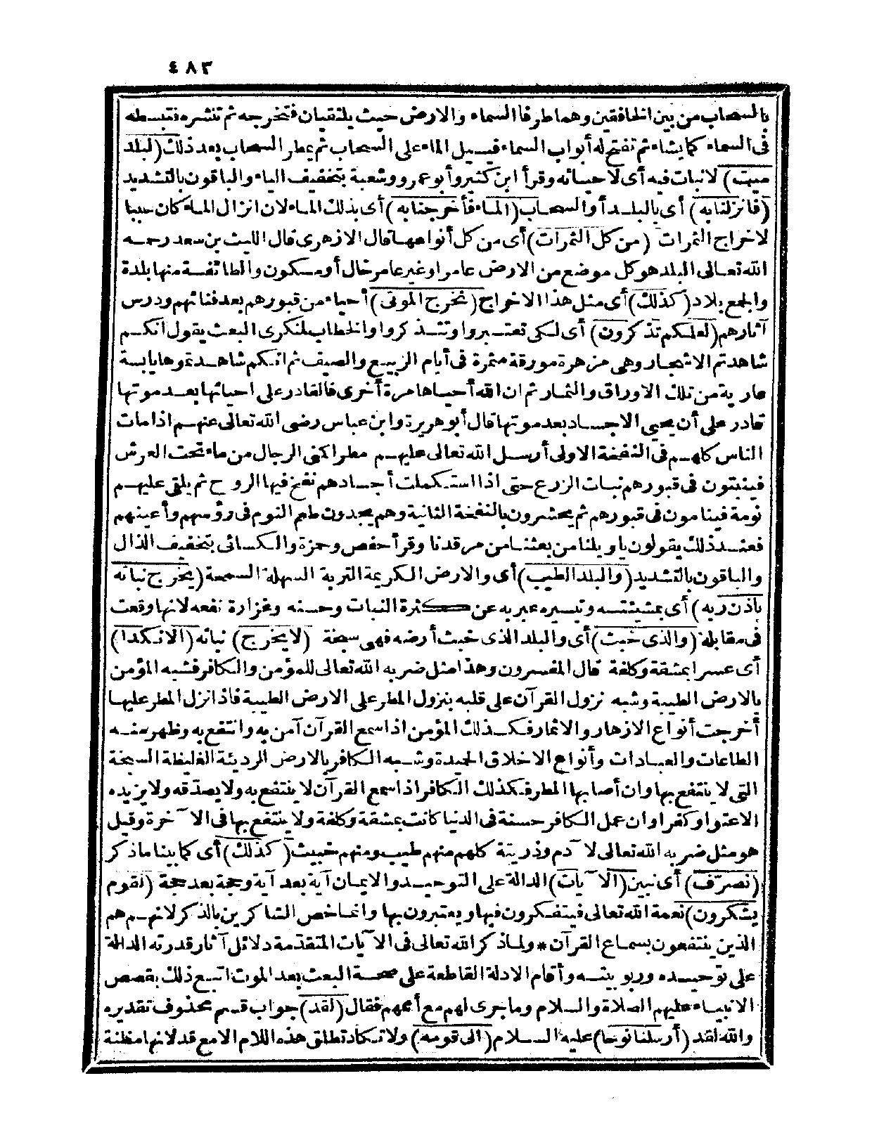 {والبلد الطيب} أي: والأرض الكريمة التربة السهلة السمحة {يخرج نباته بإذن ربه} أي: بمشيئته وتيسيره عبر به عن كثرة النبات وحسنه وغزارة نفعه لأنها وقعت في مقابلة {والذي خبث} أي: والبلد الذي خبث أرضه فهي سبخة {لا يخرج} نباته {إلا نكداً} أي: عسراً بمشقة وكلفة قال المفسرون: وهذا مثل ضربه الله تعالى للمؤمن والكافر فشبه المؤمن بالأرض الطيبة وشبه نزول القرآن على قلبه بنزول المطر على الأرض الطيبة فإذا نزل المطر عليها أخرجت أنواع الأزهار والأثمار فكذلك المؤمن إذا سمع القرآن آمن به وانتفع به وظهر منه الطاعات والعبادات وأنواع الأخلاق الحميدة وشبه الكافر بالأرض الرديئة الغليظة السبخة التي لا ينتفع بها وإن أصابها المطر فكذلك الكافر إذا سمع القرآن لا ينتفع به ولا يصدّقه ولا يزيده إلا عتواً وكفراً وإن عمل الكافر حسنة في الدنيا كانت بمشقة وكلفة ولا ينتفع بها في الآخرة، وقيل: هو مثل ضربه الله تعالى لآدم وذريته كلهم منهم طيب ومنهم خبيث {كذلك} أي: كما بينا ما ذكر {نصرّف} أي: نبين {الآيات} الدالة على التوحيد والإيمان آية بعد آية وحجة بعد حجة {لقوم يشكرون} نعمة الله تعالى فيتفكرون فيها ويعتبرون بها وإنما خص الشاكرين بالذكر لأنهم هم الذين ينتفعون بسماع القرآن.