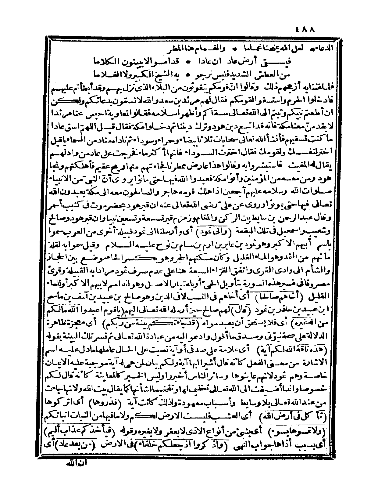 فلما غنتا به أزعجهم ذلك وقالوا: إن قومكم يتغوثون من البلاء الذي نزل بهم وقد أبطأتم عليهم فادخلوا الحرم واستسقوا لقومكم فقال لهم مرثد بن سعد: والله لا تسقون بدعائكم ولكن إن أطعتم نبيكم وتبتم إلى الله تعالى سقاكم وأظهر إسلامه فقالوا لمعاوية: احبس عنا مرثداً لا يقدمنّ معنا مكة فإنه قد اتبع دين هود وترك ديننا ثم دخلوا مكة فقال قيل: اللهمّ اسق عاداً ما كنت تسقيهم فأنشأ الله تعالى سحابات ثلاثاً بيضاء وحمراء وسوداء ثم ناداه مناد من السماء: يا قيل اختر لنفسك ولقومك فقال: اخترت السوداء فإنها أكثر ماء فخرجت على عاد من واد لهم يقال له: المغيث فاستبشروا به وقالوا: هذا عارض ممطرنا فجاءتهم منها ريح عقيم فأهلكتهم ونجا هود ومن معه من المؤمنين وأتوا مكة فعبدوا الله فيها حتى ماتوا.
