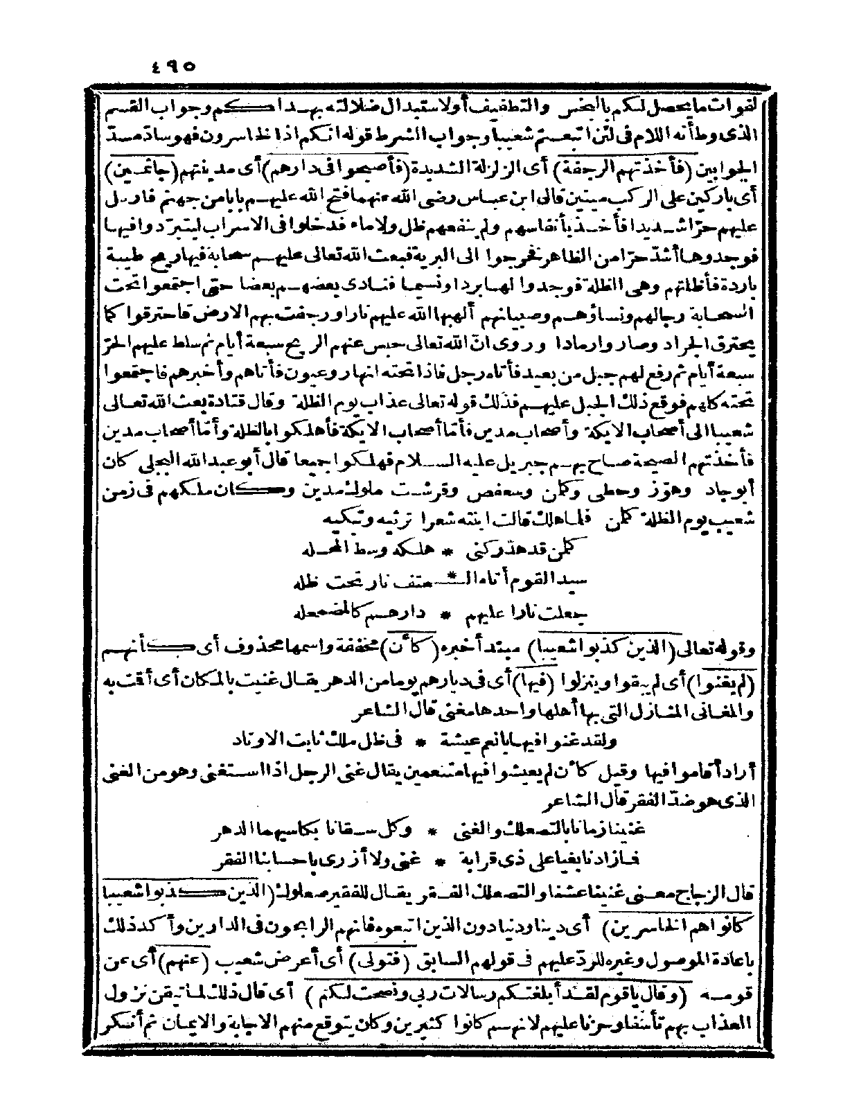 وقال قتادة: بعث الله تعالى شعيباً إلى أصحاب الأيكة وأصحاب مدين فأمّا أصحاب الأيكة فأهلكوا بالظلة وأمّا أصحاب مدين فأخذتهم الصيحة صاح بهم جبريل عليه السلام فهلكوا جميعاً، قال أبو عبدا الله البجلي: كان أبو جاد وهوّز وحطي وكلمن وسعفص وقرشت ملوك مدين وكان ملكهم في زمن شعيب يوم الظلة كلمن فلما هلك قالت ابنته شعراً ترثيه وتبكيه: