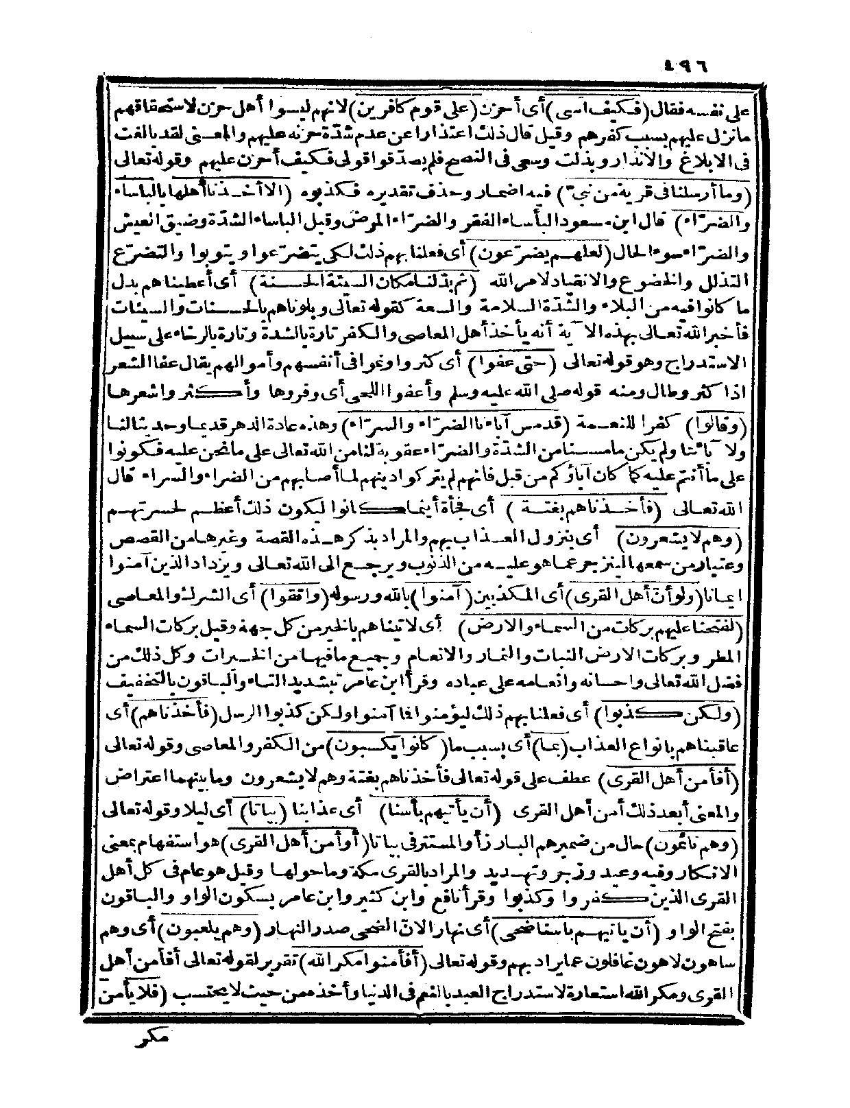 {ولو أنّ أهل القرى} أي: المكذبين {آمنوا} أي: بالله ورسوله {واتقوا} أي: الشرك والمعاصي {لفتحنا عليهم بركات من السماء والأرض} أي: لأتيناهم بالخير من كل جهة، وقيل: بركات السماء المطر وبركات الأرض النبات والثمار والأنعام وجميع ما فيها من الخيرات وكل ذلك من فضل الله تعالى وإحسانه وإنعامه على عباده. وقرأ ابن عامر بتشديد التاء والباقون بالتخفيف {ولكن كذبوا} أي: فعلنا بهم ذلك ليؤمنوا فما آمنوا ولكن كذبوا الرسل {فأخذناهم} أي: عاقبناهم بأنواع العذاب {بما} أي: بسبب ما {كانوا يكسبون} من الكفر والمعاصي.