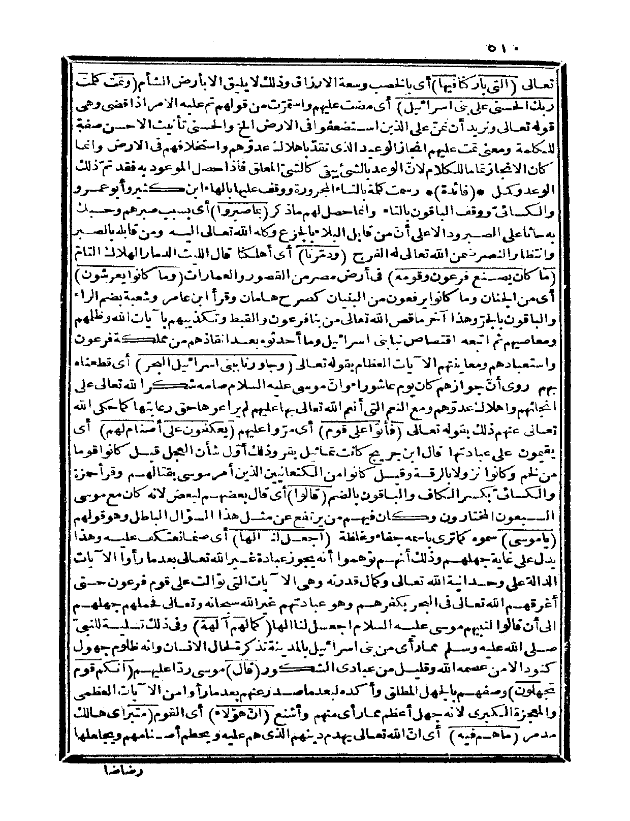 تعالى: {التي باركنا فيها} أي: بالخصب وسعة الأرزاق وذلك لا يليق إلا بأرض الشأم {وتمت كلمت ربك الحسنى على بني إسرائيل} أي: مضت عليهم واستمرّت من قولهم تم عليه الأمر إذا قضي وهي قوله تعالى: {ونريد أن نمنّ على الذين استضعفوا في الأرض} (القصص، 5)