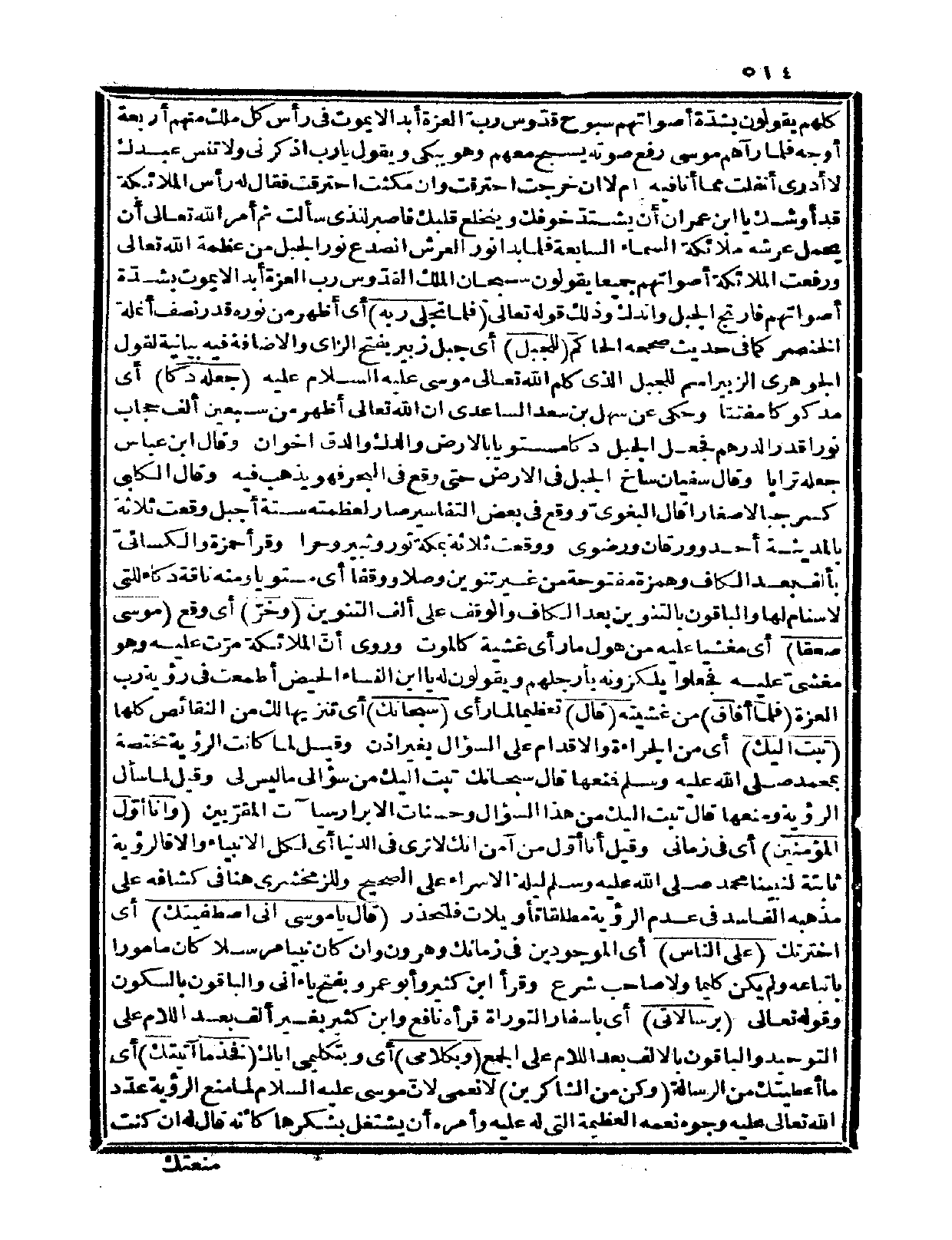 كلهم يقولون بشدّة أصواتهم: سبوح قدّوس ربّ العزة أبداً لا يموت في رأس كل ملك منهم أربعة أوجه فلما رآهم موسى رفع صوته يسبح معهم وهو يبكي ويقول: يا رب اذكرني ولا تنس عبدك لا أدري أنفلت مما أنا فيه أم لا إن خرجت احترقت وإن مكثت احترقت، فقال له رأس الملائكة: قد أوشك يا ابن عمران أن يشتدّ خوفك وينخلع قلبك فاصبر للذي سألت ثم أمر الله تعالى أن يحمل عرشه ملائكة السماء السابعة فلما بدا نور العرش انصدع نور الجبل من عظمة الله تعالى ورفعت الملائكة أصواتهم جميعاً يقولون: سبحان الملك القدّوس رب العزة أبداً لا يموت بشدّة أصواتهم فارتج الجبل واندك وذلك قوله تعالى: {فلما تجلى ربه} أي: «أظهر من نوره قدر نصف أنملة الخنصر» كما في حديث صححه الحاكم {للجبل} أي: جبل زبير بفتح الزاي والإضافة فيه بيانية لقول الجوهري: الزبير اسم للجبل الذي كلم الله تعالى عليه السلام عليه {جعله دكاً} أي: مدكوكاً مفتتاً، وحكي عن سهل بن سعد الساعدي أن الله تعالى أظهر من سبعين ألف حجاب نوراً قدر الدرهم فجعل الجبل دكاً مستوياً بالأرض والدك والدق أخوان، وقال ابن عباس: جعله تراباً، وقال سفيان: ساخ الجبل في الأرض حتى وقع في البحر فهو يذهب فيه، وقال الكلبي: كسر جبالاً صغاراً، قال البغويّ: ووقع في بعض التفاسير صار لعظمته ستة أجبل وقعت ثلاثة