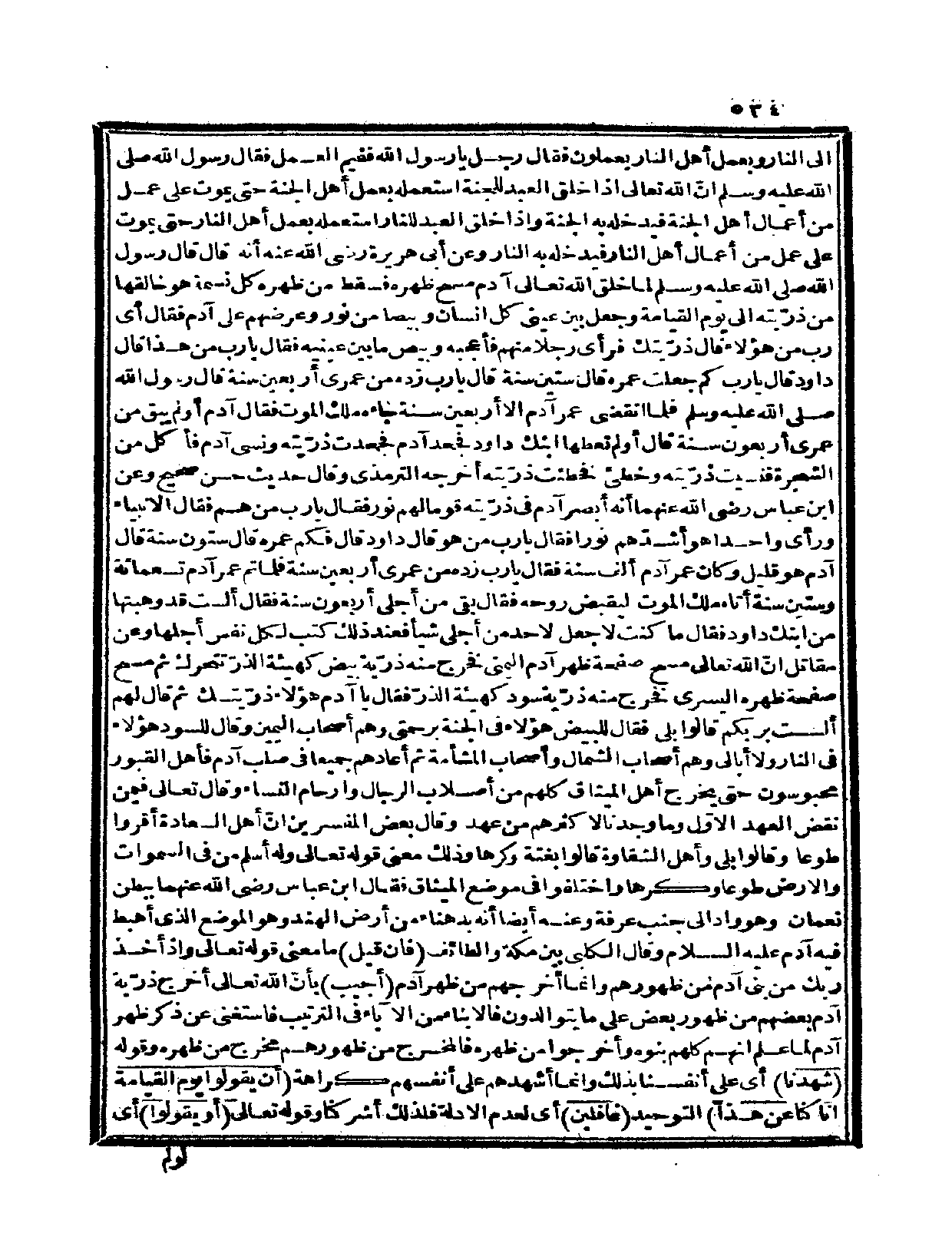 وعن مقاتل أنّ الله تعالى مسح صفحة ظهر آدم اليمنى، فخرج منه ذرّية بيض كهيئة الذرّ تتحرك، ثم مسح صفحة ظهره اليسرى، فخرج منه ذرّية سود كهيئة الذرّ، فقال: يا آدم هؤلاء ذرّيتك، ثم قال لهم: ألست بربكم، قالوا: بلى، فقال للبيض: هؤلاء في الجنة برحمتي، وهم أصحاب اليمين، وقال للسود: هؤلاء في النار، ولا أبالي، وهم أصحاب الشمال وأصحاب المشأمة، ثم أعادهم جميعاً في صلب آدم، فأهل القبور محبوسون حتى يخرج أهل الميثاق كلهم من أصلاب الرجال وأرحام النساء، وقال تعالى فيمن نقض العهد الأوّل {وما وجدنا لأكثرهم من عهد} (الأعراف، 102)