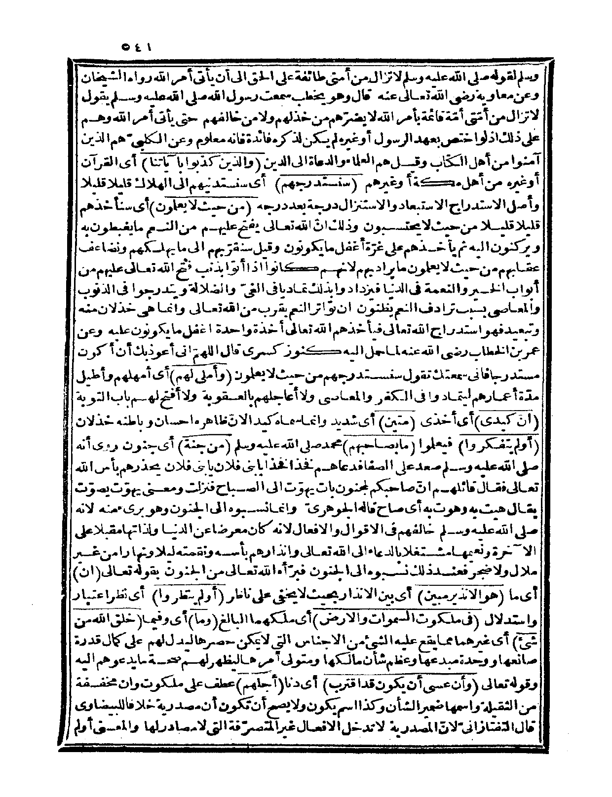 روي أنه صلى الله عليه وسلم صعد على الصفا فدعاهم فخذاً فخذاً يا بني فلان يا بني فلان يحذرهم بأس الله تعالى فقال قائلهم: إنّ صاحبكم لمجنون بات يهوّت إلى الصباح، فنزلت، ومعنى: يهوّت: يصوّت، يقال: هيت به وهوت به أي: صاح قاله الجوهريّ، وإنما نسبوه إلى الجنون وهو بريء منه؛ لأنه صلى الله عليه وسلم خالفهم في الأقوال والأفعال؛ لأنه كان معرضاً عن الدنيا ولذاتها مقبلاً على الآخرة ونعيمها مشتغلاً بالدعاء إلى الله تعالى وإنذارهم بأسه ونقمته ليلاً ونهاراً من غير ملال ولا ضجر، فعند ذلك نسبوه إلى الجنون، فبرّأه الله تعالى من الجنون بقوله تعالى: {إن} أي: ما {هو إلا نذير مبين} أي: بين الإنذار بحيث لا يخفى على ناظر {أولم ينظروا} أي: نظر اعتبار واستدلال {في ملكوت السموات والأرض} أي: ملكهما البالغ {وما} أي: وفيما {خلق الله من شيء} أي: غيرهما مما يقع عليه الشيء من الأجناس التي لا يمكن حصرها ليدل لهم على كمال قدرة صانعها ووحدة مبدعها وعظم شأن مالكها ومتولي أمرها؛ ليظهر لهم صحة ما يدعوهم إليه، وقوله تعالى: {وأن عسى أن يكون قد اقترب} أي: دنا {أجلهم} عطف على ملكوت، وأن مخففة من الثقيلة، واسمها ضمير الشأن وكذا اسم يكون ولا يصح أن تكون أن مصدرية خلافاً للبيضاوي قال التفتازانيّ: لأنّ المصدرية لا تدخل الأفعال غير المتصرّفة التي لا مصادر لها، والمعنى أولم