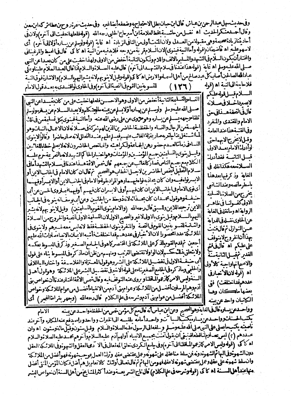 النِّسَاءِ وَالتَّسْلِيمَةُ الثَّانِيَةُ أَخْفَضُ مِنْ الْأُولَى وَهُوَ الْأَحْسَنُ فَلَعَلَّهَا خُفِيَتْ عَلَى مَنْ كَانَ بَعِيدًا عَنْ النَّبِيِّ - صَلَّى اللَّهُ عَلَيْهِ وَسَلَّمَ - وَلَوْ سَلَّمَ عَنْ يَسَارِهِ أَوَّلًا يُسَلِّمُ عَنْ يَمِينِهِ مَا لَمْ يَتَكَلَّمْ وَلَا يُعِيدُ السَّلَامَ عَنْ يَسَارِهِ وَلَوْ سَلَّمَ تِلْقَاءَ وَجْهِهِ يُسَلِّمُ عَنْ يَسَارِهِ وَهُوَ مَرْوِيٌّ عَنْ عَلِيٍّ - رَضِيَ اللَّهُ عَنْهُ -، وَأَمَّا النِّيَّةُ فَيَنْوِي بِكُلِّ تَسْلِيمَةٍ مَنْ فِي تِلْكَ الْجِهَةِ مِنْ الرِّجَالِ وَالنِّسَاءِ وَالْحَفَظَةِ الْحَاضِرِينَ الَّذِينَ لَهُمْ شَرِكَةٌ فِي صَلَاتِهِ؛ لِأَنَّ الْأَعْمَالَ بِالنِّيَّاتِ وَهُوَ لَمَّا اشْتَغَلَ بِمُنَاجَاةِ رَبِّهِ صَارَ بِمَنْزِلَةِ الْغَائِبِ عَنْهُمْ فَيُسَلِّمُ عَلَيْهِمْ عِنْدَ التَّحَلُّلِ؛ لِأَنَّهُ صَارَ حَاضِرًا وَقَالُوا لَا يَنْوِي النِّسَاءَ فِي زَمَانِنَا لِعَدَمِ حُضُورِهِنَّ الْجَمَاعَةَ وَلِكَرَاهِيَتِهِ وَإِنَّمَا خُصَّ الْحَاضِرُونَ؛ لِأَنَّهُ لَا يَصْلُحُ خِطَابًا لِلْغَائِبَيْنِ وَقِيلَ يَنْوِي بِالتَّسْلِيمَتَيْنِ جَمِيعَ الْمُؤْمِنِينَ وَالْمُؤْمِنَاتِ وَهُوَ اخْتِيَارُ الْحَاكِمِ الشَّهِيدِ؛ لِأَنَّهُ بِالتَّحْرِيمَةِ حَرُمَ عَلَيْهِ الْكَلَامُ مَعَ جَمِيعِ النَّاسِ فَصَارَ كَالْغَائِبِ عَنْ جَمِيعِهِمْ قَالَ شَمْسُ الْأَئِمَّةِ هَذَا عِنْدَنَا فِي سَلَامِ التَّشَهُّدِ، أَمَّا فِي سَلَامِ التَّحْلِيلِ فَيَخُصُّ الْحَاضِرِينَ لِأَجْلِ الْخِطَابِ هُوَ الصَّحِيحُ، ثُمَّ قَالَ: إنْ كَانَ الْإِمَامُ فِي الْجَانِبِ الْأَيْمَنِ أَوْ الْأَيْسَرِ نَوَاهُ فِيهِ وَإِنْ كَانَ يُحَاذِيهِ نَوَاهُ فِيهِمَا وَهُوَ الْمُرَادُ بِقَوْلِهِ وَالْإِمَامُ فِي الْجَانِبِ الْأَيْمَنِ أَوْ الْأَيْسَرِ أَوْ فِيهِمَا أَيْ نَوَى الْإِمَامُ فِي الْجَانِبِ الْأَيْمَنِ إنْ كَانَ فِيهِمْ أَوْ فِي الْأَيْسَرِ إنْ كَانَ فِيهِمْ أَوْ فِيهِمَا فِيمَا رَوَى الْحَسَنُ عَنْ أَبِي حَنِيفَةَ وَهُوَ قَوْلُ مُحَمَّدٍ إنْ كَانَ بِحِذَائِهِ؛ لِأَنَّهُ ذُو حَظٍّ مِنْ الْجَانِبَيْنِ وَعَنْ أَبِي يُوسُفَ أَنَّهُ يَنْوِيهِ فِي الْجَانِبِ الْأَيْمَنِ تَرْجِيحًا لِلْأَيْمَنِ وَلِلسَّبْقِ قَالَ - رَحِمَهُ اللَّهُ - (وَالْإِمَامُ يَنْوِي الْقَوْمَ بِالتَّسْلِيمَتَيْنِ) وَقِيلَ: لَا يَنْوِيهِمْ؛ لِأَنَّهُ يُشِيرُ إلَيْهِمْ بِالسَّلَامِ وَقِيلَ: يَنْوِي بِالْأُولَى لَا غَيْرُ وَالصَّحِيحُ الْأَوَّلُ؛ لِأَنَّ التَّسْلِيمَةَ الْأُولَى لِلتَّحِيَّةِ وَالْخُرُوجِ مِنْ الصَّلَاةِ وَالثَّانِيَةَ لِلتَّسْوِيَةِ بَيْنَ الْقَوْمِ فِي التَّحِيَّةِ وَالْمُنْفَرِدُ يَنْوِي الْحَفَظَةَ فَقَطْ؛ لِأَنَّهُ لَيْسَ مَعَهُ غَيْرُهُمْ وَلَا يَنْوِي فِي الْمَلَائِكَةِ عَدَدًا مَحْصُورًا؛ لِأَنَّ الْأَخْبَارَ فِي عَدَدِهِمْ قَدْ اُخْتُلِفَتْ فَأَشْبَهَ الْإِيمَانَ بِالْأَنْبِيَاءِ - صَلَوَاتُ اللَّهِ عَلَيْهِمْ أَجْمَعِينَ -، ثُمَّ قَدَّمَ الْقَوْمَ بِالذِّكْرِ عَلَى الْمَلَائِكَةِ فِي الْمُخْتَصَرِ كَمَا هُوَ فِي الْجَامِعِ الصَّغِيرِ. وَذَكَرَ فِي الْمَبْسُوطِ بِعَكْسِهِ وَلَا يَتَعَلَّقُ بِذَلِكَ حُكْمٌ؛ لِأَنَّ الْوَاوَ لَا تَقْتَضِي التَّرْتِيبَ وَمِنْهُمْ مَنْ ظَنَّ أَنَّ مَا ذَكَرَهُ فِي الْمَبْسُوطِ بِنَاءً عَلَى قَوْلِ أَبِي حَنِيفَةَ الْأَوَّلِ فِي تَفْضِيلِ الْمَلَائِكَةِ عَلَى الْبَشَرِ وَهُوَ قَوْلُ الْمُعْتَزِلَةِ وَالْفَلَاسِفَةِ وَاخْتَارَهُ الْبَاقِلَّانِيُّ وَالْحَلِيمِيُّ وَمَا ذَكَرَهُ فِي الْجَامِعِ الصَّغِيرِ بِنَاءً عَلَى قَوْلِهِ الْأَخِيرِ فِي تَفْضِيلِ الْبَشَرِ عَلَى الْمَلَائِكَةِ وَهُوَ قَوْلُ أَ