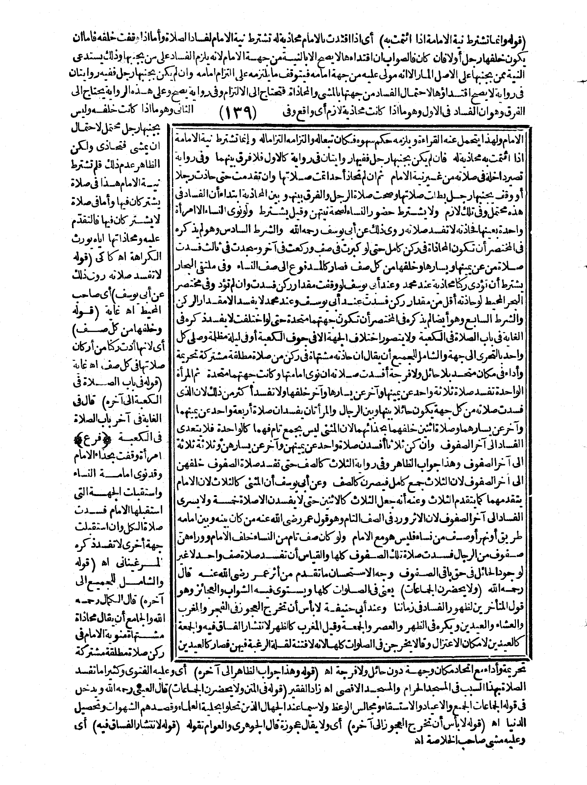 ـــــــــــــــــــــــــــــQقَوْلُهُ وَإِنَّمَا تُشْتَرَطُ نِيَّةُ الْإِمَامَةِ إذَا ائْتَمَّتْ بِهِ) أَيْ إذَا اقْتَدَتْ بِالْإِمَامِ مُحَاذِيَةً لَهُ تُشْتَرَطُ نِيَّةُ الْإِمَامِ لِفَسَادِ الصَّلَاةِ، وَأَمَّا إذَا وَقَفَتْ خَلْفَهُ فَإِمَّا أَنْ يَكُونَ خَلْفَهَا رَجُلٌ أَوْ لَا فَإِنْ كَانَ فَالصَّوَابُ أَنَّ اقْتِدَاءَهَا لَا يَصِحُّ إلَّا بِالنِّيَّةِ مِنْ جِهَةِ الْإِمَامِ؛ لِأَنَّهُ يَلْزَمُ الْفَسَادُ عَلَى مَنْ بِجَنْبِهَا وَذَلِكَ يَسْتَدْعِي النِّيَّةَ مِمَّنْ بِجَنْبِهَا عَلَى الْأَصْلِ الْمَارِّ إلَّا أَنَّهُ مَوْلَى عَلَيْهِ مِنْ جِهَةِ إمَامِهِ فَيَتَوَقَّفُ مَا يَلْتَزِمُهُ عَلَى الْتِزَامِ إمَامِهِ وَإِنْ لَمْ يَكُنْ بِجَنْبِهَا رَجُلٌ فَفِيهِ رِوَايَتَانِ فِي رِوَايَةٍ لَا يَصِحُّ اقْتِدَاؤُهَا لِاحْتِمَالِ الْفَسَادِ مِنْ جِهَتِهَا بِالْمَشْيِ وَالْمُحَاذَاةِ فَتَحْتَاجُ إلَى الِالْتِزَامِ وَفِي رِوَايَةٍ يَصِحُّ وَعَلَى هَذِهِ الرِّوَايَةِ يَحْتَاجُ إلَى الْفَرْقِ وَهُوَ أَنَّ الْفَسَادَ فِي الْأَوَّلِ وَهُوَ مَا إذَا كَانَتْ مُحَاذِيَةً لَازِمٌ أَيْ وَاقِعٌ وَفِي الثَّانِي وَهُوَ مَا إذَا كَانَتْ خَلْفَهُ وَلَيْسَ بِجَنْبِهَا رَجُلٌ مُحْتَمِلٌ لِاحْتِمَالِ أَنْ يَمْشِيَ فَتَحَاذَى وَلَكِنَّ الظَّاهِرَ عَدَمُ ذَلِكَ فَلَمْ تُشْتَرَطْ نِيَّةُ الْإِمَامِ هَذَا فِي صَلَاةٍ يَشْتَرِكَانِ فِيهَا، وَأَمَّا فِي صَلَاةٍ لَا يَشْتَرِكَانِ فِيهَا فَالتَّقَدُّمُ عَلَيْهِ وَمُحَاذَاتُهَا إيَّاهُ يُورِثُ الْكَرَاهَةَ. اهـ. كَاكِيٌّ (قَوْلُهُ لَا تَفْسُدُ صَلَاتُهُ رَوَى ذَلِكَ عَنْ أَبِي يُوسُفَ) أَيْ صَاحِبُ الْمُحِيطِ. اهـ. غَايَةٌ (قَوْلُهُ وَخَلَفَهَا مِنْ كُلِّ صَفٍّ) أَيْ؛ لِأَنَّهَا أَدَّتْ رُكْنًا مِنْ أَرْكَانِ صَلَاتِهَا فِي كُلِّ صَفٍّ. اهـ. غَايَةٌ (قَوْلُهُ فِي بَابِ الصَّلَاةِ فِي الْكَعْبَةِ إلَى آخِرِهِ) قَالَ فِي الْغَايَةِ فِي آخَرِ بَابِ الصَّلَاةِ فِي الْكَعْبَةِ. (فَرْعٌ) امْرَأَةٌ وَقَفَتْ بِحِذَاءِ الْإِمَامِ وَقَدْ نَوَى إمَامَةَ النِّسَاءِ وَاسْتَقْبَلَتْ الْجِهَةَ الَّتِي اسْتَقْبَلَهَا الْإِمَامُ فَسَدَتْ صَلَاةُ الْكُلِّ وَإِنْ اسْتَقْبَلَتْ جِهَةً أُخْرَى لَا تَفْسُدُ ذَكَرَهُ الْمَرْغِينَانِيُّ. اهـ. (قَوْلُهُ وَالشَّامِلُ لِلْجَمِيعِ إلَى آخِرِهِ) قَالَ الْكَمَالُ - رَحِمَهُ اللَّهُ - وَالْجَامِعُ أَنْ يُقَالَ: مُحَاذَاةٌ مُشْتَهَاةٌ مَنْوِيَّةُ الْإِمَامِ فِي رُكْنِ صَلَاةٍ مُطْلَقَةٍ مُشْتَرَكَةٍ تَحْرِيمَةٌ وَأَدَاءٌ مَعَ اتِّحَادِ مَكَان وَجِهَةٍ دُونَ حَائِلٍ وَلَا فُرْجَةٍ. اهـ. (قَوْلُهُ وَهَذَا جَوَابُ الظَّاهِرِ إلَى آخِرِهِ) أَيْ وَعَلَيْهِ الْفَتْوَى وَكَثِيرًا مَا تَفْسُدُ الصَّلَاةُ بِهَذَا السَّبَبِ فِي الْمَسْجِدِ الْحَرَامِ وَالْمَسْجِدِ الْأَقْصَى اهـ زَادَ الْفَقِيرُ (قَوْلُهُ فِي الْمَتْنِ: وَلَا يَحْضُرْنَ الْجَمَاعَاتِ) قَالَ الْعَيْنِيُّ - رَحِمَهُ اللَّهُ - وَيَدْخُلُ فِي قَوْلِهِ الْجَمَاعَاتِ الْجُمَعُ وَالْأَعْيَادُ وَالِاسْتِسْقَاءُ وَمَجَالِسُ الْوَعْظِ وَلَا سِيَّمَا عِنْدَ الْجُهَّالِ الَّذِينَ تَحَلَّوْا بِحِلْيَةِ الْعُلَمَاءِ وَقَصْدُهُمْ الشَّهَوَاتِ وَتَحْصِيلَ الدُّنْيَا. اهـ. (قَوْلُهُ لَا بَأْسَ أَنْ تَخْرُجَ الْعَجُوزُ إلَى آخِرِهِ) أَيْ وَلَا يُقَالُ عَجُوزَةٌ قَالَ الْجَوْهَرِيُّ وَالْعَوَامُّ تَقُولُهُ (قَوْلُهُ لِانْتِشَارِ الْفُسَّاقِ فِيهِ) أَيْ وَعَلَيْهِ مَشَى صَاحِبُ الْخُلَاصَةِ اهـ