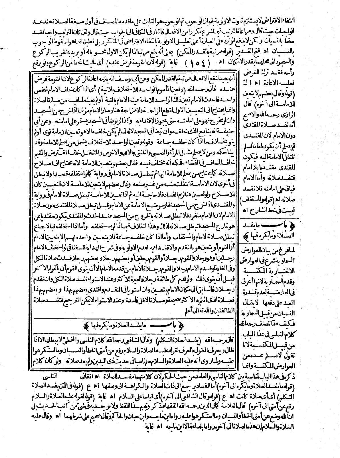 (بَابُ مَا يُفْسِدُ الصَّلَاةَ وَمَا يُكْرَهُ فِيهَا) لَمَّا فَرَغَ مِنْ بَيَانِ الْعَوَارِضِ السَّمَاوِيَّةِ شَرَعَ فِي الْعَوَارِضِ الِاخْتِيَارِيَّةِ الْمُكْتَسَبَةِ وَقَدَّمَ السَّمَاوِيَّةَ؛ لِأَنَّهَا أَعْرَقُ فِي الْعَارِضِيَّةِ لِعَدَمِ قُدْرَةِ الْعَبْدِ عَلَى دَفْعِهَا لَا يُقَالُ النِّسْيَانُ مِنْ قَبِيلِ السَّمَاوِيَّةِ فَكَيْفَ عَدَّ الْمُصَنِّفُ - رَحِمَهُ اللَّهُ - كَلَامَ النَّاسِي فِي هَذَا الْبَابِ مِنْ قَبِيلِ الْمُكْتَسَبَةِ؛ لِأَنَّا نَقُولُ: لَا نُسَلِّمُ عَدَّهُ مِنْ الْعَوَارِضِ الْمُكْتَسَبَةِ وَإِنَّمَا ذَكَرَهُ فِي هَذَا الْبَابِ لِمُنَاسِبَةٍ بَيْنَ كَلَامِ النَّاسِي وَالْعَامِدِ مِنْ حَيْثُ الْحُكْمُ؛ لِأَنَّ كُلًّا مِنْهُمَا مُفْسِدٌ لِلصَّلَاةِ. اهـ. أَتْقَانِيٌّ (قَوْلُهُ مَا يُفْسِدُ الصَّلَاةَ وَمَا يُكْرَهُ إلَى آخِرِهِ) أَمَّا الْفَسَادُ يَرْجِعُ إلَى ذَاتِ الصَّلَاةِ وَالْكَرَاهَةُ إلَى وَصْفِهَا. اهـ. ع (قَوْلُهُ فِي الْمَتْنِ: يُفْسِدُ الصَّلَاةَ التَّكَلُّمُ) أَيْ أَيَّ صَلَاةٍ كَانَتْ. اهـ. ع (قَوْلُهُ وَقَالَ الشَّافِعِيُّ إلَى آخِرِهِ) أَيْ قِيَاسًا عَلَى السَّلَامِ. اهـ. غَايَةٌ (قَوْلُهُ لِقَوْلِهِ - عَلَيْهِ الصَّلَاةُ وَالسَّلَامُ - رُفِعَ عَنْ أُمَّتِي إلَى آخِرِهِ) قَالَ الْعَلَّامَةُ كَمَالُ الدِّينِ - رَحِمَهُ اللَّهُ - الْفُقَهَاءُ يَذْكُرُونَهُ بِهَذَا اللَّفْظِ وَلَا يُوجَدُ بِهِ فِي شَيْءٍ مِنْ كُتُبِ الْحَدِيثِ بَلْ «إنَّ اللَّهَ وَضَعَ عَنْ أُمَّتِي الْخَطَأَ وَالنِّسْيَانَ وَمَا اُسْتُكْرِهُوا عَلَيْهِ» رَوَاهُ ابْنُ مَاجَهْ وَابْنُ حِبَّانَ وَالْحَاكِمُ وَقَالَ صَحِيحٌ عَلَى شَرْطِهِمَا اهـ. وقَالَ - عَلَيْهِ الصَّلَاةُ وَالسَّلَامُ - إنَّ هَذِهِ الصَّلَاةَ إلَى آخِرِهِ رَوَاهُ الْجَمَاعَةُ إلَّا ابْنَ مَاجَهْ. اهـ. غَايَةٌ