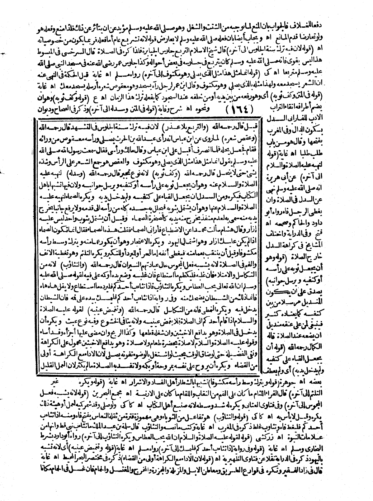 ـــــــــــــــــــــــــــــQدَفْعًا لِلْخِلَافِ. فَالْجَوَابُ بِأَنَّ الْمَنْعَ لِمَا يُوجِبُهُ مِنْ الشَّتِّ وَالشُّغْلِ وَهُوَ - صَلَّى اللَّهُ عَلَيْهِ وَسَلَّمَ - مُؤَيَّدٌ عَنْ أَنْ يَتَأَثَّرَ عَنْ ذَلِكَ فَلِذَا مَنَعَ وَفَعَلَهُ هُوَ وَلَوْ تَعَارَضَا قُدِّمَ الْمَانِعُ اهـ وَيُجَابُ أَيْضًا بِأَنَّ فِعْلَهُ - صَلَّى اللَّهُ عَلَيْهِ وَسَلَّمَ - لَا يُعَارِضُ قَوْلَهُ؛ لِأَنَّهُ تَشْرِيعٌ عَامٌّ أَمَّا فِعْلُهُ فَرُبَّمَا يَكُونُ مِنْ خُصُوصِيَّاتِهِ اهـ (قَوْلُهُ؛ لِأَنَّ فِيهِ تَرْكَ سُنَّةِ الْجُلُوسِ إلَى آخِرِهِ) قَالَ شَيْخُ الْإِسْلَامِ التَّرَبُّعُ جُلُوسُ الْجَبَابِرَةِ فَلِذَا كُرِهَ فِي الصَّلَاةِ قَالَ السَّرَخْسِيُّ فِي الْمَبْسُوطِ هَذَا لَيْسَ بِقَوِيٍّ «فَإِنَّهُ - صَلَّى اللَّهُ عَلَيْهِ وَسَلَّمَ - كَانَ يَتَرَبَّعُ فِي جُلُوسِهِ فِي بَعْضِ أَحْوَالِهِ»، وَكَذَا جُلُوسُ عُمَرَ - رَضِيَ اللَّهُ عَنْهُ - فِي مَسْجِدِ النَّبِيِّ - صَلَّى اللَّهُ عَلَيْهِ وَسَلَّمَ - مُتَرَبِّعًا. اهـ. كَاكِيٌّ (قَوْلُهُ «إنَّمَا مِثْلُ هَذَا مِثْلُ الَّذِي يُصَلِّي وَهُوَ مَكْتُوفٌ» إلَى آخِرِهِ) رَوَاهُ مُسْلِمٌ. اهـ. غَايَةٌ. قِيلَ الْحِكْمَةُ فِي النَّهْيِ عَنْهُ أَنَّ الشَّعْرَ يَسْجُدُ مَعَهُ وَلِهَذَا مِثْلُهُ بِاَلَّذِي يُصَلِّي وَهُوَ مَكْتُوفٌ وَقَالَ ابْنُ عُمَرَ لِرَجُلٍ رَآهُ يَسْجُدُ وَهُوَ مَعْقُوصٌ شَعْرُهُ أَرْسِلْهُ يَسْجُدُ مَعَك. اهـ. غَايَةٌ (قَوْلُهُ فِي الْمَتْنِ وَكَفُّ ثَوْبِهِ) أَيْ وَهُوَ رَفْعُهُ مِنْ بَيْنِ يَدَيْهِ أَوْ مِنْ خَلْفِهِ عِنْدَ السُّجُودِ كَمَا يَفْعَلُهُ تُرْكُ هَذَا الزَّمَانِ اهـ ع (قَوْلُهُ وَكَفُّ ثَوْبِهِ) وَهُوَ أَنْ يَضُمَّ أَطْرَافَهُ اتِّقَاءَ التُّرَابِ وَنَحْوِهِ. اهـ شَرْحُ وِقَايَةٍ. (قَوْلُهُ فِي الْمَتْنِ: وَسَدْلُهُ إلَى آخِرِهِ) وَذَكَرَ فِي الصِّحَاحِ وَدِيوَانِ الْأَدَبِ لِلْفَارَابِيِّ السَّدْلُ بِسُكُونِ الدَّالِ وَفِي الْمُغْرِبِ بِفَتْحِهَا وَقَالَ هُوَ مِنْ بَابِ طَلَبَ طَلَبًا. اهـ. غَايَةٌ. (قَوْلُهُ لِنَهْيِهِ - عَلَيْهِ الصَّلَاةُ وَالسَّلَامُ - إلَى آخِرِهِ) عَنْ أَبِي هُرَيْرَةَ أَنَّهُ - صَلَّى اللَّهُ عَلَيْهِ وَسَلَّمَ - «نَهَى عَنْ السَّدْلِ فِي الصَّلَاةِ وَأَنْ يُغَطِّيَ الرَّجُلُ فَاهُ» رَوَاهُ أَبُو دَاوُد وَالْحَاكِمُ وَصَحَّحَهُ. اهـ. فَتْحٌ وَفِي الدِّرَايَةِ وَاخْتَلَفَ الْمَشَايِخُ فِي كَرَاهَةِ السَّدْلِ خَارِجَ الصَّلَاةِ. (قَوْلُهُ وَهُوَ أَنْ يَجْعَلَ ثَوْبَهُ عَلَى رَأْسِهِ أَوْ كَتِفَيْهِ وَيُرْسِلَ جَوَانِبَهُ) يَصْدُقُ عَلَى أَنْ يَكُونَ الْمِنْدِيلُ مُرْسَلًا مِنْ بَيْنِ كَتِفَيْهِ كَمَا يَعْتَادُهُ كَثِيرٌ فَيَنْبَغِي لِمَنْ عَلَى عُنُقِهِ مِنْدِيلٌ أَنْ يَضَعَهُ عِنْدَ الصَّلَاةِ قَالَهُ الْكَمَالُ - رَحِمَهُ اللَّهُ - (قَوْلُهُ أَنْ يَجْعَلَ الْقَبَاءَ عَلَى كَتِفَيْهِ وَلَمْ يُدْخِلْ يَدَيْهِ) أَيْ وَلَمْ يَعْطِفْ بَعْضُهُ. اهـ. جَوْهَرَةٌ. (قَوْلُهُ وَيَتْرُكُ وَسَطَ رَأْسِهِ مَكْشُوفًا) تَشْبِيهًا بِالشُّطَّارِ أَهْلَ الْفَسَادِ. اهـ. غَايَةٌ. (قَوْلُهُ وَيُكْرَهُ التَّلَثُّمُ إلَى آخِرِهِ) قَالَ الْفَرَّاءُ اللِّثَامُ مَا كَانَ عَلَى الْفَمِ مِنْ النِّقَابِ وَاللِّقَامُ مَا كَانَ عَلَى الْأَرْنَبَةِ. اهـ. مَجْمَعُ الْبَحْرَيْنِ (قَوْلُهُ: لِأَنَّهُ يُشْبِهُ فِعْلَ الْمَجُوسِ إلَى آخِرِهِ) وَفِي فَتَاوَى الْعَتَّابِيِّ وَيُكْرَهُ لَهُ شَدُّ وَسَطِهِ؛ لِأَنَّهُ صَنِيعُ أَهْلِ الْكِتَابِ. اهـ. كَاكِيٌّ وَلَوْ صَلَّى وَقَدْ شَمَّرَ كُمَّيْهِ لِعَمَلٍ أَوْ هَيْئَةٍ ذَلِكَ يُكْرَهُ وَقِيلَ لَا بَأْسَ بِهِ. اهـ. كَاكِيٌّ. (قَوْلُهُ وَالتَّثَاؤُبُ) هُوَ تَفَاعُلٌ مِنْ الثَ
