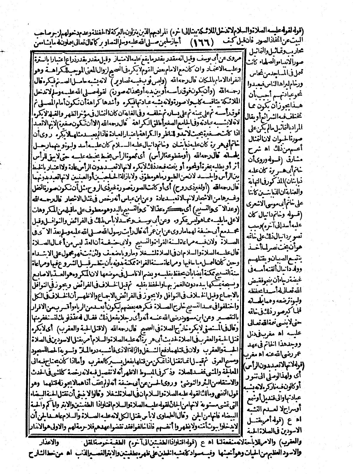 ـــــــــــــــــــــــــــــQقَوْلُهُ لِقَوْلِهِ - عَلَيْهِ الصَّلَاةُ وَالسَّلَامُ - «لَا تَدْخُلُ الْمَلَائِكَةُ بَيْتًا» إلَى آخِرِهِ) الْمُرَادُ بِهِمْ الَّذِينَ يَنْزِلُونَ بِالْبَرَكَةِ لَا الْحَفَظَةُ وَعَدَمُ دُخُولِهِمْ لِزَجْرِ صَاحِبِ الْبَيْتِ عَنْ اتِّخَاذِ الصُّوَرِ. فَإِنْ قِيلَ كَيْفَ وَأَجَازَ سُلَيْمَانُ - صَلَّى اللَّهُ عَلَيْهِ وَسَلَّمَ - التَّصَاوِيرَ كَمَا قَالَ تَعَالَى {يَعْمَلُونَ لَهُ مَا يَشَاءُ مِنْ مَحَارِيبَ وَتَمَاثِيلَ} [سبأ: 13] وَالتَّمَاثِيلُ صُوَرُ الْأَنْبِيَاءِ وَالصُّلَحَاءِ كَانَتْ تُعْمَلُ فِي الْمَسَاجِدِ مِنْ نُحَاسٍ وَرُخَامٍ لِيَرَاهَا النَّاسَ، فَيَعْبُدُوا نَحْوَ عِبَادَتِهِمْ أُجِيبَ بِأَنَّ هَذَا يَجُوزُ أَنْ يَكُونَ مِمَّا تَخْتَلِفُ فِيهِ الشَّرَائِعُ أَوْ يُقَالُ الْمُرَادُ بِالتَّمَاثِيلِ مَا لَمْ يَكُنْ عَلَى صُورَةِ الْحَيَوَانِ؛ لِأَنَّ التِّمْثَالَ أَعَمُّ، مِنْ ذَلِكَ. اهـ. شَرْحُ مَشَارِقَ. (قَوْلُهُ وَرُوِيَ أَنَّ خَاتَمَ أَبِي هُرَيْرَةَ كَانَ عَلَيْهِ ذُبَابَتَانِ) الْمَذْكُورَةُ فِي النِّهَايَةِ وَالْعِنَايَةِ أَنَّ الذُّبَابَتَيْنِ كَانَتَا عَلَى خَاتَمِ أَبِي مُوسَى الْأَشْعَرِيِّ (قَوْلُهُ وَخَاتَمُ دَانْيَالَ كَانَ عَلَيْهِ أَسَدٌ إلَى آخِرِهِ) وَسَبَبُ تَصْوِيرِ دَانْيَالَ ذَلِكَ عَلَى خَاتَمِهِ هُوَ أَنْ بُخْتَ نَصَّرَ لَمَّا أَخَذَ بِتَتَبُّعِ الصَّبِيَّانِ، وَيَقْتُلُهُمْ وَوُلِدَ دَانْيَالَ، أَلْقَتْهُ أُمُّهُ فِي غَيْضَةٍ رَجَاءَ أَنْ يَنْجُوَ فَقَيَّضَ اللَّهُ تَعَالَى لَهُ أَسَدًا يَحْفَظُهُ وَلَبْوَة تُرْضِعُهُ وَهُمَا يَلْحَسَانِهِ فَلَمَّا كَبِرَ صَوَّرَ ذَلِكَ فِي خَاتَمِهِ حَتَّى لَا يَنْسَى نِعْمَةَ اللَّهِ تَعَالَى عَلَيْهِ اهـ مُغْرِبٌ فِي دنل وَوُجِدَ هَذَا الْخَاتَمُ فِي عَهْدِ عُمَرَ - رَضِيَ اللَّهُ عَنْهُ -. اهـ. مُغْرِبٌ. (قَوْلُهُ: لِأَنَّهَا لَا تُعْبَدُ بِدُونِ الرَّأْسِ) أَيْ وَلِهَذَا لَوْ صَلَّى إلَى تَنُّورٍ أَوْ كَانُونٍ فِيهِ نَارٌ كُرِهَ؛ لِأَنَّهُ يُشْبِهُ عِبَادَتَهَا وَإِلَى قِنْدِيلٍ أَوْ شَمْعٍ أَوْ سِرَاجٍ لَا لِعَدَمِ التَّشَبُّهِ اهـ ع (قَوْلُهُ أَمَرَ بِقَتْلِ الْأَسْوَدَيْنِ فِي الصَّلَاةِ الْحَيَّةَ وَالْعَقْرَبَ) وَالْأَمْرُ لِلْإِبَاحَةِ؛ لِأَنَّهُ مَنْفَعَةٌ لَنَا اهـ ع (قَوْلُهُ «اُقْتُلُوا ذَا الطُّفْيَتَيْنِ» إلَى آخِرِهِ) الطُّفْيَةُ خُوصَةُ الْمُقْلِ وَالْأَسْوَدُ الْعَظِيمُ مِنْ الْحَيَّاتِ وَهُوَ أَخْبَثُهَا وَفِيهِ سَوَادٌ كَأَنَّهُ شَبَهُ، الْخَطَّيْنِ عَلَى ظَهْرِهِ بِطُفْيَتَيْنِ وَالْأَبْتَرُ الْقَصِيرُ الذَّنَبِ اهـ مِنْ خَطِّ الشَّارِحِ