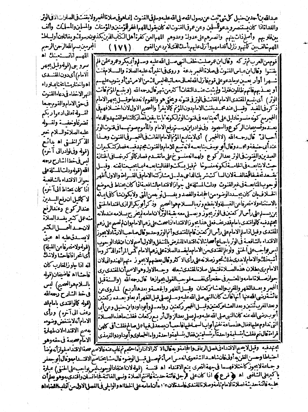 ـــــــــــــــــــــــــــــQعَبْدُ اللَّهِ بْنُ أَحْمَدَ بْنِ حَنْبَلٍ كُلُّ شَيْءٍ ثَبَتَ عَنْ رَسُولِ اللَّهِ - صَلَّى اللَّهُ عَلَيْهِ وَسَلَّمَ - فِي الْقُنُوتِ إنَّمَا هُوَ فِي صَلَاةِ الْفَجْرِ وَلَا يَقْنُتُ فِي الصَّلَوَاتِ إلَّا فِي الْوِتْرِ وَالْغَدَاةِ إذَا كَانَ يَسْتَنْصِرُ وَيَدْعُو لِلْمُسْلِمِينَ وَعَنْ عُمَرَ فِي الْقُنُوتِ أَنَّهُ كَانَ يَقُولُ اللَّهُمَّ اغْفِرْ لِلْمُؤْمِنِينَ وَالْمُؤْمِنَاتِ وَالْمُسْلِمِينَ وَالْمُسْلِمَاتِ وَأَلِّفْ بَيْنَ قُلُوبِهِمْ وَأَصْلِحْ ذَاتَ بَيْنِهِمْ وَانْصُرْهُمْ عَلَى عَدُوِّك وَعَدُوِّهِمْ اللَّهُمَّ الْعَنْ كَفَرَةَ أَهْلِ الْكِتَابِ الَّذِينَ يُكَذِّبُونَ رَسُولَك وَيُقَاتِلُونَ أَوْلِيَاءَك اللَّهُمَّ خَالِفْ بَيْنَ كَلِمَتِهِمْ وَزَلْزِلْ أَقْدَامَهُمْ وَأَنْزِلْ عَلَيْهِمْ بَأْسَك الَّذِي لَا يُرَدُّ عَنْ الْقَوْمِ الْمُجْرِمِينَ بِسْمِ اللَّهِ الرَّحْمَنِ الرَّحِيمِ اللَّهُمَّ إنَّا نَسْتَعِينُك. اهـ. سَرُوجِيٌّ (قَوْلُهُ وَقِيلَ يَجْهَرُ الْإِمَامُ) أَيْ دُونَ الْمُقْتَدِي اهـ وَاخْتَارَ مَشَايِخُنَا بِمَا وَرَاءَ النَّهْرِ الْإِخْفَاءَ فِي دُعَاءِ الْقُنُوتِ فِي حَقِّ الْإِمَامِ وَالْقَوْمِ جَمِيعًا لِقَوْلِهِ تَعَالَى {ادْعُوا رَبَّكُمْ تَضَرُّعًا وَخُفْيَةً} [الأعراف: 55] وَلِقَوْلِهِ - عَلَيْهِ الصَّلَاةُ وَالسَّلَامُ - «خَيْرُ الذِّكْرِ الْخَفِيُّ». اهـ. بَدَائِعُ. (قَوْلُهُ وَفِي نَوَادِرِ إلَى آخِرِهِ) لَيْسَ فِي خَطِّ الشَّارِحِ - رَحِمَهُ اللَّهُ - (قَوْلُهُ وَدَلَّتْ الْمَسْأَلَةُ عَلَى جَوَازِ الِاقْتِدَاءِ بِالشَّافِعِيَّةِ إذَا كَانَ يُحْتَاطُ إلَى آخِرِهِ) لَا كَمَا قِيلَ إنَّ رَفْعَ الْيَدَيْنِ عِنْدَ الرُّكُوعِ وَعِنْدَ الرَّفْعِ مِنْهُ عَمَلٌ كَثِيرٌ يُفْسِدُ الصَّلَاةَ؛ لِأَنَّ حَدَّ الْعَمَلِ الْكَثِيرِ لَا يَصْدُقُ عَلَيْهِ اهـ عَيْنِيٌّ (قَوْلُهُ وَلَا مُنْحَرِفًا عَنْ الْقِبْلَةِ) أَيْ انْحِرَافًا فَاحِشًا وَلَا شَكَّ أَنَّهُ إذَا جَاوَزَ الْمَغَارِبَ كَانَ فَاحِشًا. اهـ. قَاضِي خَانْ (قَوْلُهُ بِالسَّلَامِ هُوَ الصَّحِيحُ) لَيْسَ فِي خَطِّ الشَّارِحِ - رَحِمَهُ اللَّهُ - (قَوْلُهُ كَمَا لَوْ اقْتَدَى بِإِمَامٍ قَدْ رَعَفَ إلَى آخِرِهِ) وَرَأَى الْإِمَامُ أَنَّهُ لَا يُنْتَقَضُ وُضُوءُهُ بِهِ صَحَّ الِاقْتِدَاءُ؛ لِأَنَّ طَهَارَةَ الْإِمَامِ صَحِيحَةٌ فِي حَقِّهِ وَهُوَ مُجْتَهَدٌ فِيهِ وَقِيلَ لَا يَصِحُّ الِاقْتِدَاءُ فِي فَصْلِ الرُّعَافِ وَالْحِجَامَةِ وَبِهِ قَالَ الْأَكْثَرُ إلَّا إذَا رَآهُ احْتَجَمَ، ثُمَّ غَابَ عَنْهُ فَالْأَصَحُّ صِحَّةُ الِاقْتِدَاءِ لِجَوَازِ أَنَّهُ تَوَضَّأَ احْتِيَاطًا وَحُسْنِ الظَّنِّ بِهِ فَإِنْ شَهِدَ الشَّافِعِيُّ أَنَّهُ مَسَّ امْرَأَةً، ثُمَّ صَلَّى قَبْلَ الْوُضُوءِ قَالَ مَشَايِخُنَا صَحَّ الِاقْتِدَاءُ بِهِ وَقَالَ أَبُو جَعْفَرٍ وَجَمَاعَةٌ لَا يَجُوزُ كَاخْتِلَافِهِمَا فِي جِهَةِ التَّحَرِّي بِمَنْعِ الِاقْتِدَاءِ. اهـ. قُنْيَةٌ. (قَوْلُهُ؛ لِأَنَّ اعْتِقَادَ الْوُجُوبَ لَيْسَ بِوَاجِبٍ عَلَى الْحَنَفِيِّ) عِبَارَةُ بَاكِيرٌ عَلَى الشَّافِعِيِّ اهـ. (فَرْعٌ) إذَا كَانَ عَلَى الرَّجُلِ فَائِتَةٌ حَدِيثَةٌ فَافْتَتَحَ الصَّلَاةَ وَنَسِيَ الْفَائِتَةَ فَجَاءَ إنْسَانٌ وَاقْتَدَى بِهِ وَهُوَ يَعْلَمُ أَنَّ عَلَيْهِ فَائِتَةً حَدِيثَةً فَصَلَاةُ الْإِمَامِ تَامَّةٌ وَصَلَاةُ الْمُقْتَدِي فَاسِدَةٌ؛ لِأَنَّ عِنْدَهُ أَنَّ إمَامَهُ عَلَى الْخَطَأِ. اهـ. وَلْوَالَجِيُّ فِي الْفَصْلِ الْأَوَّلِ مِنْ آدَابِ الْقَضَاءِ. اهـ. .