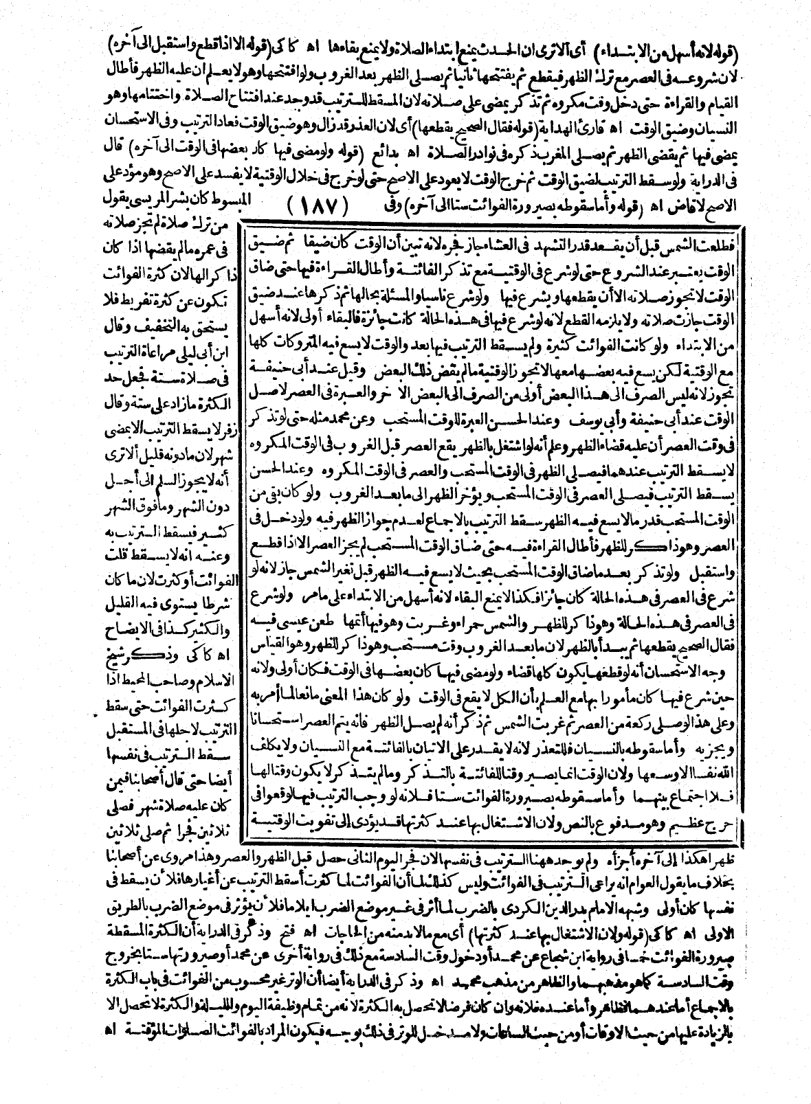 وَذَكَرَ شَيْخُ الْإِسْلَامِ وَصَاحِبُ الْمُحِيطِ إذَا كَثُرَتْ الْفَوَائِتُ حَتَّى سَقَطَ التَّرْتِيبُ لِأَجْلِهَا فِي الْمُسْتَقْبَلِ سَقَطَ التَّرْتِيبُ فِي نَفْسِهَا أَيْضًا حَتَّى قَالَ أَصْحَابُنَا فِيمَنْ كَانَ عَلَيْهِ صَلَاةُ شَهْرٍ فَصَلَّى ثَلَاثِينَ فَجْرًا، ثُمَّ صَلَّى ثَلَاثِينَ ظُهْرًا هَكَذَا إلَى آخِرِهِ أَجْزَأَهُ، وَلَمْ يُوجَدْ هَاهُنَا التَّرْتِيبُ فِي نَفْسِهَا؛ لِأَنَّ فَجْرَ الْيَوْمِ الثَّانِي حَصَلَ قَبْلَ الظُّهْرِ وَالْعَصْرِ، وَهَذَا مَرْوِيٌّ عَنْ أَصْحَابِنَا بِخِلَافِ مَا يَقُولُ الْعَوَامُّ أَنَّهُ يُرَاعَى التَّرْتِيبُ فِي الْفَوَائِتِ وَلَيْسَ كَذَلِكَ لِمَا أَنَّ الْفَوَائِتَ لَمَّا كَثُرَتْ أُسْقِطَ التَّرْتِيبُ عَنْ أَغْيَارِهَا؛ فَلَأَنْ يَسْقُطَ فِي نَفْسِهَا كَانَ أَوْلَى، وَشَبَّهَهُ الْإِمَامُ بَدْرُ الدِّينِ الْكُرْدِيُّ بِالضَّرْبِ لِمَا أَثَّرَ فِي غَيْرِ مَوْضِعِ الضَّرْبِ إيلَامًا فَلَأَنْ يُؤَثِّرَ فِي مَوْضِعِ الضَّرْبِ بِالطَّرِيقِ الْأَوْلَى. اهـ. كَاكِيٌّ (قَوْلُهُ: وَلِأَنَّ الِاشْتِغَالَ بِهَا عِنْدَ كَثْرَتِهَا) أَيْ مَعَ مَا لَا بُدَّ مِنْهُ مِنْ الْحَاجَاتِ. اهـ. فَتْحٌ وَذَكَرَ فِي الدِّرَايَةِ أَنَّ الْكَثْرَةَ الْمُسْقِطَةَ صَيْرُورَةُ الْفَوَائِتِ خَمْسًا فِي رَاوِيَةِ ابْنِ شُجَاعٍ عَنْ مُحَمَّدٍ أَوْ دُخُولُ وَقْتِ السَّادِسَةِ مَعَ ذَلِكَ فِي رِوَايَةٍ أُخْرَى عَنْ مُحَمَّدٍ أَوْ صَيْرُورَتُهَا سِتًّا بِخُرُوجِ وَقْتِ السَّادِسَةِ كَمَا هُوَ مَذْهَبُهُمَا.