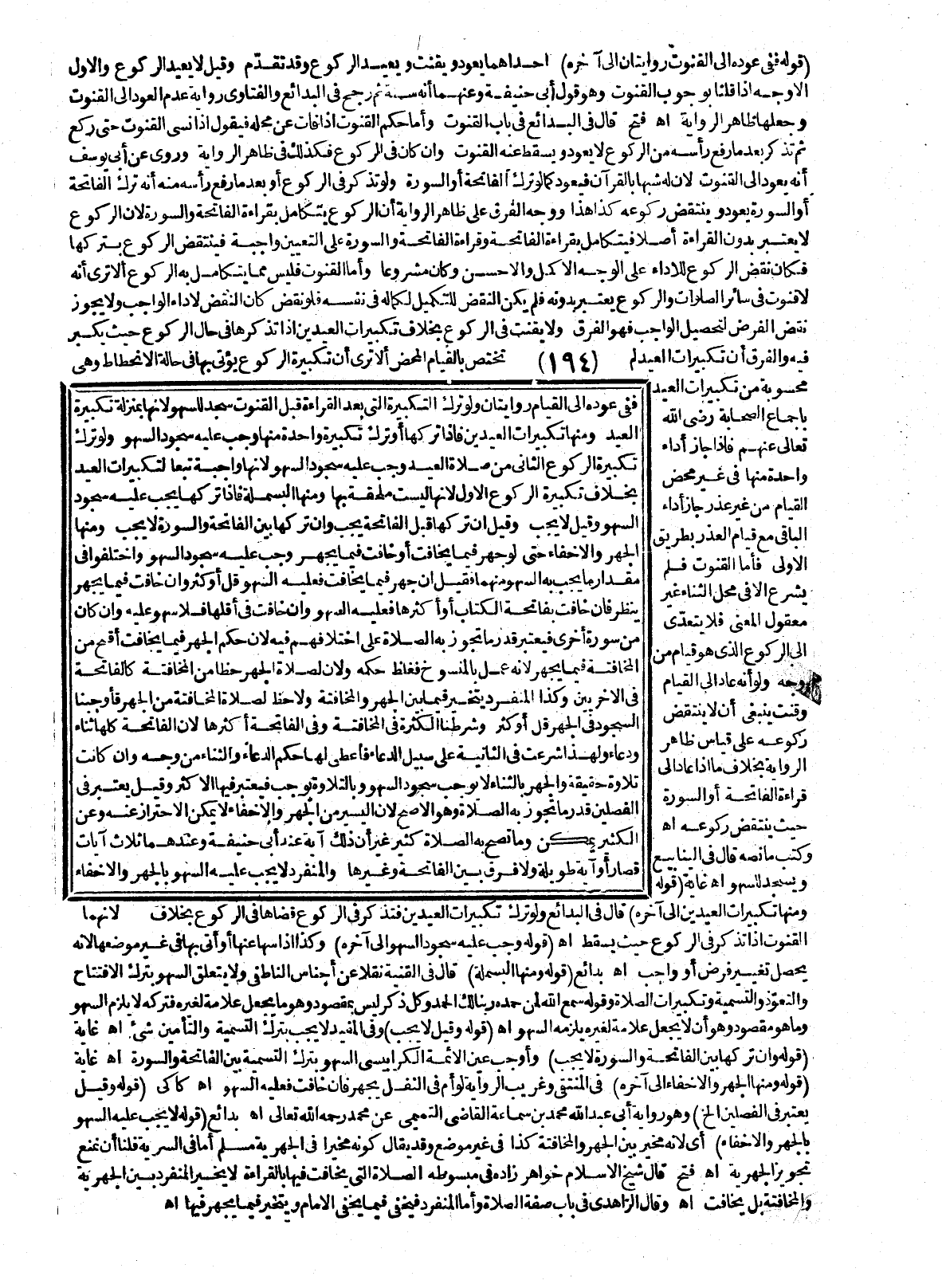 فَفِي عَوْدِهِ إلَى الْقِيَامِ رِوَايَتَانِ، وَلَوْ تَرَكَ التَّكْبِيرَةَ الَّتِي بَعْدَ الْقِرَاءَةِ قَبْلَ الْقُنُوتِ سَجَدَ لِلسَّهْوِ؛ لِأَنَّهَا بِمَنْزِلَةِ تَكْبِيرَةِ الْعِيدِ وَمِنْهَا تَكْبِيرَاتُ الْعِيدَيْنِ فَإِذَا تَرَكَهَا أَوْ تَرَكَ تَكْبِيرَةً وَاحِدَةً مِنْهَا وَجَبَ عَلَيْهِ سُجُودُ السَّهْوِ، وَلَوْ تَرَكَ تَكْبِيرَةَ الرُّكُوعِ الثَّانِي مِنْ صَلَاةِ الْعِيدِ وَجَبَ عَلَيْهِ سُجُودُ السَّهْوِ؛ لِأَنَّهَا وَاجِبَةٌ تَبَعًا لِتَكْبِيرَاتِ الْعِيدِ بِخِلَافِ تَكْبِيرَةِ الرُّكُوعِ الْأَوَّلِ؛ لِأَنَّهَا لَيْسَتْ مُلْحَقَةً بِهَا وَمِنْهَا الْبَسْمَلَةُ فَإِذَا تَرَكَهَا يَجِبُ عَلَيْهِ سُجُودُ السَّهْوِ وَقِيلَ: لَا يَجِبُ، وَقِيلَ إنْ تَرَكَهَا قَبْلَ الْفَاتِحَةِ يَجِبُ، وَإِنْ تَرَكَهَا بَيْنَ الْفَاتِحَةِ وَالسُّورَةِ لَا يَجِبُ، وَمِنْهَا الْجَهْرُ وَالْإِخْفَاءُ حَتَّى لَوْ جَهَرَ فِيمَا يُخَافِتُ أَوْ خَافَتَ فِيمَا يَجْهَرُ وَجَبَ عَلَيْهِ سُجُودُ السَّهْوِ وَاخْتَلَفُوا فِي مِقْدَارِ مَا يَجِبُ بِهِ السَّهْوُ مِنْهُمَا فَقِيلَ إنْ جَهَرَ فِيمَا يُخَافِتُ فَعَلَيْهِ السَّهْوُ قَلَّ أَوْ كَثُرَ، وَإِنْ خَافَتَ فِيمَا يَجْهَرُ يَنْظُرُ فَإِنْ خَافَتَ بِفَاتِحَةِ الْكِتَابِ أَوْ أَكْثَرِهَا فَعَلَيْهِ السَّهْوُ وَإِنْ خَافَتَ فِي أَقَلِّهَا فَلَا سَهْوَ عَلَيْهِ، وَإِنْ كَانَ مِنْ سُورَةٍ أُخْرَى فَيُعْتَبَرُ قَدْرُ مَا تَجُوزُ بِهِ الصَّلَاةُ عَلَى اخْتِلَافِهِمْ فِيهِ؛ لِأَنَّ حُكْمَ الْجَهْرِ فِيمَا يُخَافِتُ أَقْبَحُ مِنْ الْمُخَافَتَةِ فِيمَا يَجْهَرُ؛ لِأَنَّهُ عَمَلٌ بِالْمَنْسُوخِ فَغُلِّظَ حُكْمُهُ، وَلِأَنَّ لِصَلَاةِ الْجَهْرِ حَظًّا مِنْ الْمُخَافَتَةِ كَالْفَاتِحَةِ فِي الْأُخْرَيَيْنِ. وَكَذَا الْمُنْفَرِد يَتَخَيَّرُ فِيمَا بَيْنَ الْجَهْرِ وَالْمُخَافَتَةِ وَلَا حَظَّ لِصَلَاةِ الْمُخَافَتَةِ مِنْ الْجَهْرِ فَأَوْجَبْنَا السُّجُودَ فِي الْجَهْرِ قَلَّ أَوْ كَثُرَ وَشَرَطْنَا الْكَثْرَةَ فِي الْمُخَافَتَةِ وَفِي الْفَاتِحَةِ أَكْثَرَهَا؛ لِأَنَّ الْفَاتِحَةَ كُلَّهَا ثَنَاءٌ وَدُعَاءٌ؛ وَلِهَذَا شُرِعَتْ فِي الثَّانِيَةِ عَلَى سَبِيلِ الدُّعَاءِ فَأُعْطِيَ لَهَا حُكْمُ الدُّعَاءِ وَالثَّنَاءِ مِنْ وَجْهٍ، وَإِنْ كَانَتْ تِلَاوَةً حَقِيقَةً وَالْجَهْرُ بِالثَّنَاءِ لَا يُوجِبُ سُجُودَ السَّهْوِ وَبِالتِّلَاوَةِ يُوجِبُ فَيُعْتَبَرُ فِيهَا الْأَكْثَرُ، وَقِيلَ يُعْتَبَرُ فِي الْفَصْلَيْنِ قَدْرُ مَا تَجُوزُ بِهِ الصَّلَاةُ، وَهُوَ الْأَصَحُّ؛ لِأَنَّ الْيَسِيرَ مِنْ الْجَهْرِ وَالْإِخْفَاءِ لَا يُمْكِنُ الِاحْتِرَازُ عَنْهُ وَعَنْ الْكَثِيرِ يُمْكِنُ، وَمَا تَصِحُّ بِهِ الصَّلَاةُ كَثِيرٌ غَيْرَ أَنَّ ذَلِكَ آيَةٌ عِنْدَ أَبِي حَنِيفَةَ وَعِنْدَهُمَا ثَلَاثُ آيَاتٍ قِصَارٍ أَوْ آيَةٌ طَوِيلَةٌ، وَلَا فَرْقَ بَيْنَ الْفَاتِحَةِ وَغَيْرِهَا وَالْمُنْفَرِدُ لَا يَجِبُ عَلَيْهِ السَّهْوُ بِالْجَهْرِ وَالْإِخْفَاءِ
