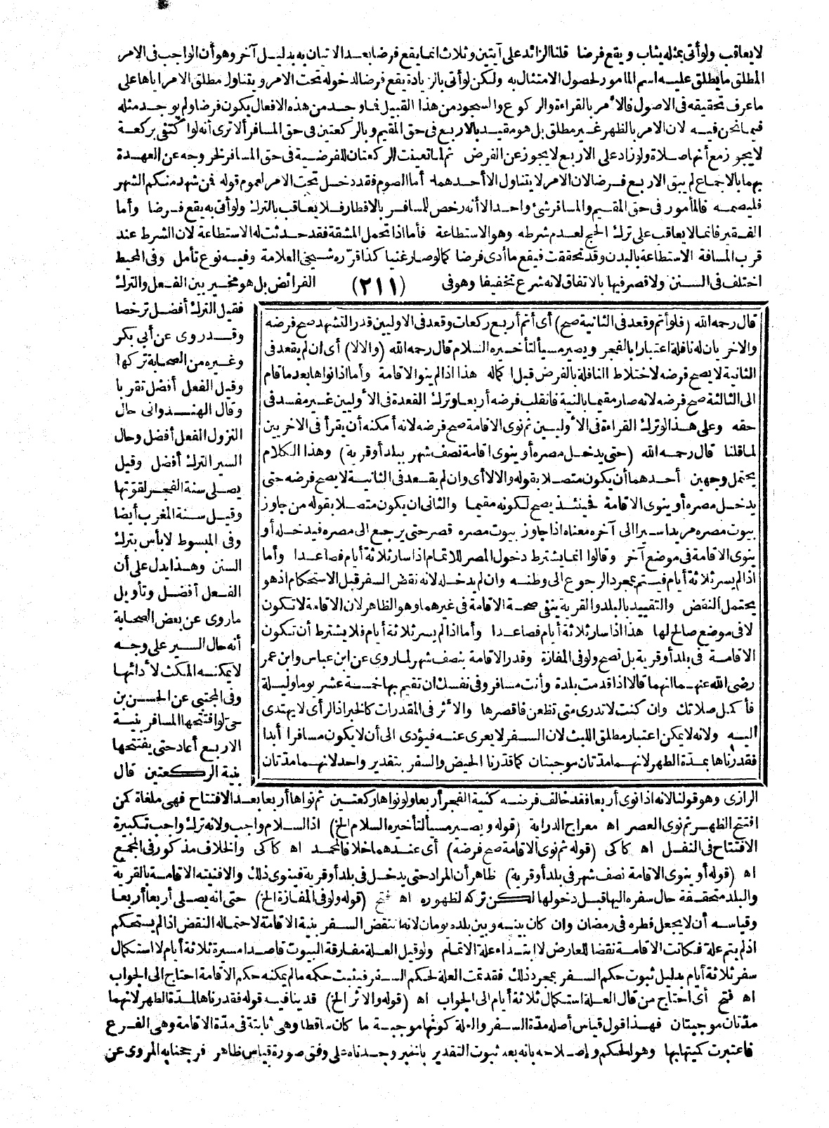 (قَوْلُهُ وَيَصِيرُ مُسِيئًا لِتَأْخِيرِهِ السَّلَامَ إلَخْ إذْ السَّلَامُ وَاجِبٌ وَلِأَنَّهُ تَرَكَ وَاجِبَ تَكْبِيرَةِ الِافْتِتَاحِ فِي النَّفْلِ. اهـ. كَاكِيٌّ (قَوْلُهُ ثُمَّ نَوَى الْإِقَامَةَ صَحَّ فَرْضُهُ) أَيْ عِنْدَهُمَا خِلَافًا لِمُحَمَّدٍ. اهـ. كَاكِيٌّ وَالْخِلَافُ مَذْكُورٌ فِي الْمَجْمَعِ. اهـ. (قَوْلُهُ أَوْ يَنْوِي الْإِقَامَةَ نِصْفَ شَهْرٍ فِي بَلَدٍ أَوْ قَرْيَةٍ) ظَاهِرٌ أَنَّ الْمُرَادَ حَتَّى يَدْخُلَ فِي بَلَدٍ أَوْ قَرْيَةٍ فَيَنْوِي ذَلِكَ وَإِلَّا فَنِيَّتُهُ الْإِقَامَةُ بِالْقَرْيَةِ وَالْبَلَدِ مُتَحَقِّقَةٌ حَالَ سَفَرِهِ إلَيْهَا قَبْلَ دُخُولِهَا لَكِنْ تَرَكَهُ لِظُهُورِهِ. اهـ. فَتْحٌ (قَوْلُهُ وَلَوْ فِي الْمَفَازَةِ إلَخْ) حَتَّى إنَّهُ يُصَلِّي أَرْبَعًا أَرْبَعًا وَقِيَاسُهُ أَنْ لَا يَجْعَلَ فِطْرَهُ فِي رَمَضَانَ، وَإِنْ كَانَ بَيْنَهُ وَبَيْنَ بَلَدِهِ يَوْمَانِ؛ لِأَنَّهُ انْتَقَضَ السَّفَرُ بِنِيَّةِ الْإِقَامَةِ لِاحْتِمَالِهِ النَّقْضَ إذَا لَمْ يَسْتَحْكِمْ إذْ لَمْ يَتِمَّ عِلَّةً فَكَانَتْ الْإِقَامَةُ نَقْضًا لِلْعَارِضِ لَا ابْتِدَاءَ عِلَّةِ الْإِتْمَامِ، وَلَوْ قِيلَ الْعِلَّةُ مُفَارَقَةُ الْبُيُوتِ قَاصِدًا مَسِيرَةَ ثَلَاثَةِ أَيَّامٍ لَا اسْتِكْمَالَ سَفَرِ ثَلَاثَةِ أَيَّامٍ بِدَلِيلِ ثُبُوتِ حُكْمِ السَّفَرِ بِمُجَرَّدِ ذَلِكَ فَقَدْ تَمَّتْ الْعِلَّةُ لِحُكْمِ السَّفَرِ فَيَثْبُتُ حُكْمُهُ مَا لَمْ يُمْكِنْهُ حُكْمُ الْإِقَامَةِ احْتَاجَ إلَى الْجَوَابِ. اهـ. فَتْحٌ أَيْ احْتَاجَ مَنْ قَالَ: الْعِلَّةُ اسْتِكْمَالُ ثَلَاثَةِ أَيَّامٍ إلَى الْجَوَابِ. اهـ. (قَوْلُهُ وَالْأَثَرُ إلَخْ) قَدْ يُنَافِيهِ قَوْلُهُ فَقَدَّرْنَاهَا لِمُدَّةِ الطُّهْرِ؛ لِأَنَّهُمَا مُدَّتَانِ مُوجِبَتَانِ فَهَذَا قَوْلٌ قِيَاسٌ أَصْلُهُ مُدَّةُ السَّفَرِ، وَالْعِلَّةُ كَوْنُهَا مُوجِبَةَ مَا كَانَ سَاقِطًا وَهِيَ ثَابِتَةٌ فِي مُدَّةِ الْإِقَامَةِ وَهِيَ الْفَرْعُ فَاعْتُبِرَتْ كَمِّيَّتُهَا بِهَا، وَهُوَ الْحُكْمُ وَإِصْلَاحُهُ بِأَنَّهُ بَعْدَ ثُبُوتِ التَّقْدِيرِ بِالْخَبَرِ وَجَدْنَاهُ عَلَى وَفْقِ صُورَةِ قِيَاسٍ ظَاهِرٍ فَرَجَّحْنَا بِهِ الْمَرْوِيَّ عَنْ