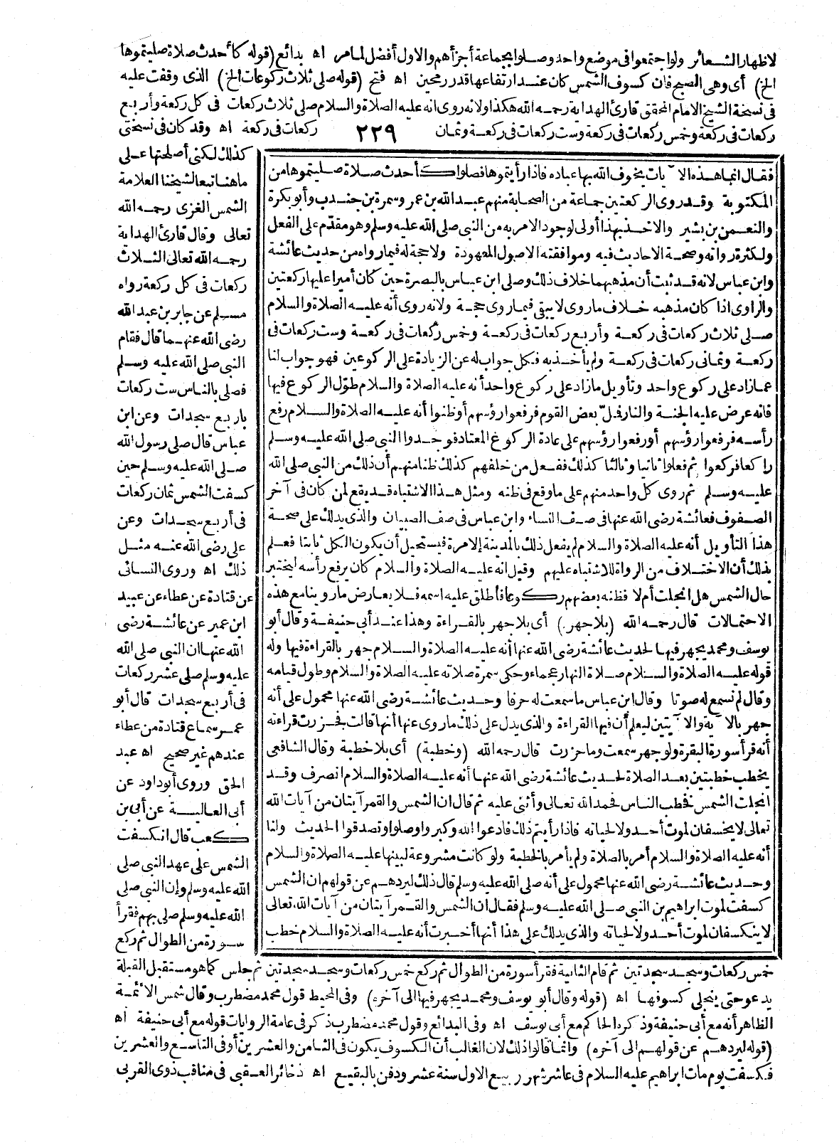 فَقَالَ إنَّمَا هَذِهِ الْآيَاتُ يُخَوِّفُ اللَّهُ بِهَا عِبَادَهُ فَإِذَا رَأَيْتُمُوهَا فَصَلُّوا كَأَحْدَثِ صَلَاةٍ صَلَّيْتُمُوهَا مِنْ الْمَكْتُوبَةِ»، وَقَدْ رَوَى الرَّكْعَتَيْنِ جَمَاعَةٌ مِنْ الصَّحَابَةِ مِنْهُمْ عَبْدُ اللَّهِ بْنُ عُمَرَ وَسَمُرَةُ بْنُ جُنْدُبٍ، وَأَبُو بَكْرَةَ وَالنُّعْمَانُ بْنُ بَشِيرٍ وَالْأَخْذُ بِهَذَا أَوْلَى لِوُجُودِ الْأَمْرِ بِهِ مِنْ النَّبِيِّ - صَلَّى اللَّهُ عَلَيْهِ وَسَلَّمَ - وَهُوَ مُقَدَّمٌ عَلَى الْفِعْلِ وَلِكَثْرَةِ رُوَاتِهِ وَصِحَّةِ الْأَحَادِيثِ فِيهِ وَمُوَافَقَتِهِ الْأُصُولَ الْمَعْهُودَةَ، وَلَا حُجَّةَ لَهُ فِيمَا رَوَاهُ مِنْ حَدِيثِ عَائِشَةَ وَابْنِ عَبَّاسٍ؛ لِأَنَّهُ قَدْ ثَبَتَ أَنَّ مَذْهَبَهُمَا خِلَافُ ذَلِكَ وَصَلَّى ابْنُ عَبَّاسٍ بِالْبَصْرَةِ حِينَ كَانَ أَمِيرًا عَلَيْهَا رَكْعَتَيْنِ وَالرَّاوِي إذَا كَانَ مَذْهَبُهُ خِلَافَ مَا رَوَى لَا يَبْقَى فِيمَا رَوَى حُجَّةٌ؛ وَلِأَنَّهُ رُوِيَ «أَنَّهُ - عَلَيْهِ الصَّلَاةُ وَالسَّلَامُ - صَلَّى ثَلَاثَ رَكَعَاتٍ فِي رَكْعَةٍ، وَأَرْبَعَ رَكَعَاتٍ فِي رَكْعَةٍ وَخَمْسَ رَكَعَاتٍ فِي رَكْعَةٍ وَسِتَّ رَكَعَاتٍ فِي رَكْعَةٍ وَثَمَانِيَ رَكَعَاتٍ فِي رَكْعَةٍ»، وَلَمْ يَأْخُذْ بِهِ فَكُلُّ جَوَابٍ لَهُ عَنْ الزِّيَادَةِ عَلَى الرُّكُوعَيْنِ فَهُوَ جَوَابٌ لَنَا عَمَّا زَادَ عَلَى رُكُوعٍ وَاحِدٍ.