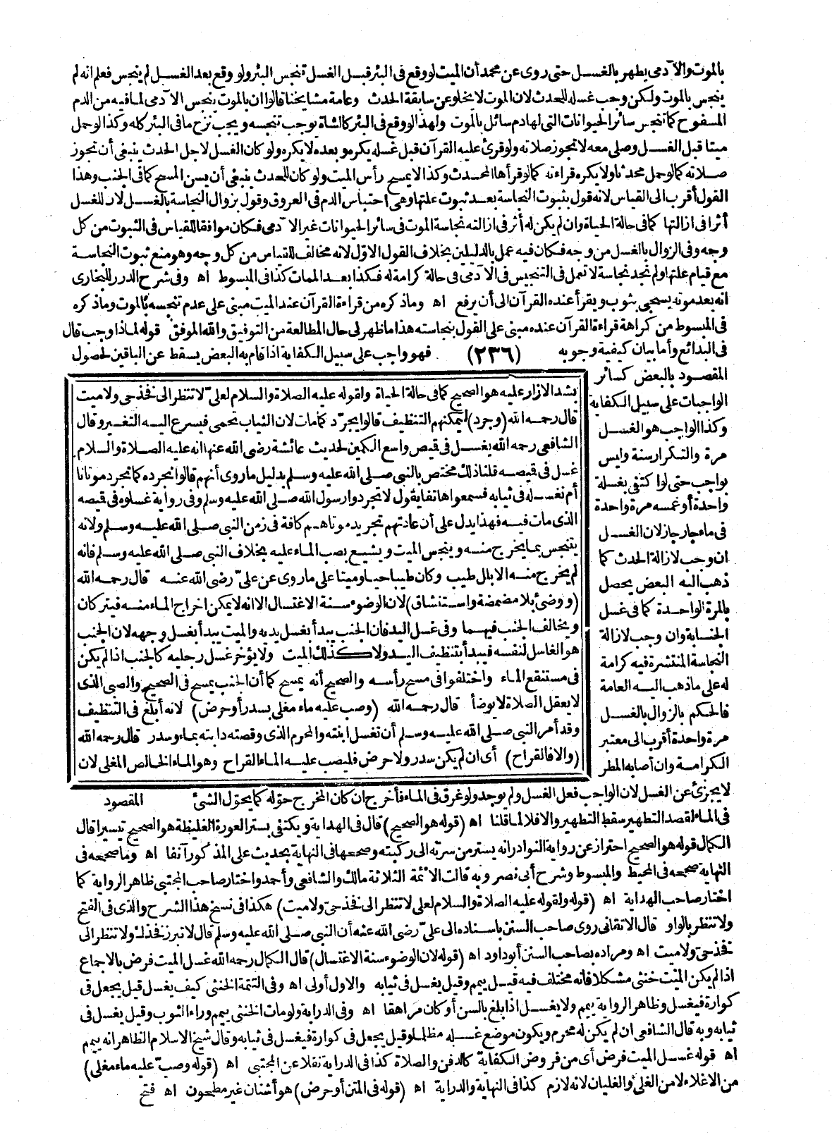 ـــــــــــــــــــــــــــــQبِالْمَوْتِ، الْآدَمِيُّ يَطْهُرُ بِالْغُسْلِ حَتَّى رُوِيَ عَنْ مُحَمَّدٍ أَنَّ الْمَيِّتَ لَوْ وَقَعَ فِي الْبِئْرِ قَبْلَ الْغُسْلِ تَنَجَّسَ الْبِئْرُ وَلَوْ وَقَعَ بَعْدَ الْغُسْلِ لَمْ يُنَجَّسْ فَعُلِمَ أَنَّهُ لَمْ يُنَجَّسْ بِالْمَوْتِ وَلَكِنْ وَجَبَ غُسْلُهُ لِلْحَدَثِ؛ لِأَنَّ الْمَوْتَ لَا يَخْلُو عَنْ سَابِقَةِ الْحَدَثِ، وَعَامَّةُ مَشَايِخِنَا قَالُوا: إنَّ بِالْمَوْتِ يُنَجَّسُ الْآدَمِيُّ لِمَا فِيهِ مِنْ الدَّمِ الْمَسْفُوحِ كَمَا تُنَجَّسُ سَائِرُ الْحَيَوَانَاتِ الَّتِي لَهَا دَمٌ سَائِلٌ بِالْمَوْتِ وَلِهَذَا لَوْ وَقَعَ فِي الْبِئْرِ كَالشَّاةِ يُوجِبُ تَنَجُّسَهُ وَيَجِبُ نَزْحُ مَا فِي الْبِئْرِ كُلِّهِ وَكَذَا لَوْ حَمَلَ مَيِّتًا قَبْلَ الْغُسْلِ وَصَلَّى مَعَهُ لَا تَجُوزُ صَلَاتُهُ، وَلَوْ قُرِئَ عَلَيْهِ الْقُرْآنُ قَبْلَ غُسْلِهِ يُكْرَهُ وَبَعْدَهُ لَا يُكْرَهُ، وَلَوْ كَانَ الْغُسْلُ لِأَجْلِ الْحَدَثِ يَنْبَغِي أَنْ تَجُوزَ صَلَاتُهُ كَمَا لَوْ حَمَلَ مُحْدِثًا، وَلَا يُكْرَهُ قِرَاءَتُهُ كَمَا لَوْ قَرَأَهَا الْمُحْدِثُ، وَكَذَا لَا يَمْسَحُ رَأْسَ الْمَيِّتِ وَلَوْ كَانَ لِلْحَدَثِ يَنْبَغِي أَنْ يُسَنَّ الْمَسْحُ كَمَا فِي الْجُنُبِ.