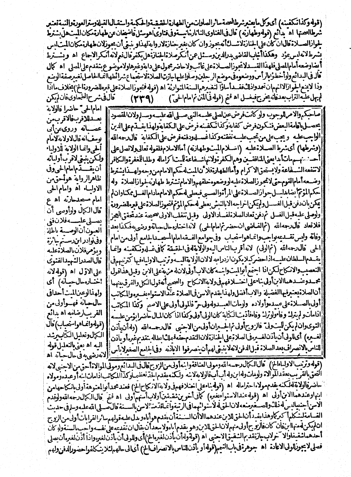 قَالَ - رَحِمَهُ اللَّهُ -: (وَشَرْطُهَا) أَيْ شَرْطُ الصَّلَاةِ عَلَيْهِ (إسْلَامُ الْمَيِّتِ وَطَهَارَتُهُ) أَمَّا الْإِسْلَامُ فَلِقَوْلِهِ تَعَالَى {وَلا تُصَلِّ عَلَى أَحَدٍ مِنْهُمْ مَاتَ أَبَدًا} [التوبة: 84] يَعْنِي الْمُنَافِقِينَ، وَهُمْ الْكَفَرَةُ؛ وَلِأَنَّهَا شَفَاعَةٌ لِلْمَيِّتِ إكْرَامًا لَهُ وَطَلَبًا لِلْمَغْفِرَةِ، وَالْكَافِرُ لَا تَنْفَعُهُ الشَّفَاعَةُ، وَلَا يَسْتَحِقُّ الْإِكْرَامَ، وَأَمَّا الطَّهَارَةُ فَلِأَنَّ الْمَيِّتَ لَهُ حُكْمُ الْإِمَامِ مِنْ وَجْهٍ وَلِهَذَا يُشْتَرَطُ وَضْعُهُ أَمَامَ الْقَوْمِ حَتَّى لَا تَجُوزُ الصَّلَاةُ عَلَيْهِ لَوْ وَضَعُوهُ خَلْفَهُمْ وَالْإِمَامُ تُشْتَرَطُ طَهَارَتُهُ لِجَوَازِ الصَّلَاةِ، وَلَهُ حُكْمُ الْمُؤْتَمِّ أَيْضًا بِدَلِيلِ جَوَازِ الصَّلَاةِ عَلَى الْمَرْأَةِ وَالصَّبِيِّ فَيُعْطَى لَهُ حُكْمُ الْإِمَامِ مَا دَامَ الْغُسْلُ مُمْكِنًا، وَإِنْ لَمْ يُمْكِنْ بِأَنْ دُفِنَ قَبْلَ الْغُسْلِ، وَلَمْ يُمْكِنْ إخْرَاجُهُ إلَّا بِالنَّبْشِ يُعْطَى لَهُ حُكْمُ الْمُؤْتَمِّ فَتَجُوزُ الصَّلَاةُ عَلَى قَبْرِهِ لِلضَّرُورَةِ، وَلَوْ صَلَّى عَلَيْهِ قَبْلَ الْغُسْلِ ثُمَّ دُفِنَ تُعَادُ الصَّلَاةُ لِفَسَادِ الْأُولَى، وَقِيلَ تَنْقَلِبُ الْأُولَى صَحِيحَةً عِنْدَ تَحَقُّقِ الْعَجْزِ فَلَا تُعَادُ، قَالَ - رَحِمَهُ اللَّهُ -: (ثُمَّ الْقَاضِي إنْ حَضَرَ ثُمَّ إمَامُ الْحَيِّ)؛ لِأَنَّهُ اخْتَارَهُ حَالَ حَيَاتِهِ وَرَضِيَ بِهِ فَكَذَا بَعْدَ وَفَاتِهِ، وَلَيْسَ تَقْدِيمُهُ بِوَاجِبٍ، وَإِنَّمَا هُوَ اسْتِحْبَابٌ، وَفِي جَوَامِعِ الْفِقْهِ إمَامُ الْمَسْجِدِ الْجَامِعِ أَوْلَى مِنْ إمَامِ الْحَيِّ قَالَ - رَحِمَهُ اللَّهُ - (ثُمَّ الْوَلِيُّ)؛ لِأَنَّهُ أَقْرَبُ النَّاسِ إلَيْهِ، وَالْوِلَايَةُ لَهُ فِي الْحَقِيقَةِ كَمَا فِي غُسْلِهِ وَتَكْفِينِهِ، وَإِنَّمَا يُقَدَّمُ السُّلْطَانُ عَلَيْهِ إذَا حَضَرَ كَيْ لَا يَكُونَ ازْدِرَاءٌ بِهِ لَا؛ لِأَنَّ الْوِلَايَةَ إلَيْهِ، وَتَرْتِيبُ الْأَوْلِيَاءِ فِيهَا كَتَرْتِيبِهِمْ فِي التَّعْصِيبِ وَالْإِنْكَاحِ لَكِنْ إذَا اجْتَمَعَ أَبُو الْمَيِّتِ وَابْنُهُ كَانَ الْأَبُ أَوْلَى؛ لِأَنَّ لَهُ مَزِيَّةٌ عَلَى الِابْنِ، وَقِيلَ هَذَا قَوْلُ مُحَمَّدٍ، وَعِنْدَهُمَا الِابْنُ أَوْلَى بِنَاءً عَلَى اخْتِلَافِهِمْ فِي وِلَايَةِ الْإِنْكَاحِ وَالصَّحِيحُ أَنَّهُ قَوْلُ الْكُلِّ، وَالْفَرْقُ بَيْنَهُمَا أَنَّ الصَّلَاةَ يُعْتَبَرُ فِيهَا الْفَضِيلَةُ، وَالْأَبُ أَفْضَلُ، وَلِهَذَا يُقَدَّمُ الْأَسَنُّ فِي الصَّلَاةِ عِنْدَ الِاسْتِوَاءِ بِغَيْرِهِ، وَالْمُكَاتَبُ أَوْلَى بِالصَّلَاةِ عَلَى عَبِيدِهِ وَأَوْلَادِهِ، وَلَوْ مَاتَ الْعَبْدُ، وَلَهُ وَلِيٌّ حُرٌّ فَالْمَوْلَى أَوْلَى عَلَى الْأَصَحِّ، وَكَذَا الْمُكَاتَبُ إذَا مَاتَ، وَلَمْ يَتْرُكْ وَفَاءً، وَلَوْ تَرَكَ وَفَاءً فَأُدِّيَتْ الْكِتَابَةُ كَانَ الْوَلِيُّ أَوْلَى، وَكَذَا إذَا كَانَ الْمَالُ حَاضِرًا يُؤْمَنُ عَلَيْهِ التَّوَى، وَإِنْ لَمْ يَكُنْ لِلْمَيِّتِ وَلِيٌّ فَالزَّوْجُ أَوْلَى ثُمَّ الْجِيرَانُ أَوْلَى مِنْ الْأَجْنَبِيِّ.