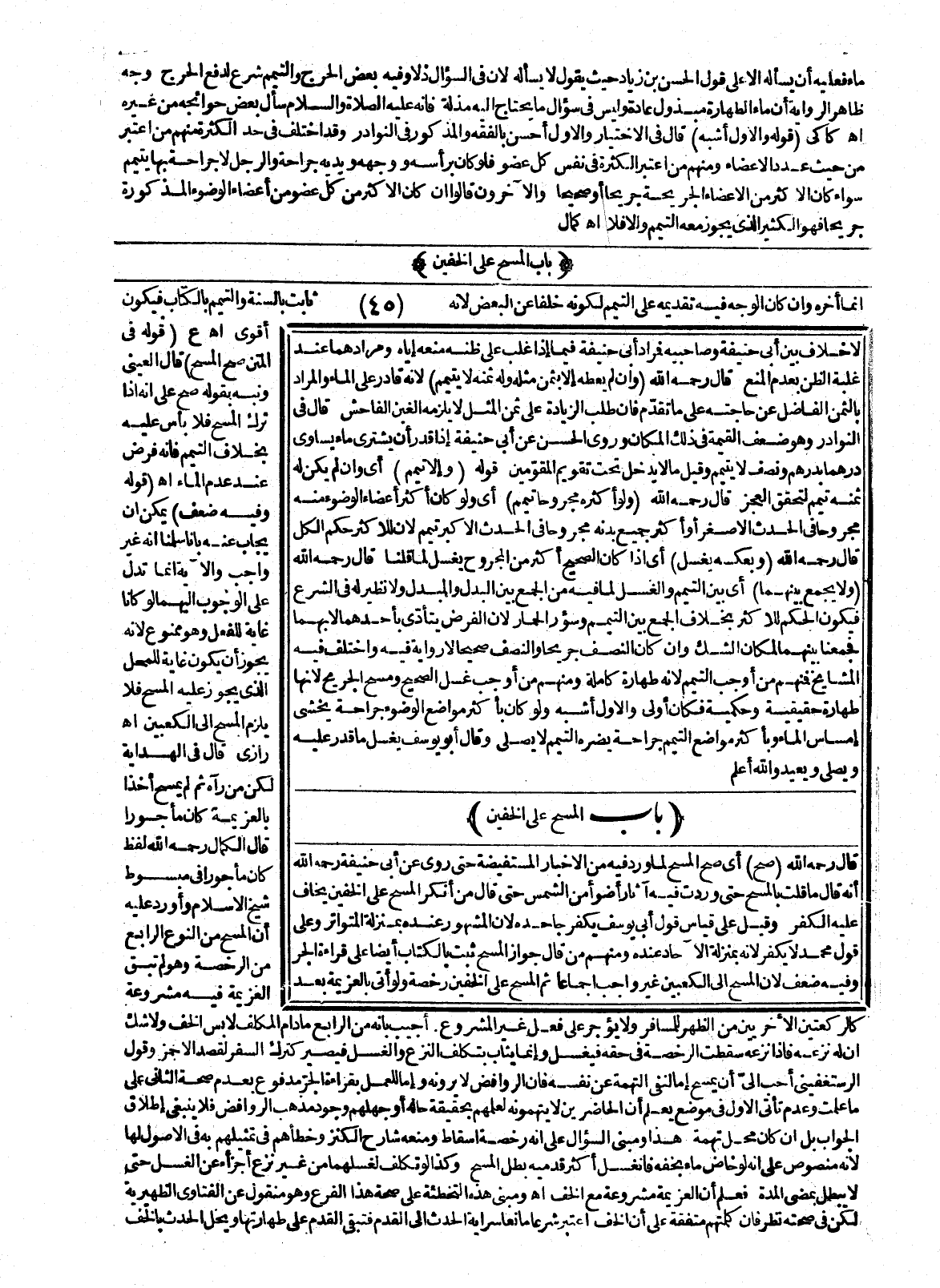 (بَابُ الْمَسْحِ عَلَى الْخُفَّيْنِ) قَالَ - رَحِمَهُ اللَّهُ - (صَحَّ) أَيْ صَحَّ الْمَسْحُ لِمَا وَرَدَ فِيهِ مِنْ الْأَخْبَارِ الْمُسْتَفِيضَةِ، حَتَّى رُوِيَ عَنْ أَبِي حَنِيفَةَ - رَحِمَهُ اللَّهُ - أَنَّهُ قَالَ: مَا قُلْت بِالْمَسْحِ حَتَّى وَرَدَتْ فِيهِ آثَارٌ أَضْوَأُ مِنْ الشَّمْسِ حَتَّى قَالَ مَنْ أَنْكَرَ الْمَسْحَ عَلَى الْخُفَّيْنِ يُخَافُ عَلَيْهِ الْكُفْرُ وَقِيلَ: عَلَى قِيَاسِ قَوْلِ أَبِي يُوسُفَ يُكَفَّرُ جَاحِدُهُ؛ لِأَنَّ الْمَشْهُورَ عِنْدَهُ بِمَنْزِلَةِ الْمُتَوَاتِرِ وَعَلَى قَوْلِ مُحَمَّدٍ لَا يُكَفَّرُ؛ لِأَنَّهُ بِمَنْزِلَةِ الْآحَادِ عِنْدَهُ، وَمِنْهُمْ مَنْ قَالَ: جَوَازُ الْمَسْحِ ثَبَتَ بِالْكِتَابِ أَيْضًا عَلَى قِرَاءَةِ الْجَرِّ وَفِيهِ ضَعْفٌ؛ لِأَنَّ الْمَسْحَ إلَى الْكَعْبَيْنِ غَيْرُ وَاجِبٍ إجْمَاعًا، ثُمَّ الْمَسْحُ عَلَى الْخُفَّيْنِ رُخْصَةٌ وَلَوْ أَتَى بِالْعَزِيمَةِ بَعْدَ