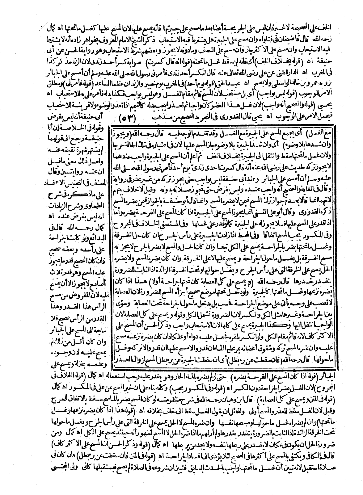 قَالَ - رَحِمَهُ اللَّهُ - (وَيَمْسَحُ عَلَى كُلِّ الْعِصَابَةِ كَانَ تَحْتَهَا جِرَاحَةٌ أَوْ لَا) هَذَا إذَا كَانَ يَضُرُّهُ نَزْعُهَا وَغَسْلُ مَا تَحْتَهَا كَالْجَبِيرَةِ وَلَوْ دَخَلَ تَحْتَهَا مَوْضِعٌ صَحِيحٌ أَجْزَأَهُ الْمَسْحُ لِلضَّرُورَةِ؛ لِأَنَّ الْعِصَابَةَ لَا تُعْصَبُ عَلَى وَجْهٍ يَأْتِي عَلَى مَوْضِعِ الْجِرَاحَةِ فَحَسْبُ بَلْ يَدْخُلُ مَا حَوْلَ الْجِرَاحَةِ تَحْتَ الْعِصَابَةِ وَسَوَّى بَيْنَ الْجِرَاحَةِ وَغَيْرِهَا مِثْلَ الْكَيِّ وَالْكَسْرِ؛ لِأَنَّ الضَّرُورَةَ تَشْمَلُ الْكُلَّ وَقَوْلُهُ وَيَمْسَحُ عَلَى كُلِّ الْعِصَابَةِ؛ لِأَنَّ الْوَاجِبَ انْتَقَلَ إلَيْهَا، وَكَذَا الْجَبِيرَةُ يَمْسَحُ عَلَى كُلِّهَا؛ لِأَنَّ الِاسْتِيعَابَ وَاجِبٌ وَذَكَرَ الْحَسَنُ أَنَّ الْمَسْحَ عَلَى الْأَكْثَرِ كَافٍ؛ لِأَنَّهُ قَائِمٌ مَقَامَ الْكُلِّ وَلَوْ انْكَسَرَ ظُفُرُهُ فَجَعَلَ عَلَيْهِ دَوَاءً أَوْ عِلْكًا فَإِنْ كَانَ يَضُرُّهُ نَزْعُهُ مَسَحَ عَلَيْهِ وَإِنْ ضَرَّهُ الْمَسْحُ تَرَكَهُ وَشُقُوقُ أَعْضَائِهِ يَمُرُّ عَلَيْهَا الْمَاءَ إنْ قَدَرَ، وَإِلَّا مَسَحَ عَلَيْهَا إنْ قَدَرَ، وَإِلَّا تَرَكَهُ وَغَسَلَ مَا حَوْلَهَا قَالَ - رَحِمَهُ اللَّهُ -.
