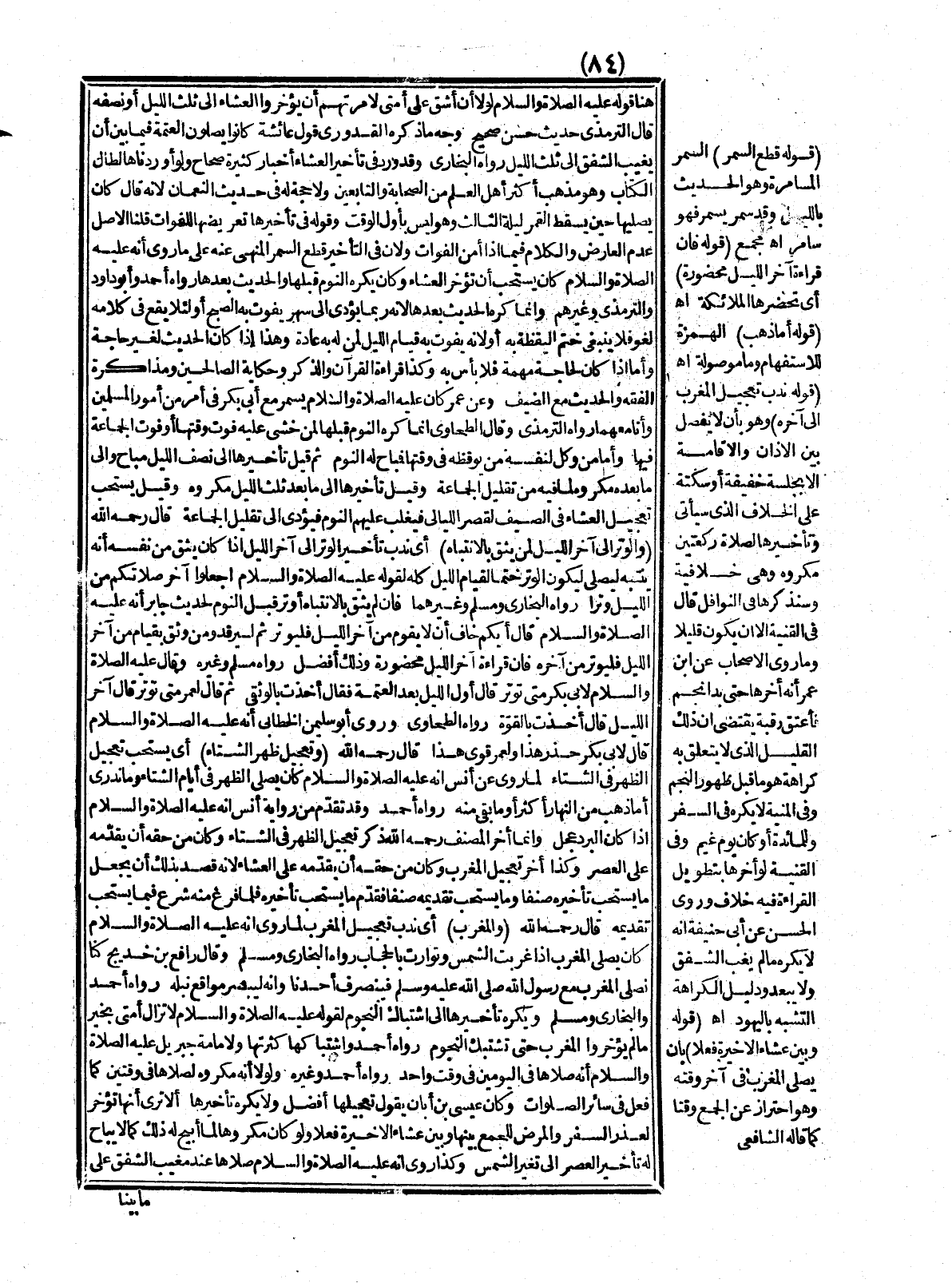 هُنَا قَوْلُهُ - عَلَيْهِ الصَّلَاةُ وَالسَّلَامُ - «لَوْلَا أَنْ أَشُقَّ عَلَى أُمَّتِي لَأَمَرْتهمْ أَنْ يُؤَخِّرُوا الْعِشَاءَ إلَى ثُلُثِ اللَّيْلِ أَوْ نِصْفِهِ» قَالَ التِّرْمِذِيُّ حَدِيثٌ حَسَنٌ صَحِيحٌ وَجْهُ مَا ذَكَرَهُ الْقُدُورِيُّ قَوْلُ عَائِشَةَ «كَانُوا يُصَلُّونَ الْعَتَمَةَ فِيمَا بَيْنَ أَنْ يَغِيبَ الشَّفَقُ إلَى ثُلُثِ اللَّيْلِ» رَوَاهُ الْبُخَارِيُّ وَقَدْ وَرَدَ فِي تَأْخِيرِ الْعِشَاءِ أَخْبَارٌ كَثِيرَةٌ صِحَاحٌ وَلَوْ أَوْرَدْنَاهَا لَطَالَ الْكِتَابُ وَهُوَ مَذْهَبُ أَكْثَرِ أَهْلِ الْعِلْمِ مِنْ الصَّحَابَةِ وَالتَّابِعِينَ وَلَا حُجَّةَ لَهُ فِي حَدِيثِ النُّعْمَانِ؛ لِأَنَّهُ قَالَ كَانَ يُصَلِّيهَا حِينَ يَسْقُطُ الْقَمَرُ لَيْلَةَ الثَّالِثِ وَهُوَ لَيْسَ بِأَوَّلِ الْوَقْتِ وَقَوْلُهُ فِي تَأْخِيرِهَا تَعْرِيضُهَا لِلْفَوَاتِ قُلْنَا الْأَصْلُ عَدَمُ الْعَارِضِ وَالْكَلَامُ فِيمَا إذَا أَمِنَ الْفَوَاتَ؛ وَلِأَنَّ فِي التَّأْخِيرِ قَطْعَ السَّمَرِ الْمَنْهِيِّ عَنْهُ عَلَى مَا رُوِيَ «أَنَّهُ - عَلَيْهِ الصَّلَاةُ وَالسَّلَامُ - كَانَ يَسْتَحِبُّ أَنْ تُؤَخَّرَ الْعِشَاءُ وَكَانَ يَكْرَهُ النَّوْمَ قَبْلَهَا» وَالْحَدِيثُ بَعْدَهَا رَوَاهُ أَحْمَدُ وَأَبُو دَاوُد وَالتِّرْمِذِيُّ وَغَيْرُهُمْ وَإِنَّمَا كَرِهَ الْحَدِيثَ بَعْدَهَا؛ لِأَنَّهُ رُبَّمَا يُؤَدِّي إلَى سَهَرٍ يَفُوتُ بِهِ الصُّبْحُ أَوْ لِئَلَّا يَقَعَ فِي كَلَامِهِ لَغْوٌ فَلَا يَنْبَغِي خَتْمُ الْيَقَظَةِ بِهِ أَوْ لِأَنَّهُ يَفُوتُ بِهِ قِيَامُ اللَّيْلِ لِمَنْ لَهُ بِهِ عَادَةٌ وَهَذَا إذَا كَانَ الْحَدِيثُ لِغَيْرِ حَاجَةٍ، وَأَمَّا إذَا كَانَ لِحَاجَةٍ مُهِمَّةٍ فَلَا بَأْسَ بِهِ، وَكَذَا قِرَاءَةُ الْقُرْآنِ وَالذِّكْرُ وَحِكَايَةُ الصَّالِحِينَ وَمُذَاكَرَةُ الْفِقْهِ وَالْحَدِيثُ مَعَ الضَّيْفِ وَعَنْ عُمَرَ «كَانَ - عَلَيْهِ الصَّلَاةُ وَالسَّلَامُ - يَسْمَرُ مَعَ أَبِي بَكْرٍ فِي أَمْرٍ مِنْ أُمُورِ الْمُسْلِمِينَ وَأَنَا مَعَهُمَا» رَوَاهُ التِّرْمِذِيُّ وَقَالَ الطَّحَاوِيُّ إنَّمَا كَرِهَ النَّوْمَ قَبْلَهَا لِمَنْ خَشَى عَلَيْهِ فَوْتَ وَقْتِهَا أَوْ فَوْتَ الْجَمَاعَةِ فِيهَا، وَأَمَّا مَنْ وَكَّلَ لِنَفْسِهِ مَنْ يُوقِظُهُ فِي وَقْتِهَا فَمُبَاحٌ لَهُ النَّوْمُ، ثُمَّ قِيلَ تَأْخِيرُهَا إلَى نِصْفِ اللَّيْلِ مُبَاحٌ وَإِلَى مَا بَعْدَهُ مَكْرُوهٌ لِمَا فِيهِ مِنْ تَقْلِيلِ الْجَمَاعَةِ وَقِيلَ تَأْخِيرُهَا إلَى مَا بَعْدَ ثُلُثِ اللَّيْلِ مَكْرُوهٌ وَقِيلَ يُسْتَحَبُّ تَعْجِيلُ الْعِشَاءِ فِي الصَّيْفِ لِقِصَرِ اللَّيَالِي فَيَغْلِبُ عَلَيْهِمْ النَّوْمُ فَيُؤَدِّي إلَى تَقْلِيلِ الْجَمَاعَةِ.