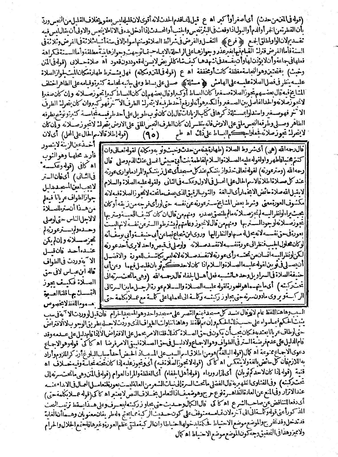 قَوْلُهُ فِي الْمَتْنِ: مِنْ حَدَثٍ) أَيْ أَصْغَرَ أَوْ أَكْبَرَ اهـ ع قِيلَ: إنَّمَا قَدَّمَ الْحَدَثَ لِأَنَّهُ أَقْوَى؛ لِأَنَّ قَلِيلَهُ لَيْسَ بِعَفْوٍ بِخِلَافِ الْقَلِيلِ مِنْ النَّجَسِ وَرُدَّ بِأَنَّ الْقَطْرَةَ مِنْ الْخَمْرِ أَوْ الدَّمِ أَوْ الْبَوْلِ إذَا وَقَعَتْ فِي الْبِئْرِ تَنَجَّسَ وَالْجُنُبُ أَوْ الْمُحْدِثُ إذَا أَدْخَلَ يَدَهُ فِي الْإِنَاءِ لَا يَنْجُسُ وَالْأَوْلَى أَنْ يُقَالَ لَيْسَ فِيهِ تَقْدِيمٌ؛ لِأَنَّ الْوَاوَ لِمُطْلَقِ الْجَمْعِ (فَرْعٌ) النَّفَلُ وَالْفَرْضُ فِي شَرَائِطِ الصَّلَاةِ وَسُنَنِهَا سَوَاءٌ إلَّا فِي سِتَّةِ أَشْيَاءَ ثَلَاثَةٍ فِي الْفَرْضِ وَثَلَاثَةٍ فِي السُّنَّةِ فَأَمَّا الْفَرْضُ فَتَرْكُ الْقِيَامِ فِيهَا بِغَيْرِ عُذْرٍ وَجَوَازُهَا عَلَى الرَّاحِلَةِ بِالْإِيمَاءِ حَيْثُمَا تَوَجَّهَتْ وَجَوَازُهَا بِنِيَّةٍ مُطْلَقَةٍ، وَأَمَّا السُّنَّةُ فَكَرَاهَةُ فِعْلِهَا فِي جَمَاعَةٍ وَأَنْ لَا يُؤَذِّنَ لَهَا وَأَنْ يَقْعُدَ فِي تَشَهُّدِهَا كَيْفَ شَاءَ كَالْمَرِيضِ لَا يُسَنُّ لَهُ قُعُودٌ دُونَ قُعُودٍ اهـ صَلَاةٌ جَلَّابِيٌّ (قَوْلُهُ فِي الْمَتْنِ: وَخَبَثٍ) بِفَتْحَتَيْنِ وَهُوَ النَّجَاسَةُ مُغَلَّظَةً كَانَتْ أَوْ مُخَفَّفَةً اهـ ع (قَوْلُهُ فِي الْمَتْنِ: وَمَكَانُهُ) فَهَلْ يُشْتَرَطُ طَهَارَةُ مَكَانِ الْمَيِّتِ لِجَوَازِ الصَّلَاةِ عَلَيْهِ يُنْظَرُ فِي فَصْلِ الصَّلَاةِ عَلَيْهِ عَلَى الْهَامِشِ.