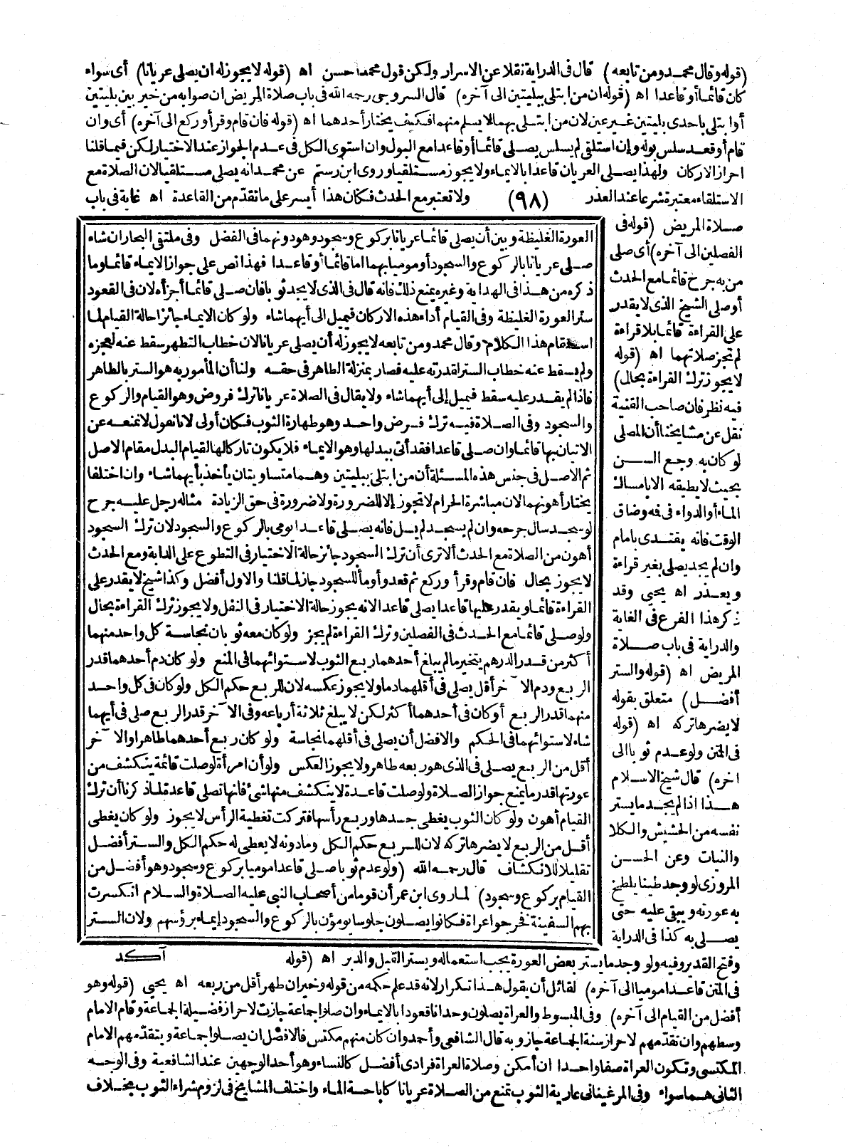 الْعَوْرَةِ الْغَلِيظَةِ وَبَيْنَ أَنْ يُصَلِّيَ قَائِمًا عُرْيَانًا بِرُكُوعٍ وَسُجُودٍ وَهُوَ دُونَهُمَا فِي الْفَضْلِ وَفِي مُلْتَقَى الْبِحَارِ إنْ شَاءَ صَلَّى عُرْيَانًا بِالرُّكُوعِ وَالسُّجُودِ أَوْ مُؤَمِّيًا بِهِمَا إمَّا قَائِمًا أَوْ قَاعِدًا فَهَذَا نَصٌّ عَلَى جَوَازِ الْإِيمَاءِ قَائِمًا وَمَا ذَكَرَهُ مِنْ هَذَا فِي الْهِدَايَةِ وَغَيْرِهِ يَمْنَعُ ذَلِكَ فَإِنَّهُ قَالَ فِي الَّذِي لَا يَجِدُ ثَوْبًا فَإِنْ صَلَّى قَائِمًا أَجْزَأَهُ؛ لِأَنَّ فِي الْقُعُودِ سَتْرَ الْعَوْرَةِ الْغَلِيظَةِ وَفِي الْقِيَامِ أَدَاءُ هَذِهِ الْأَرْكَانِ فَيَمِيلُ إلَى أَيِّهِمَا شَاءَ وَلَوْ كَانَ الْإِيمَاءُ جَائِزًا حَالَةَ الْقِيَامِ لَمَا اسْتَقَامَ هَذَا الْكَلَامُ. وَقَالَ مُحَمَّدٌ وَمَنْ تَابَعَهُ لَا يَجُوزُ لَهُ أَنْ يُصَلِّيَ عُرْيَانًا؛ لِأَنَّ خِطَابَ التَّطَهُّرِ سَقَطَ عَنْهُ لِعَجْزِهِ وَلَمْ يَسْقُطْ عَنْهُ خِطَابُ السَّتْرِ لِقُدْرَتِهِ عَلَيْهِ فَصَارَ بِمَنْزِلَةِ الطَّاهِرِ فِي حَقِّهِ وَلَنَا أَنَّ الْمَأْمُورَ بِهِ هُوَ السَّتْرُ بِالطَّاهِرِ فَإِذَا لَمْ يَقْدِرْ عَلَيْهِ سَقَطَ فَيَمِيلُ إلَى أَيِّهِمَا شَاءَ وَلَا يُقَالُ فِي الصَّلَاةِ عُرْيَانًا تَرْكُ فُرُوضٍ وَهُوَ الْقِيَامُ وَالرُّكُوعُ وَالسُّجُودُ وَفِي الصَّلَاةِ فِيهِ تَرْكُ فَرْضٍ وَاحِدٍ وَهُوَ طَهَارَةُ الثَّوْبِ فَكَانَ أَوْلَى؛ لِأَنَّا نَقُولُ لَا نَمْنَعُهُ عَنْ الْإِتْيَانِ بِهَا قَائِمًا وَإِنْ صَلَّى قَاعِدًا فَقَدْ أَتَى بِبَدَلِهَا وَهُوَ الْإِيمَاءُ فَلَا يَكُونُ تَارِكًا لَهَا لِقِيَامِ الْبَدَلِ مَقَامَ الْأَصْلِ، ثُمَّ الْأَصْلُ فِي جِنْسِ هَذِهِ الْمَسْأَلَةِ أَنَّ مَنْ ابْتَلَى بِبَلِيَّتَيْنِ وَهُمَا مُتَسَاوِيَتَانِ يَأْخُذُ بِأَيِّهِمَا شَاءَ وَإِنْ اخْتَلَفَا يَخْتَارُ أَهْوَنَهُمَا؛ لِأَنَّ مُبَاشَرَةَ الْحَرَامِ لَا تَجُوزُ إلَّا لِلضَّرُورَةِ وَلَا ضَرُورَةَ فِي حَقِّ الزِّيَادَةِ مِثَالُهُ رَجُلٌ عَلَيْهِ جُرْحٌ لَوْ سَجَدَ سَالَ جُرْحُهُ وَإِنْ لَمْ يَسْجُدْ لَمْ يَسِلْ فَإِنَّهُ يُصَلِّي قَاعِدًا يُومِئُ بِالرُّكُوعِ وَالسُّجُودِ؛ لِأَنَّ تَرْكَ السُّجُودِ أَهْوَنُ مِنْ الصَّلَاةِ مَعَ الْحَدَثِ، أَلَا تَرَى أَنَّ تَرْكَ السُّجُودِ جَائِزٌ حَالَةَ الِاخْتِيَارِ فِي التَّطَوُّعِ عَلَى الدَّابَّةِ وَمَعَ الْحَدَثِ لَا يَجُوزُ بِحَالٍ فَإِنْ قَامَ وَقَرَأَ وَرَكَعَ، ثُمَّ قَعَدَ وَأَوْمَأَ لِلسُّجُودِ جَازَ لِمَا قُلْنَا وَالْأَوَّلُ أَفْضَلُ.