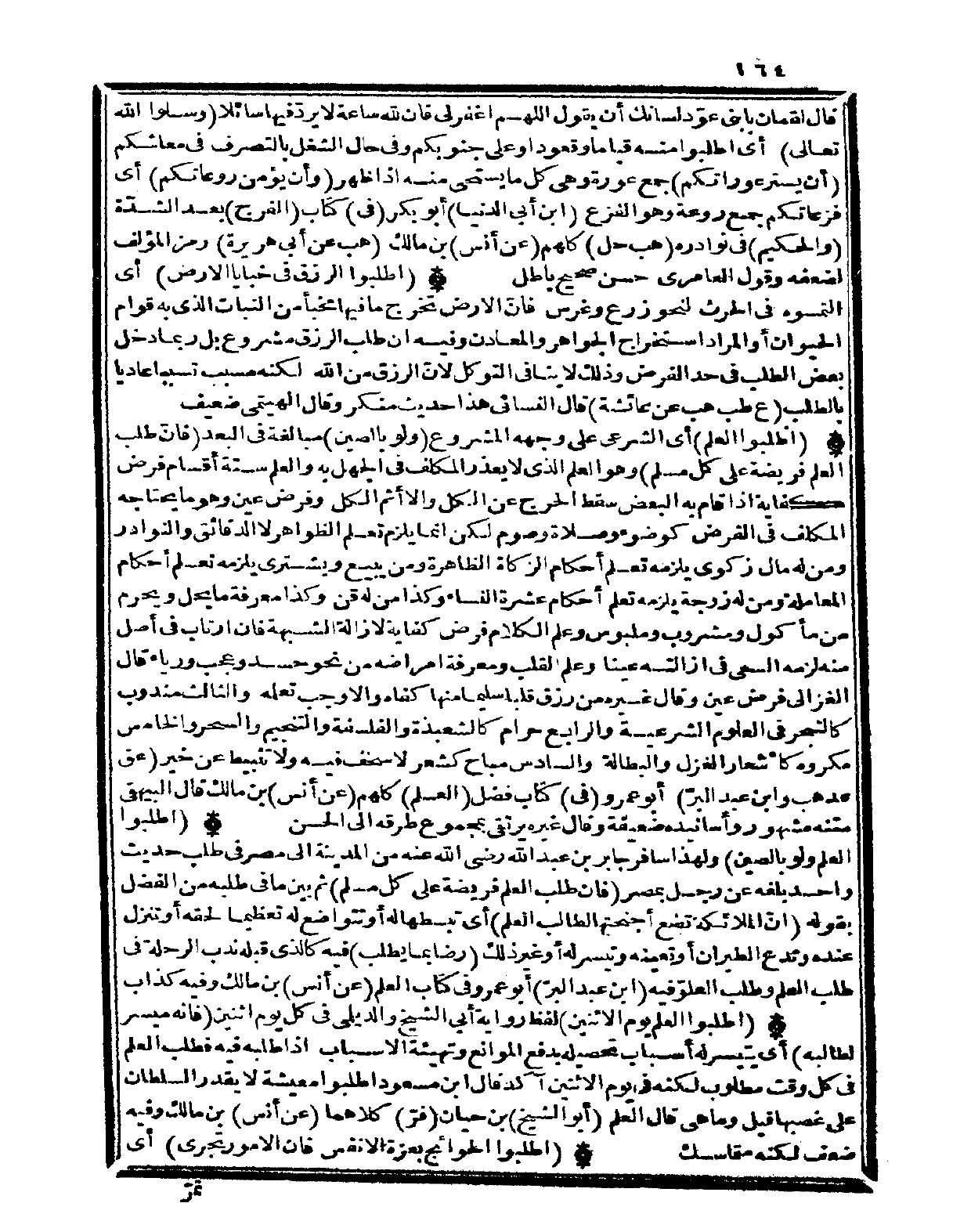(اطْلُبُوا الْعلم) أَي الشَّرْعِيّ عَليّ وَجهه الْمَشْرُوع (وَلَو بالصين) مُبَالغَة فِي الْبعد (فإنّ طلب الْعلم فَرِيضَة على كل مُسلم) وَهُوَ الْعلم الَّذِي لَا يعْذر الْمُكَلف فِي الْجَهْل بِهِ وَالْعلم سِتَّة أَقسَام فرض كِفَايَة إِذا قَامَ بِهِ الْبَعْض سقط الْحَرج عَن الْكل وَإِلَّا أَثم الْكل وَفرض عين وَهُوَ مَا يَحْتَاجهُ الْمُكَلف فِي الْفَرْض كوضوء وَصَلَاة وَصَوْم لَكِن إِنَّمَا يلْزم تعلم الظَّوَاهِر لَا الدقائق والنوادر وَمن لَهُ مَال زكوي يلْزمه تعلم أَحْكَام الزَّكَاة الظَّاهِرَة وَمن يَبِيع وَيَشْتَرِي يلْزمه تعلم أَحْكَام الْمُعَامَلَة وَمن لَهُ زَوْجَة يلْزمه تعلم أَحْكَام عشرَة النِّسَاء وَكَذَا من لَهُ قن وَكَذَا معرفَة مَا يحل وَيحرم من مَأْكُول ومشروب وملبوس وَعلم الْكَلَام فرض كِفَايَة لإِزَالَة الشُّبْهَة فَإِن ارتاب فِي أصل مِنْهُ لزمَه السَّعْي فِي إِزَالَته عينا وَعلم لقلب وَمَعْرِفَة أمراضه من نَحْو حسد وَعجب ورياء قَالَ الْغَزالِيّ فرض عين وَقَالَ غَيره من رزق قلبا سليما مِنْهَا كَفاهُ والأوجب تعلمه وَالثَّالِث مَنْدُوب كالتجر فِي الْعُلُوم الشَّرْعِيَّة وَالرَّابِع حرَام كالشعبذة والفلسفة والتنجيم وَالسحر وَالْخَامِس مَكْرُوه كأشعار الْغَزل والبطالة وَالسَّادِس مُبَاح كشعر لَا سخف فِيهِ وَلَا تثبيط عَن خير (عق عد هَب وَابْن عبد البرّ) أَبُو عَمْرو (فِي) كتاب فضل (الْعلم) كلهم (عَن أنس) بن مَالك قَالَ الْبَيْهَقِيّ مَتنه مَشْهُور وَأَسَانِيده ضَعِيفَة وَقَالَ غَيره يرتقي بِمَجْمُوع طرقه إِلَى الْحسن