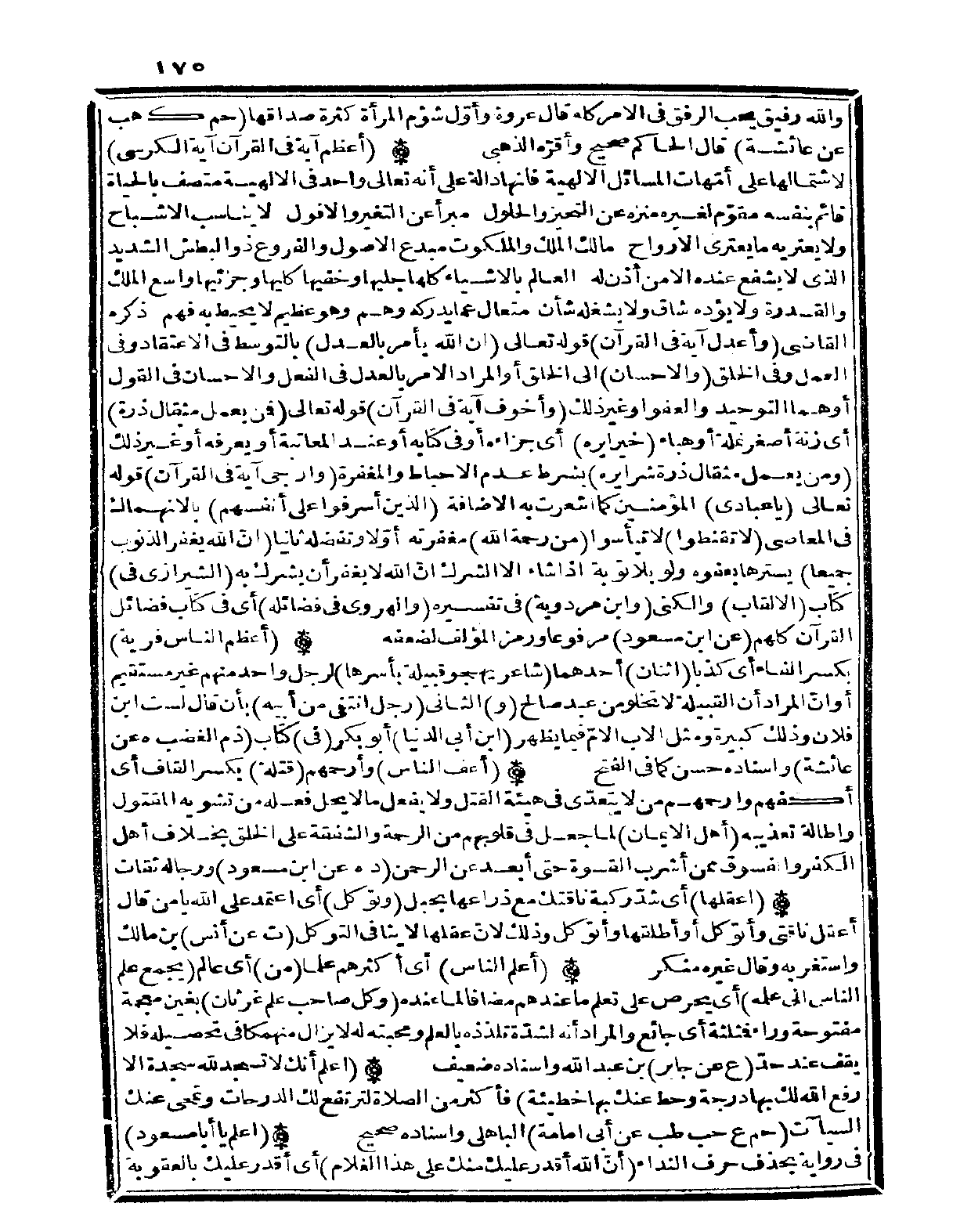 (أعظم آيَة فِي الْقُرْآن آيَة الْكُرْسِيّ) لاشتمالها على أمّهات الْمسَائِل الإلهية فَإِنَّهَا دَالَّة على أَنه تَعَالَى وَاحِد فِي الإلهية متصف بِالْحَيَاةِ قَائِم بِنَفسِهِ مقوّم لغيره منزه عَن التحيز والحلول مبرأ عَن التَّغَيُّر والأفول لَا يُنَاسب الأشباح وَلَا يَعْتَرِيه مَا يعتري الْأَرْوَاح مَالك الْملك والملكوت مبدع الْأُصُول وَالْفُرُوع ذُو الْبَطْش الشَّديد الَّذِي لَا يشفع عِنْده إِلَّا من أذن لَهُ الْعَالم بالأشياء كلهَا جليها أَو خفيها كليها وجزئيها وَاسع الْملك وَالْقُدْرَة وَلَا يؤده شاق وَلَا يشْغلهُ شَأْن متعال عَمَّا يُدْرِكهُ وهم وَهُوَ عَظِيم لَا يُحِيط بِهِ فهم ذكره القَاضِي (وَأَعْدل آيَة فِي الْقُرْآن) قَوْله تَعَالَى (إِن الله يَأْمر بِالْعَدْلِ) بالتوسط فِي الِاعْتِقَاد وَفِي الْعَمَل وَفِي الْخلق (وَالْإِحْسَان) إِلَى الْخلق أَو المُرَاد الْأَمر بِالْعَدْلِ فِي الْفِعْل وَالْإِحْسَان فِي القَوْل أَو هما التَّوْحِيد وَالْعَفو أَو غير ذَلِك (وأخوف آيَة فِي الْقُرْآن) قَوْله تَعَالَى {فَمن يعْمل مِثْقَال ذرة} أَي زنة أَصْغَر نملة أَو هباء (خيرا يره) أى جزاءه أَو فِي كِتَابه أَو عِنْد المعاتبة أَو يعرفهُ أَو غير ذَلِك (وَمن يعْمل مِثْقَال ذرة شرا يره) بِشَرْط عدم الإحباط وَالْمَغْفِرَة (وأرجى آيَة فِي الْقُرْآن) قَوْله تَعَالَى (يَا عبَادي) الْمُؤمنِينَ كَمَا أشعرت بِهِ الْإِضَافَة (الَّذين أَسْرفُوا على أنفسهم) بالانهماك فِي الْمعاصِي (لَا تقنطوا) لَا تيأسوا (من رَحْمَة الله) مغفرته أوّلا وتفضله ثَانِيًا (أنّ الله يغْفر الذُّنُوب جَمِيعًا) يَسْتُرهَا بعفوه وَلَو بِلَا تَوْبَة إِذا شَاءَ إِلَّا الشّرك أنّ الله لَا يغْفر أَن يُشْرك بِهِ (الشِّيرَازِيّ فِي) كتاب (الألقاب) والكنى (وَابْن مردوية) فِي تَفْسِيره (والهروي فِي فضائله) أَي فِي كتاب فَضَائِل الْقُرْآن كلهم (عَن ابْن مَسْعُود) مَرْفُوعا ورمز الْمُؤلف لضَعْفه