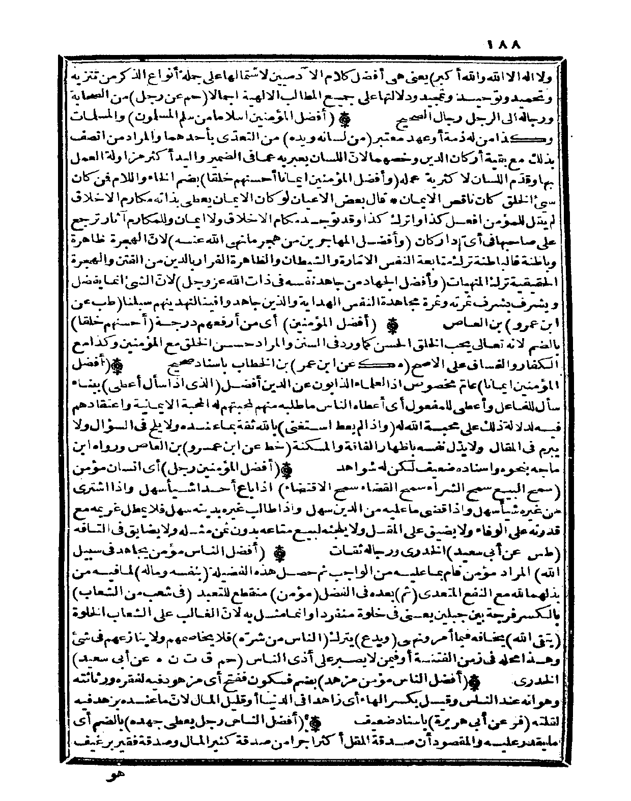(أفضل الْمُؤمنِينَ إسلاما من سلم الْمُسلمُونَ) وَالْمُسلمَات وَكَذَا من لَهُ ذمَّة أَو عهد مُعْتَبر (من لِسَانه وَيَده) من التعدّي بِأَحَدِهِمَا وَالْمرَاد من اتّصف بذلك مَعَ بَقِيَّة أَرْكَان الدّين وخصهما لأنّ اللِّسَان يعبر بِهِ عَمَّا فِي الضَّمِير وَالْيَد أَكثر مزاولة الْعَمَل بهَا وقدّم اللِّسَان لأكثرية عمله (وَأفضل الْمُؤمنِينَ إِيمَانًا أحْسنهم خلقا) بِضَم الْخَاء وَاللَّام فَمن كَانَ سيء الْخلق كَانَ نَاقص الْإِيمَان قَالَ بعض الْأَعْيَان لَو كَانَ الْإِيمَان يُعْطي بِذَاتِهِ مَكَارِم الْأَخْلَاق لم يقل لِلْمُؤمنِ افْعَل كَذَا واترك كَذَا وَقد تُوجد مكام الْأَخْلَاق وَلَا إِيمَان وللمكارم آثَار ترجع على صَاحبهَا فِي أَي دَار كَانَ (وَأفضل الْمُهَاجِرين من هجر مَا نهى الله عَنهُ) لأنّ الْهِجْرَة ظَاهِرَة وباطنة فالباطنة ترك مُتَابعَة النَّفس الأمّارة والشيطان وَالظَّاهِرَة الْفِرَار بِالدّينِ من الْفِتَن وَالْهجْرَة الْحَقِيقَة ترك المنهيات (وَأفضل الْجِهَاد من جَاهد نَفسه فِي ذَات الله عز وَجل) لأنّ الشَّيْء إِنَّمَا يفضل ويشرف بشرف ثَمَرَته وَثَمَرَة مجاهدة النَّفس الْهِدَايَة وَالَّذين جاهدوا فِينَا لنهدينهم سبلنا (طب عَن ابْن عَمْرو) بن الْعَاصِ